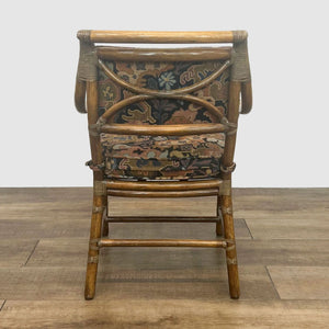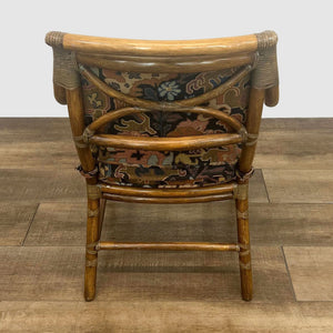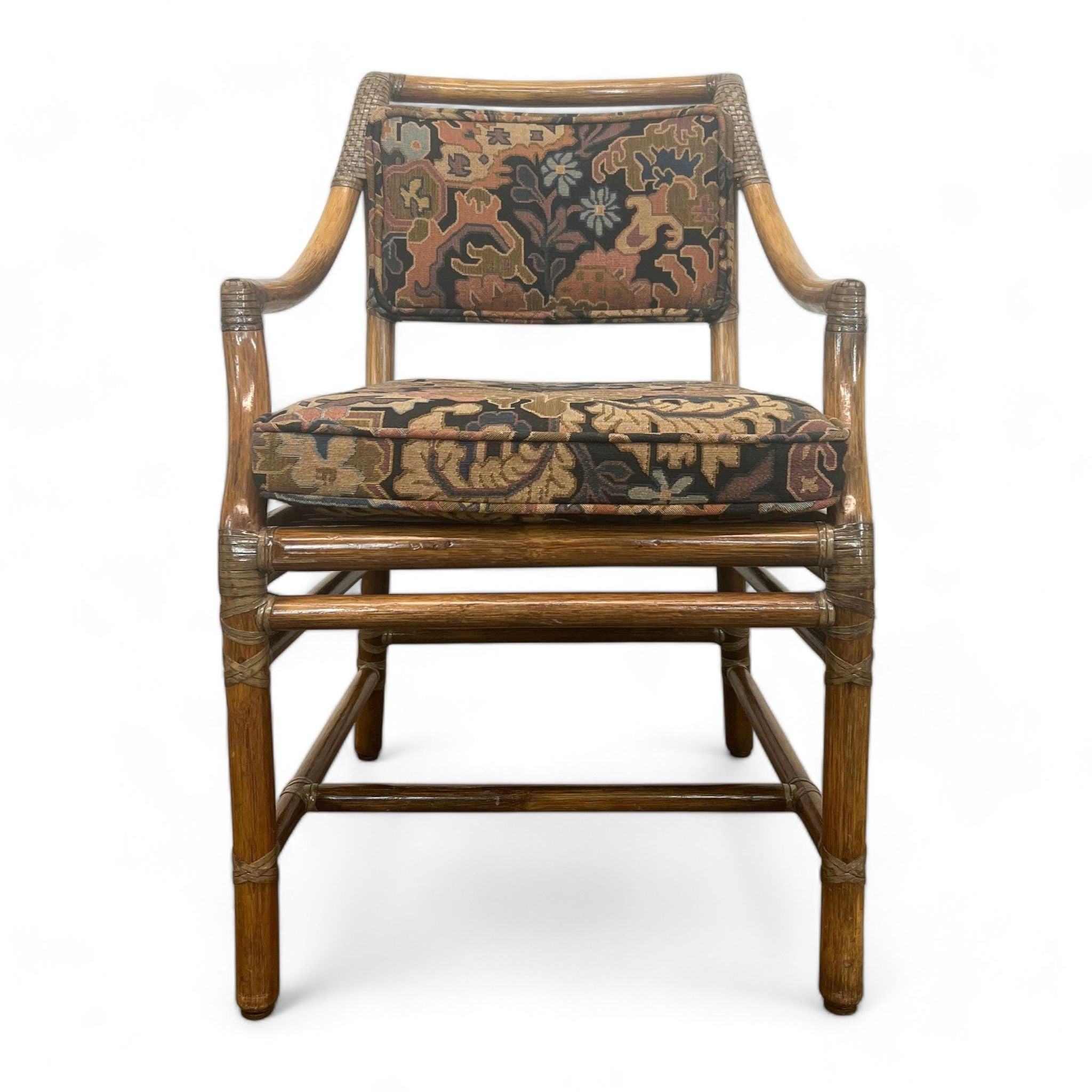 This vintage dining armchair by McGuire features a bamboo frame with woven hide. The back is cushioned and upholstered with a matching removable seat cushion.