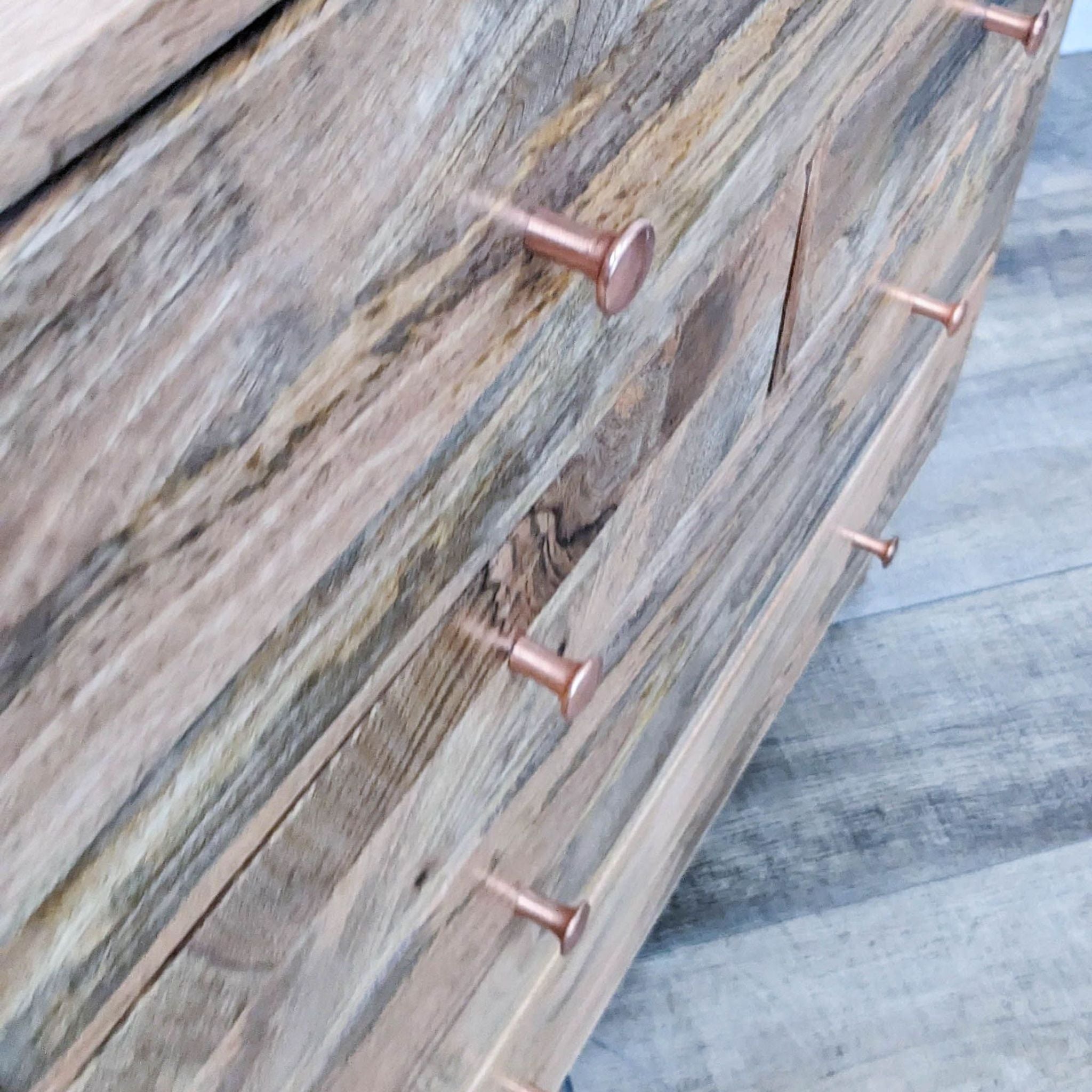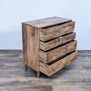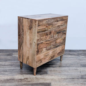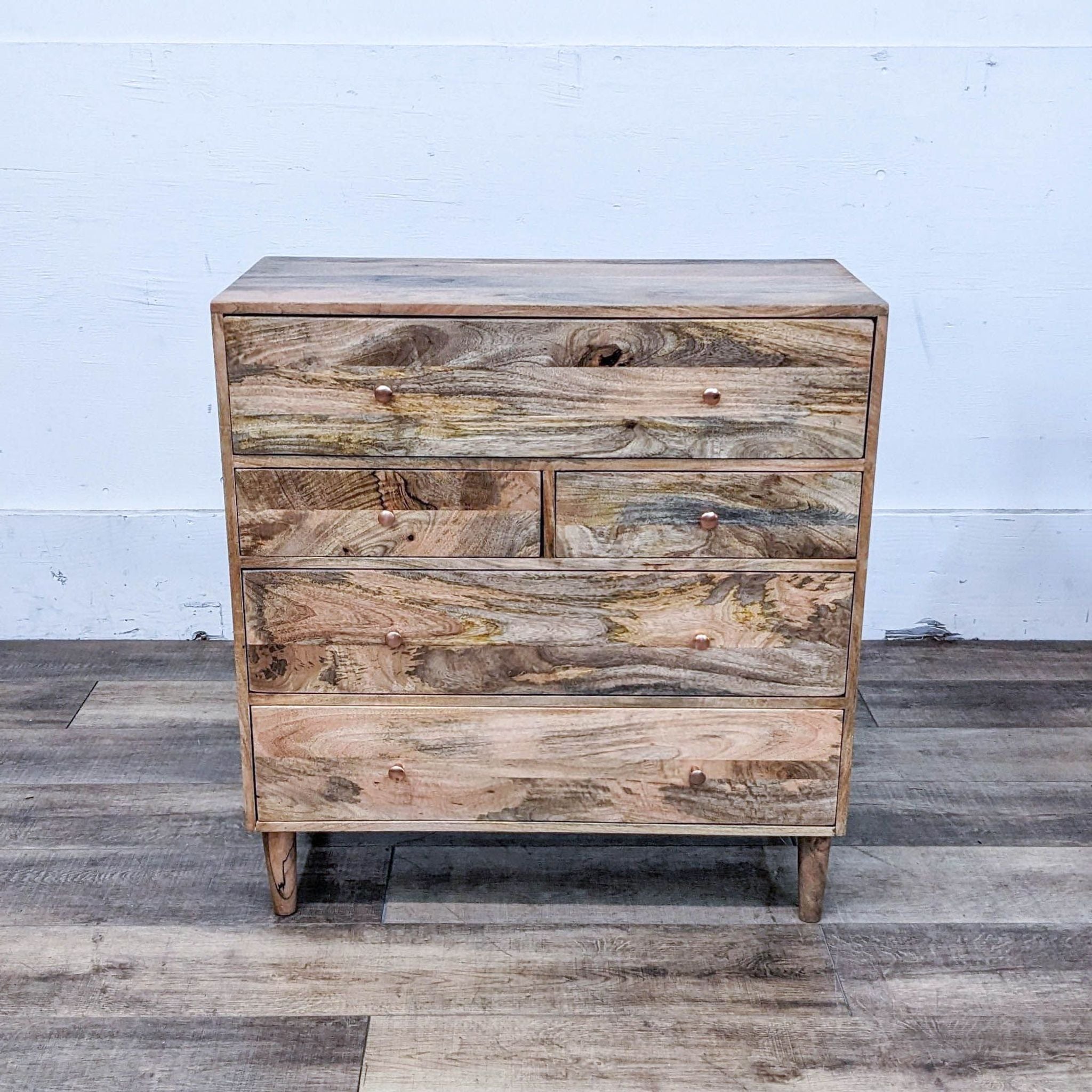 The Reagan dresser by Urban Outfitters is a 5-drawer dresser made from natural mango wood in a finish that showcases the unique wood grain of every piece. Minimalist build features three larger drawers and two smaller drawers and is finished with tapered legs.