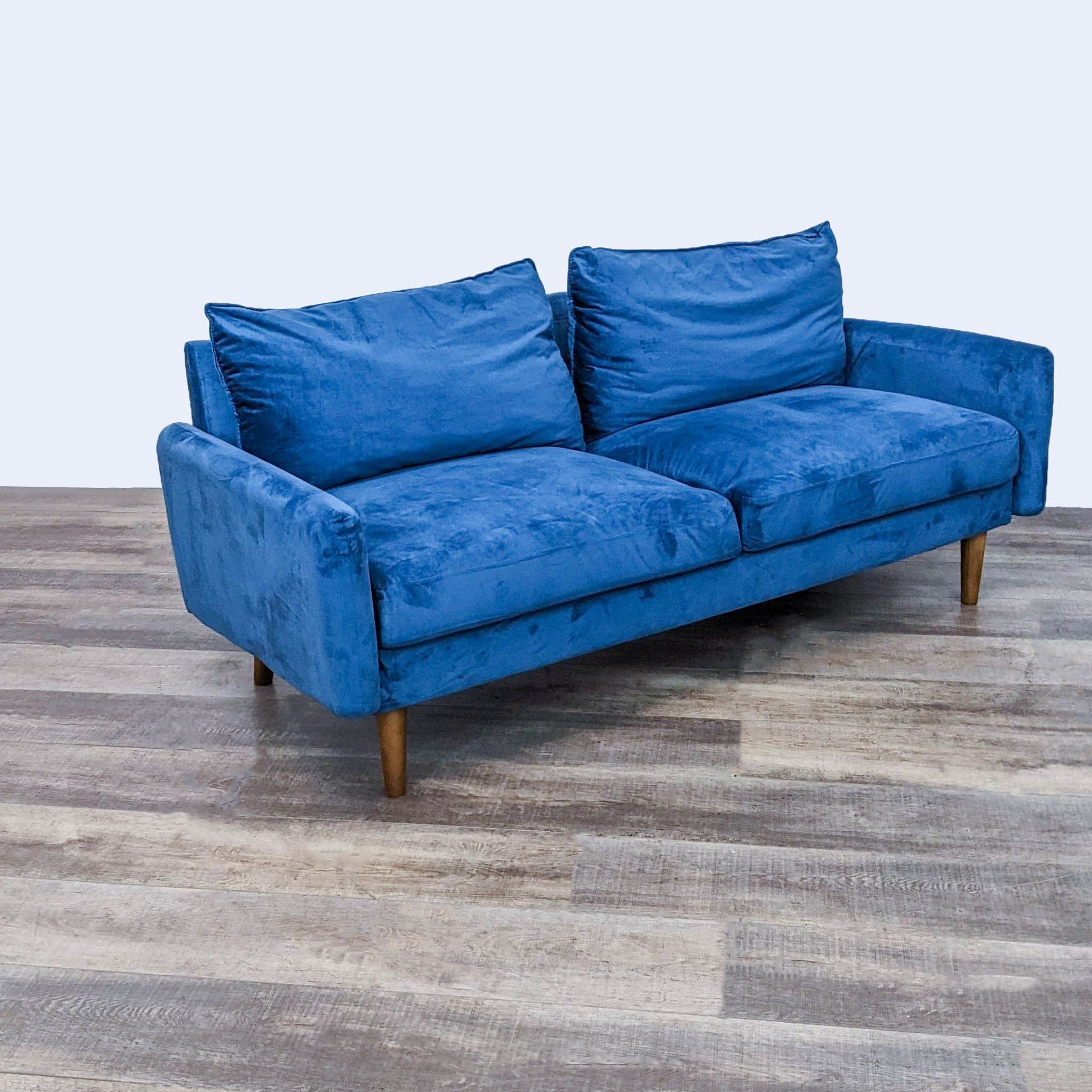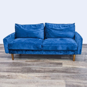 Low Profile Clean Line Compact Blue Sofa With Narrow Arms And Tapered Legs