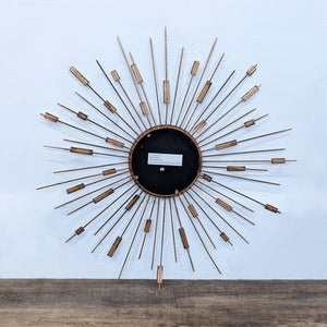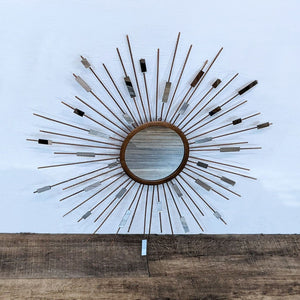 This contemporary starburst mirror features pieces of mirror that burst from the center onto long metal strands creating a dazzling display for any room.