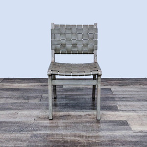 The Fenton chair by Pottery Barn defines midcentury design elements with its clean lines, mixed materials, and tapered legs. The fine buffalo hide is woven around a warm acacia wood frame.