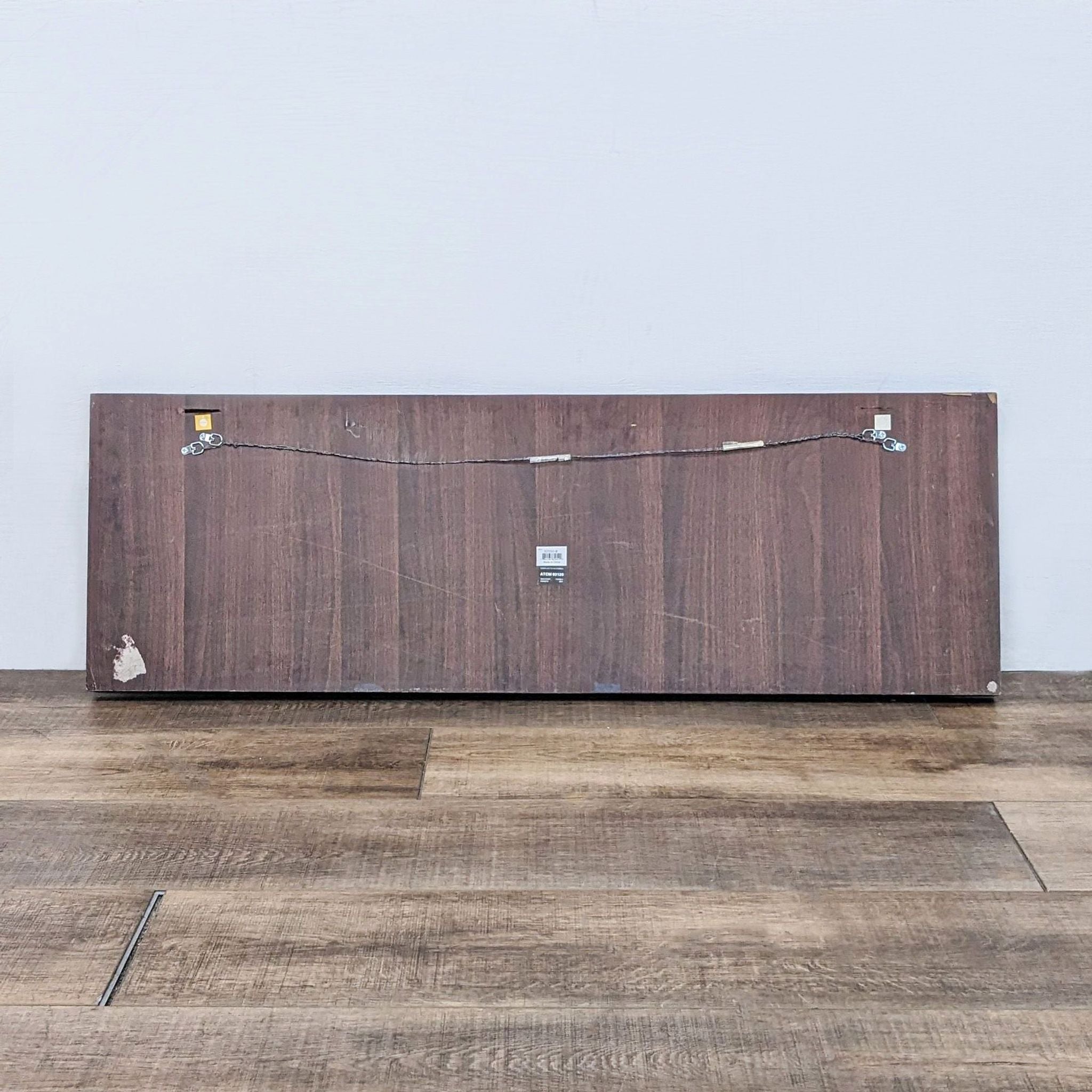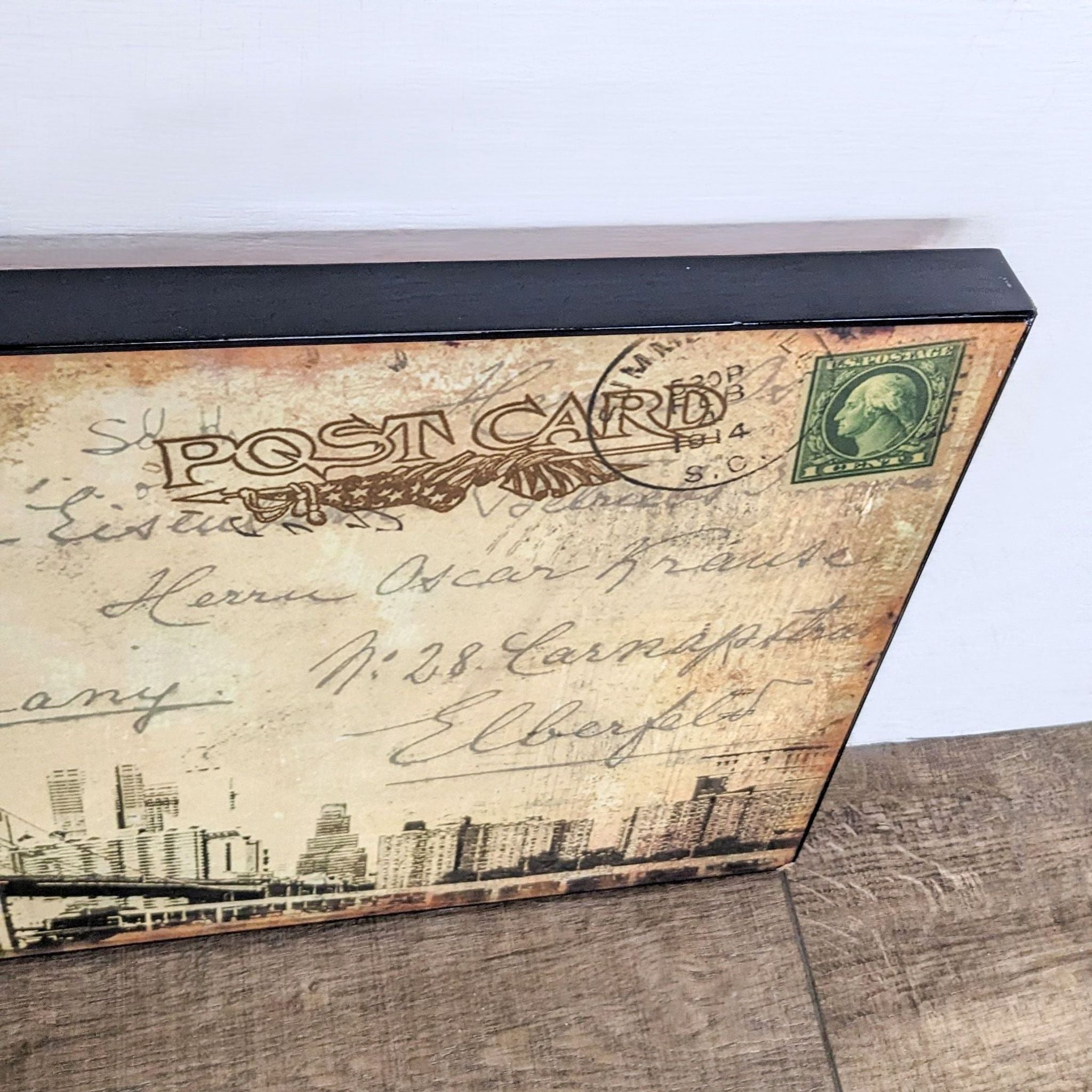 Large art print depicting the Brooklyn Bridge on a postcard mounted on wood veneer backer with hanging hardware.