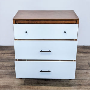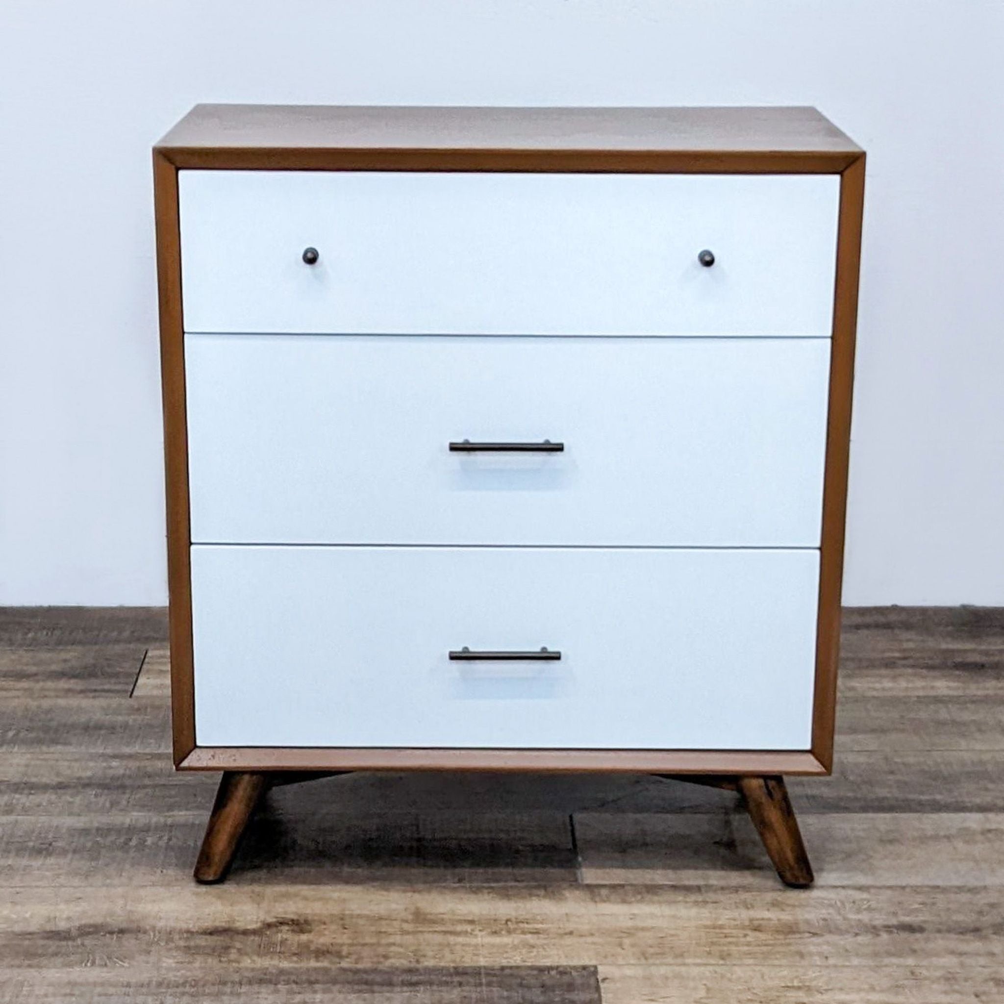 This stylish Oliver Space dresser combines a mid-century modern design with a warm wood frame with three clean white drawers, accented with sleek handles and is elevated by angled legs.