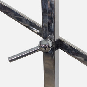 Features polished chrome-plated metal with crystal accents and an off-white linen lamp shade.