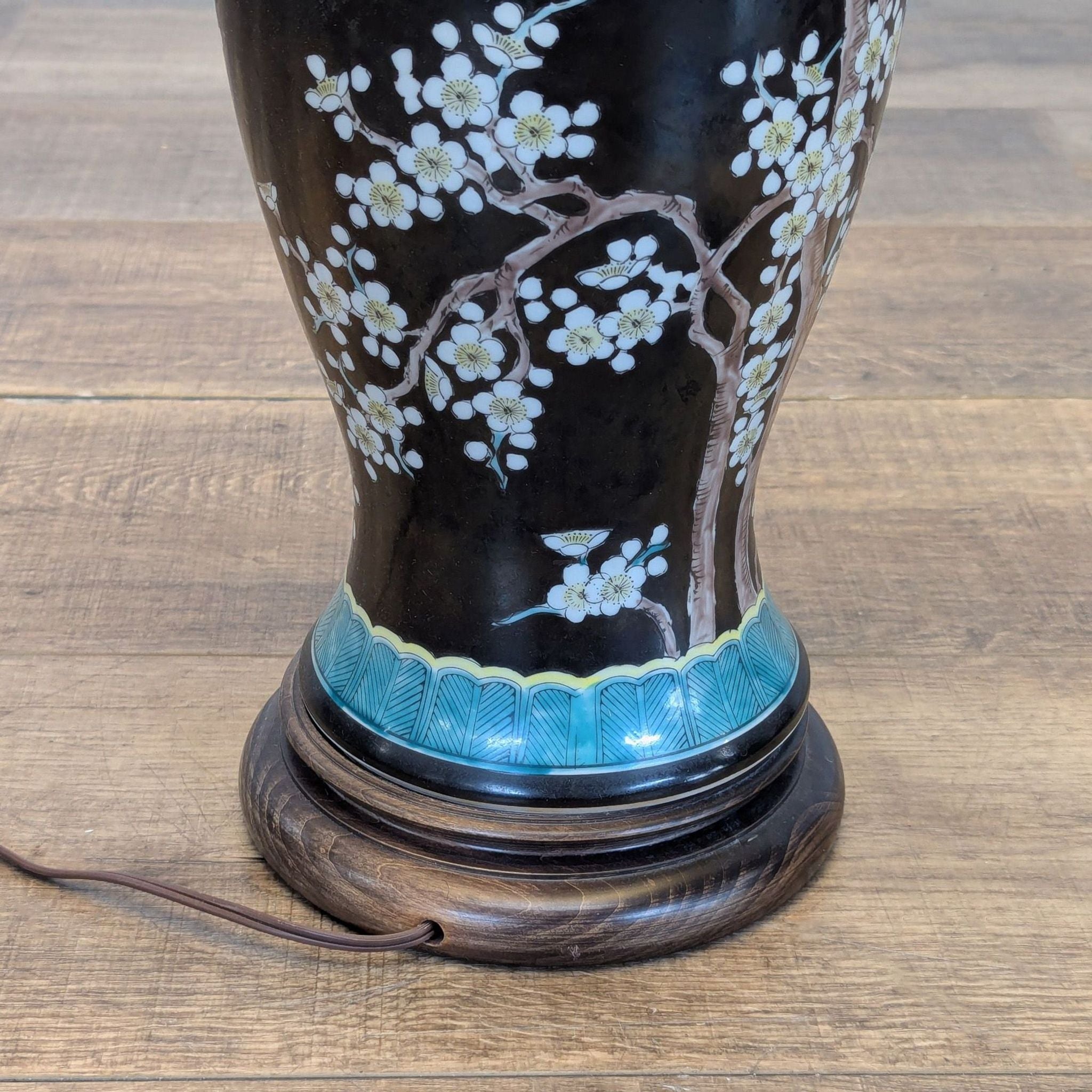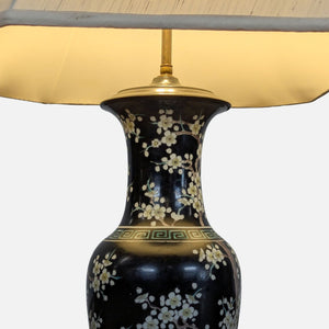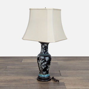 Porcelain lamp base with floral design and fabric lampshade.