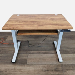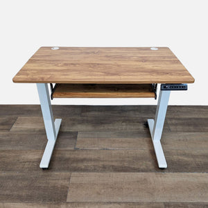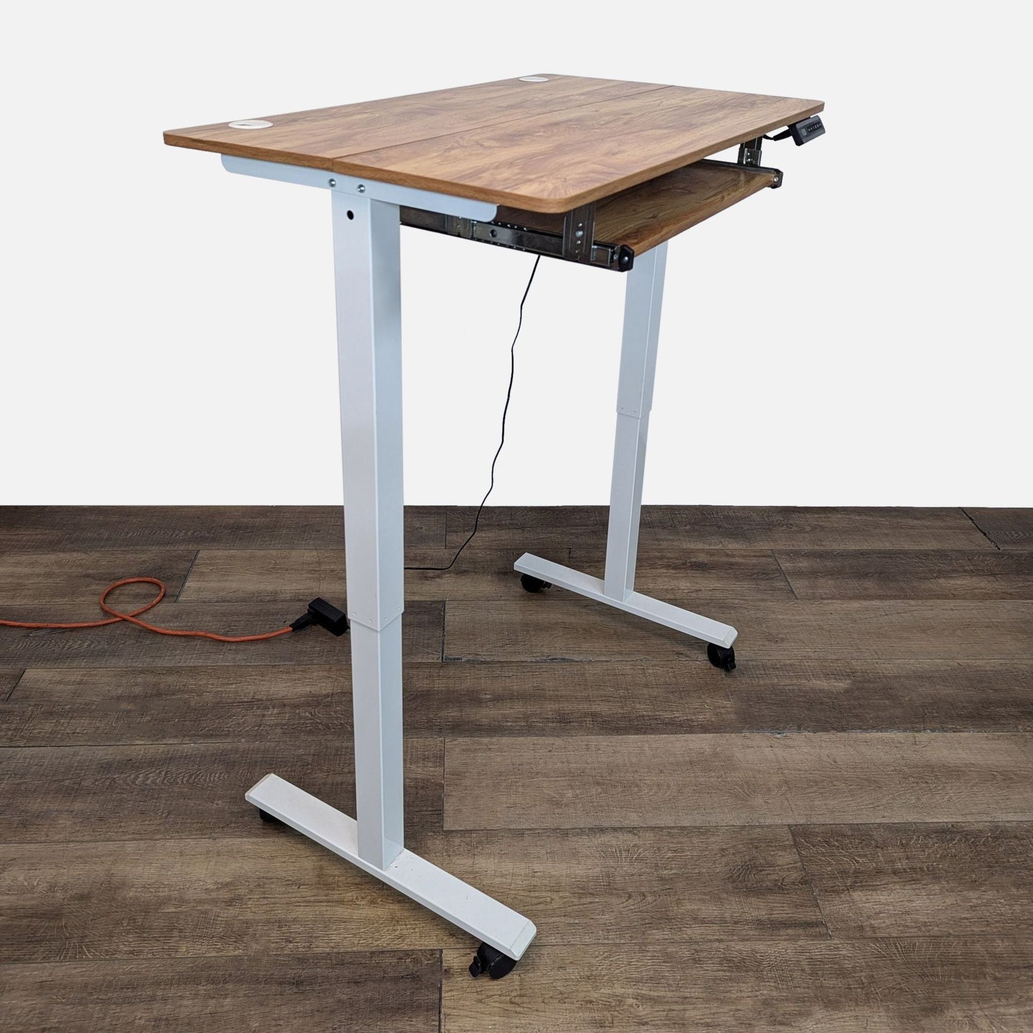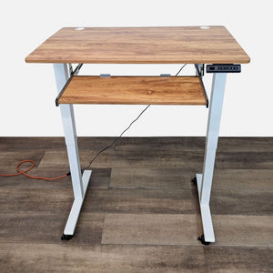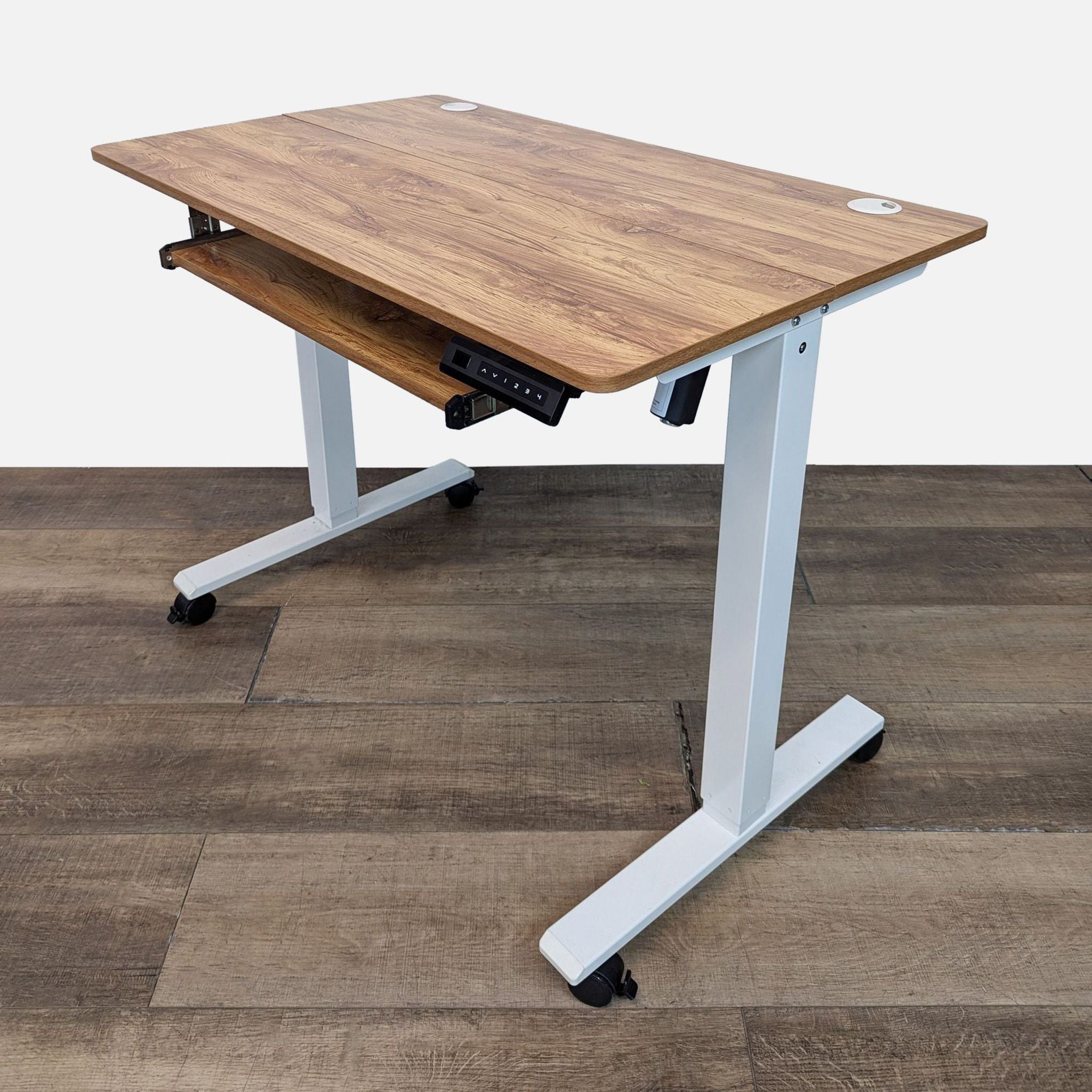 Adjustable height with programmable height, cord management, keyboard drawer and locking caster wheels.
