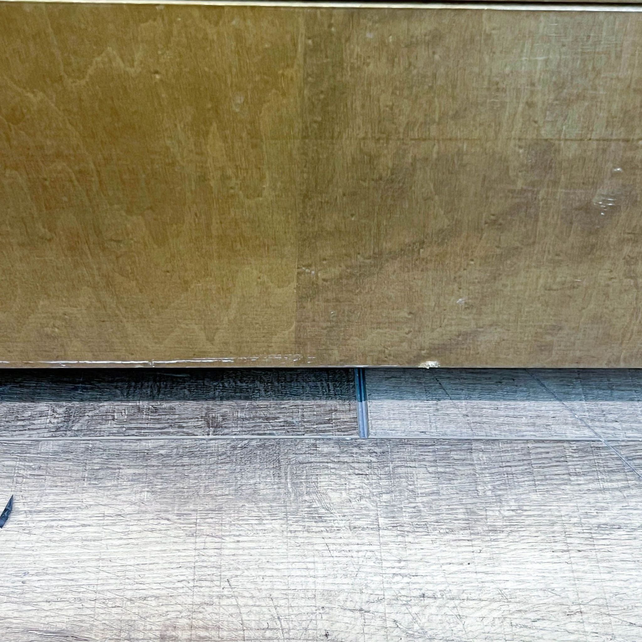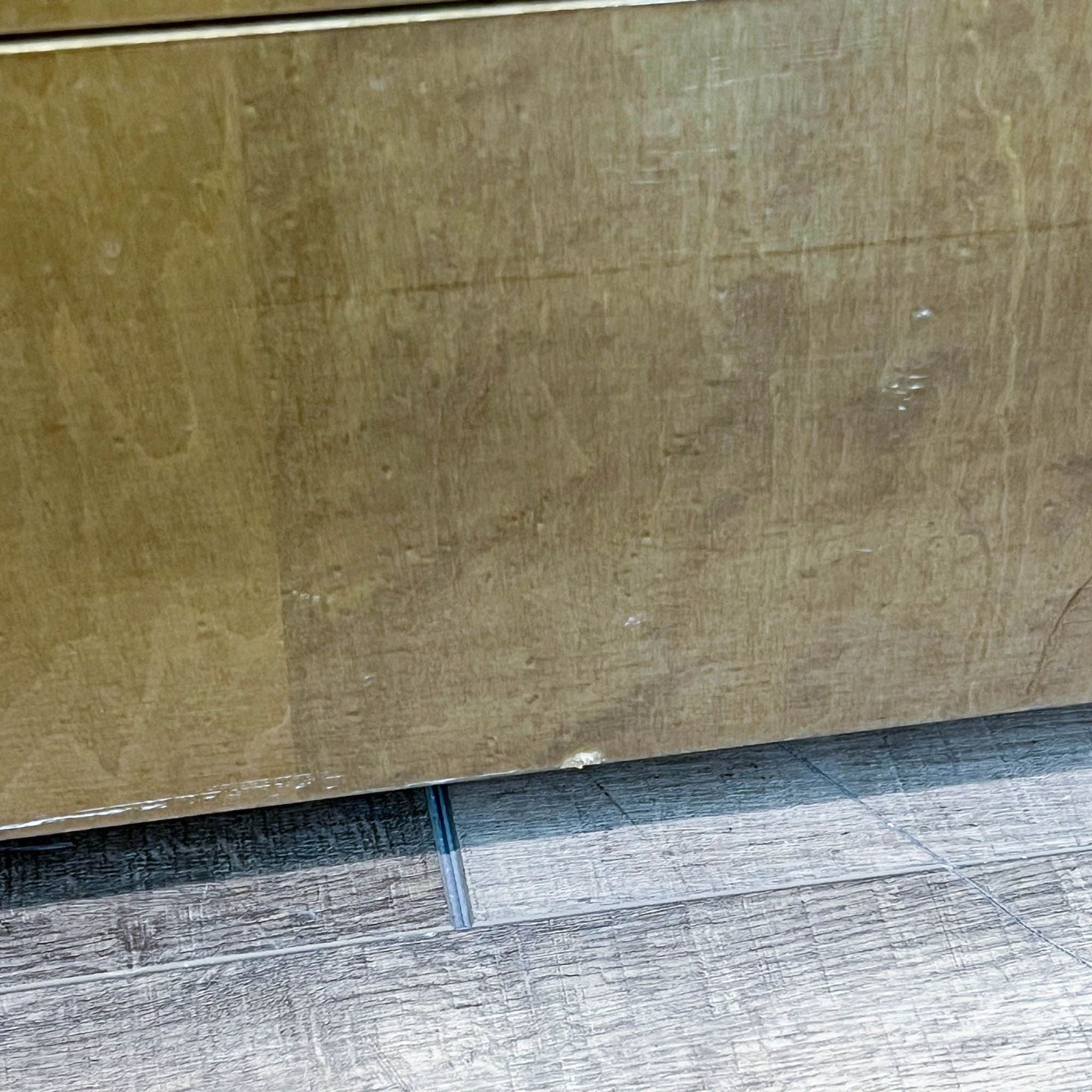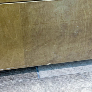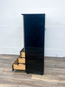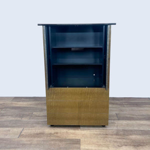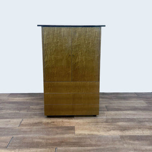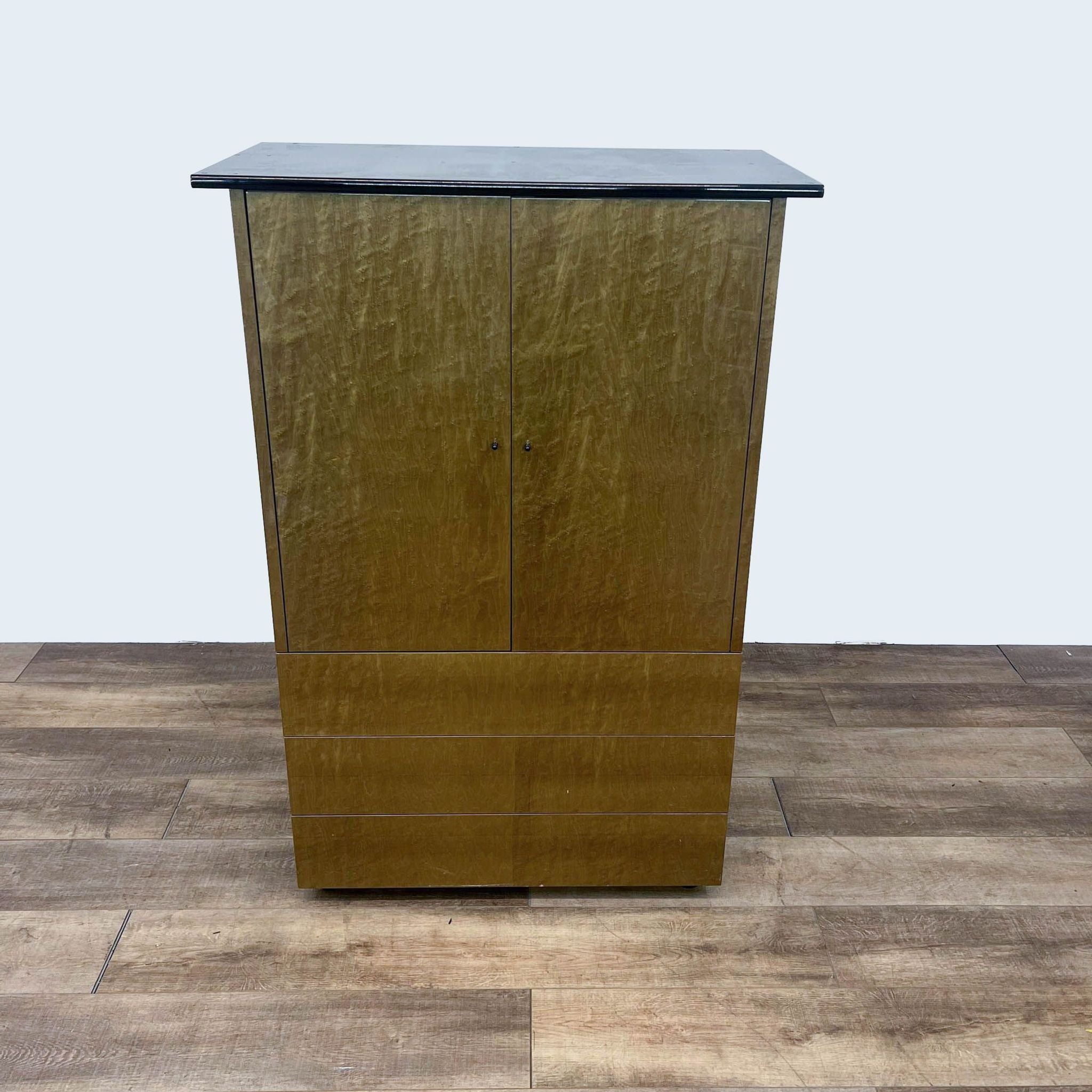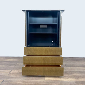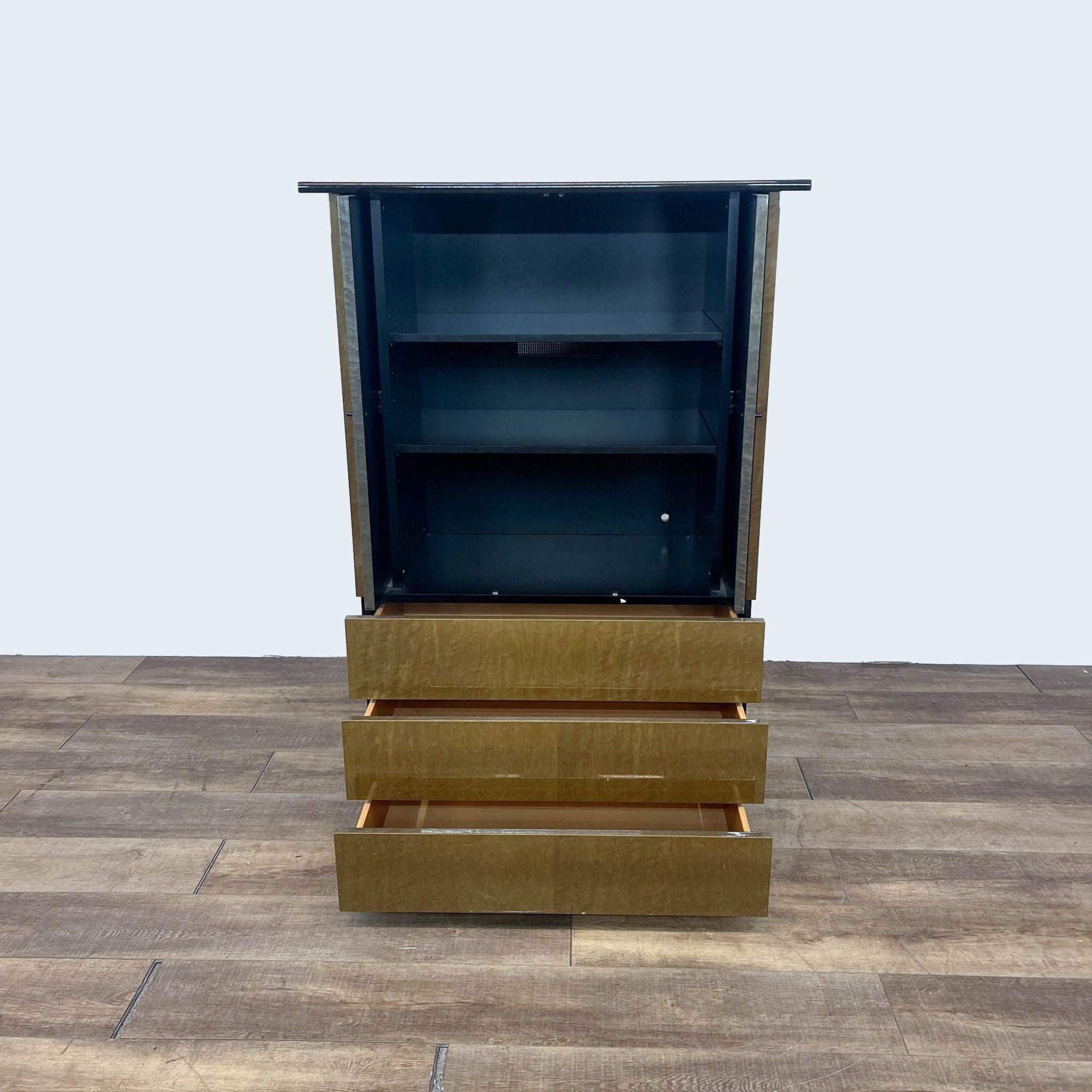 This Art Deco style cabinet features a burl wood veneer with an upper cabinet with shelves and three drawers.