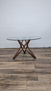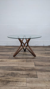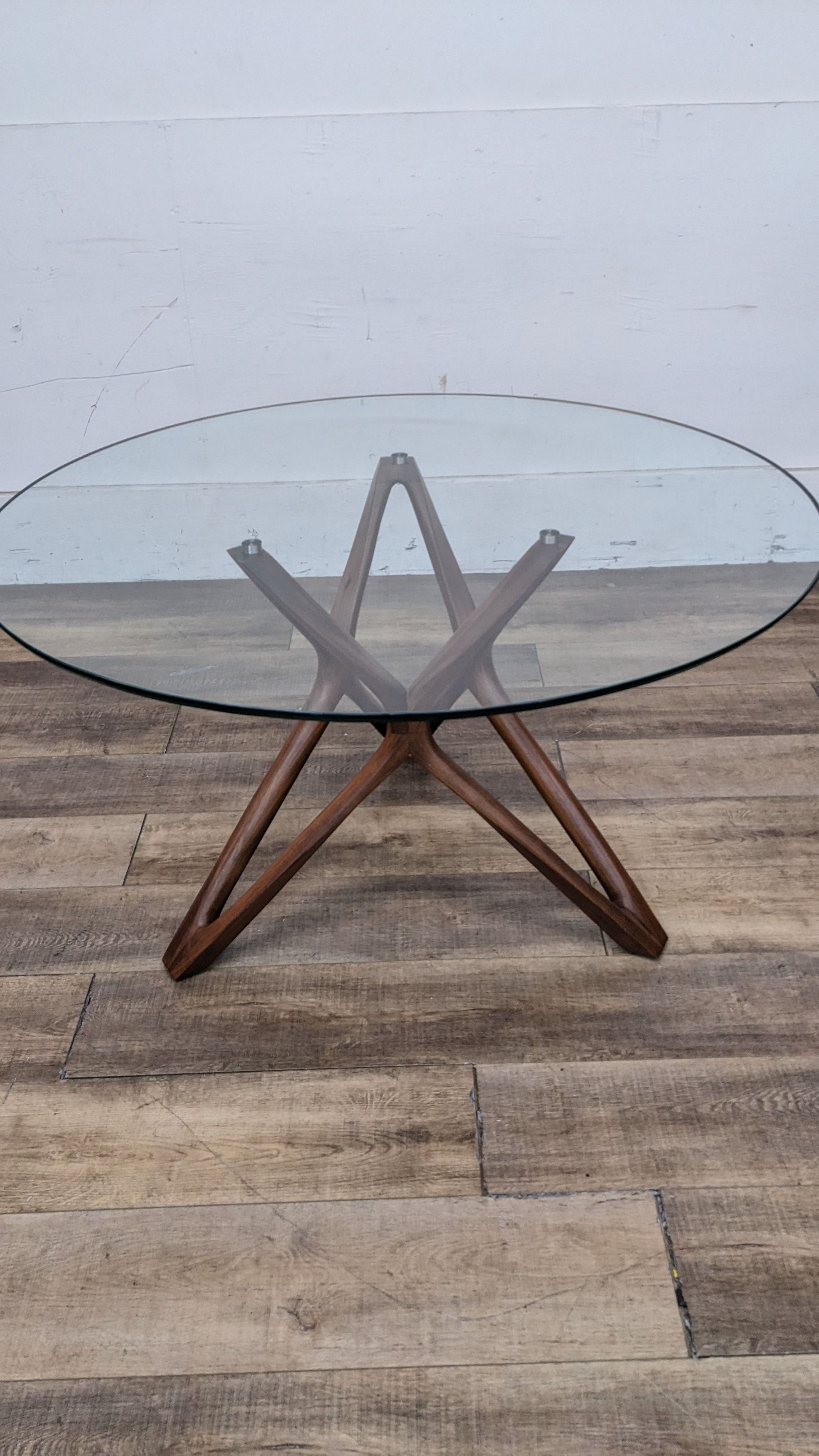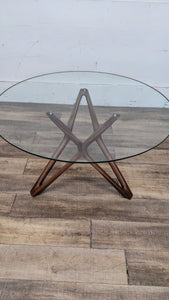 Enhance your dining space with this sophisticated dining set, featuring a round glass tabletop supported by a stylish wooden cross base. The table's transparency brings an open, airy feel to your room, while the four included sleek, faux leather upholstered chairs offer comfortable seating with a contemporary flair. Perfect for intimate dinners or casual brunches, this dining set is sure to impress guests with its blend of modern design and classic comfort.