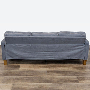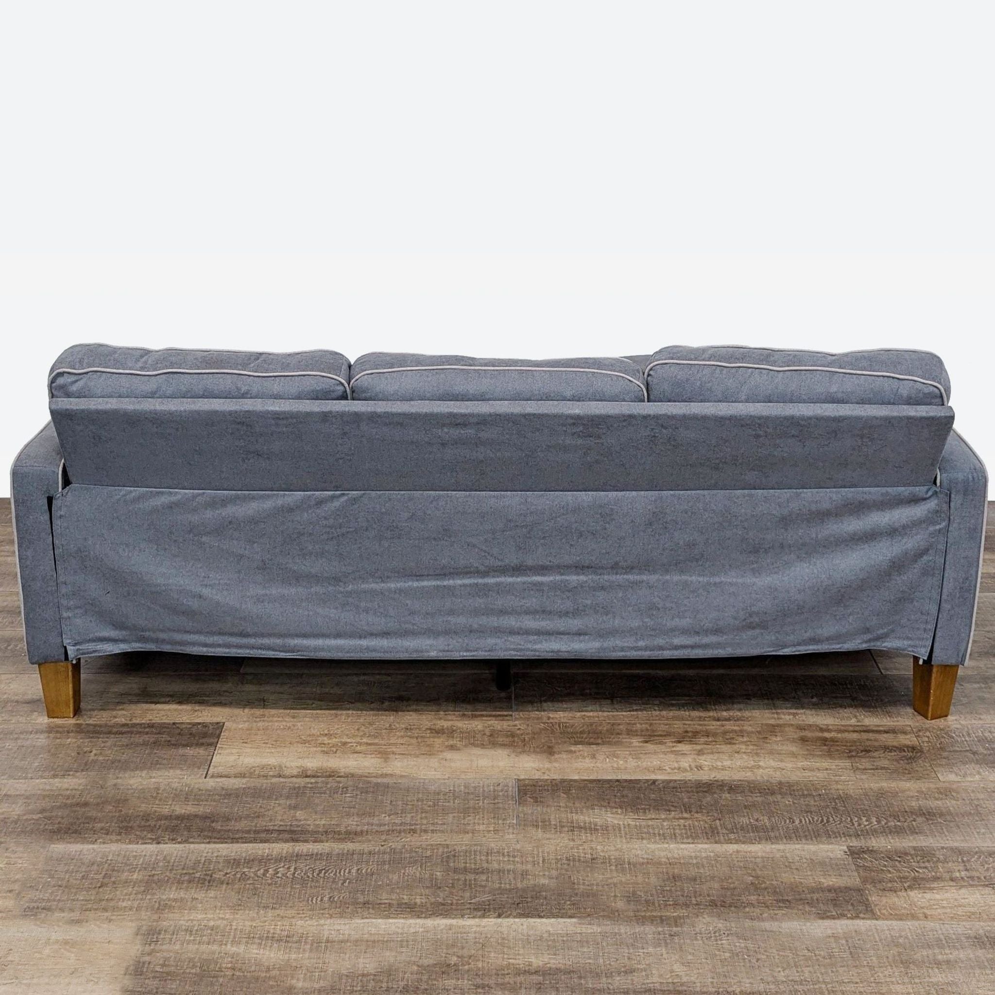 Modern Dorel Living sectional sofa features sleek track arm design upholstered in a soft chenille fabric with contrasting beige welt trim detail and solid wood pyramid feet with a light walnut finish.