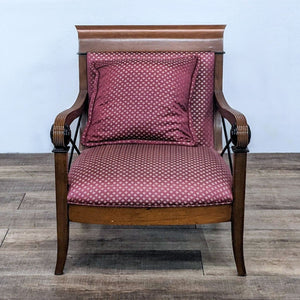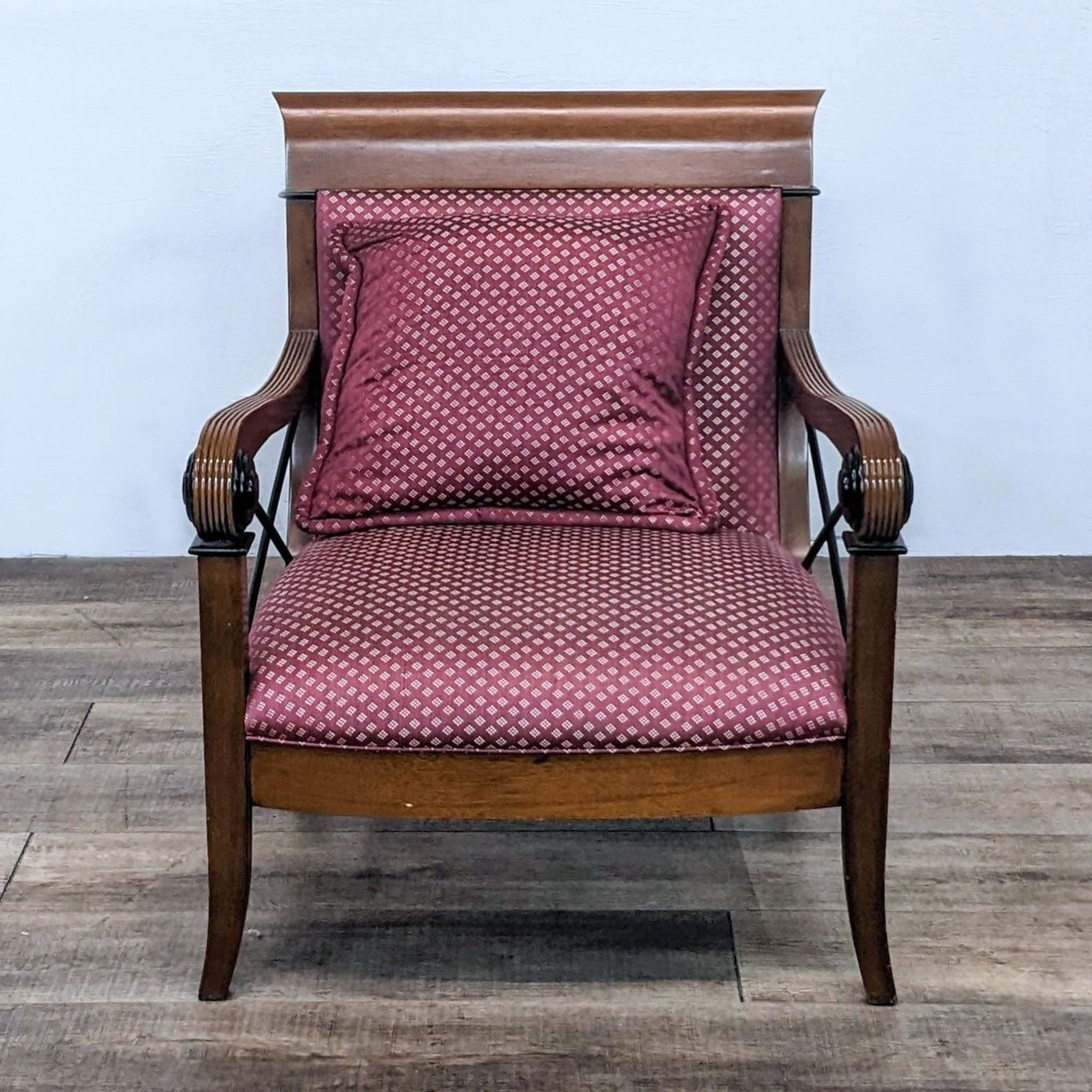 This pair of armchairs is constructed with a wood frame and has upholstered seat and back with a matching throw pillow. The chairs also feature X detailing on each side.