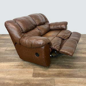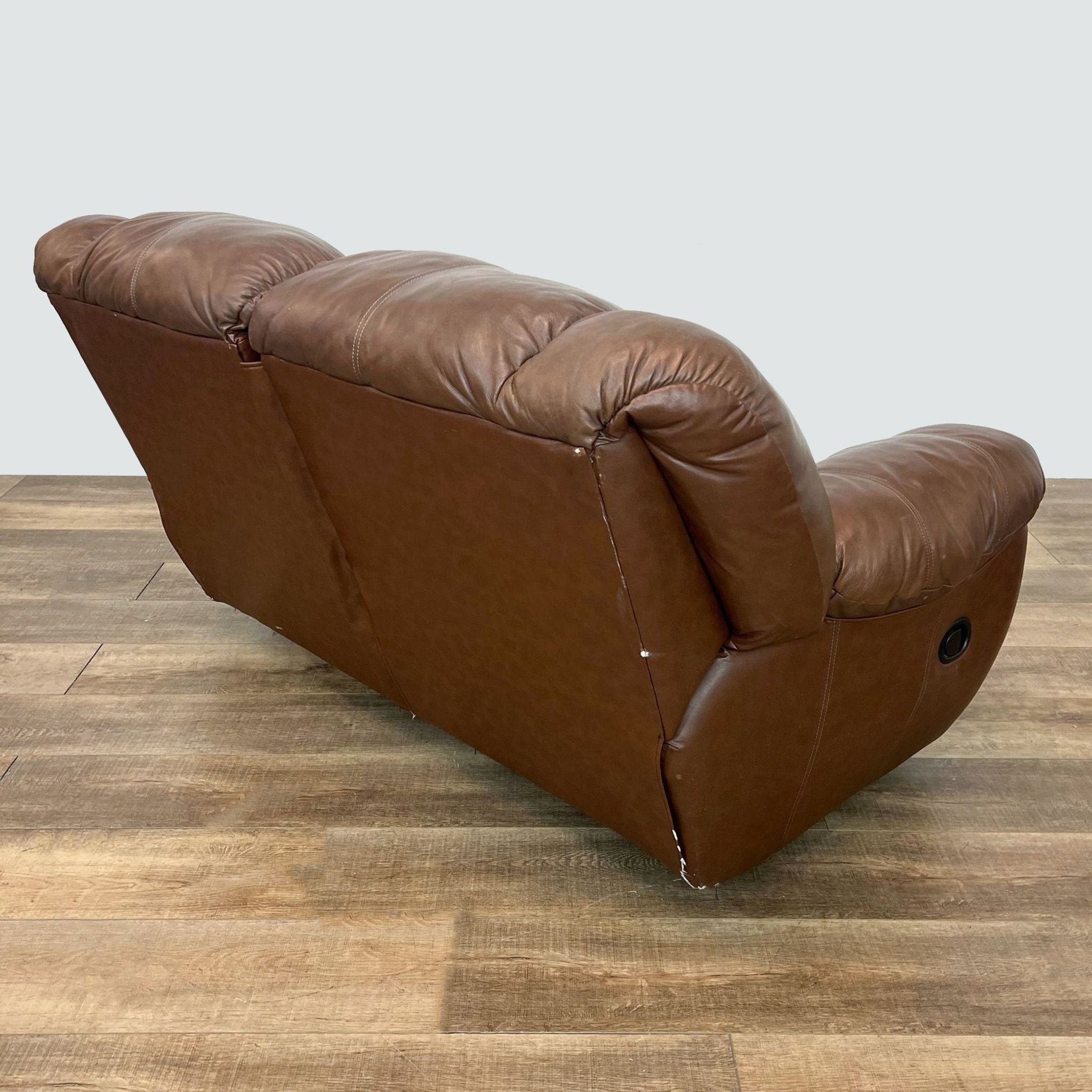 This sofa has plush cushioning with brown leather upholstery and features a manual reclining function.