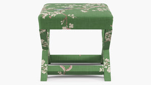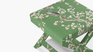 Branch And Bird Design Green Fabric Upholstered Small Bench With Criss Cross Legs