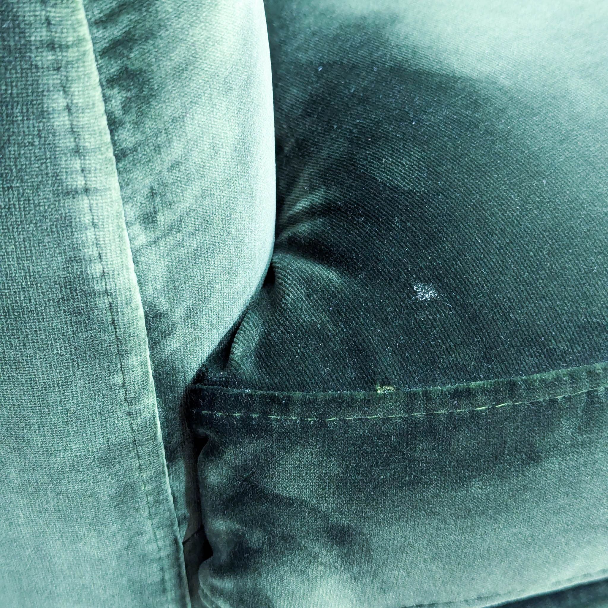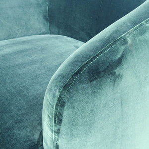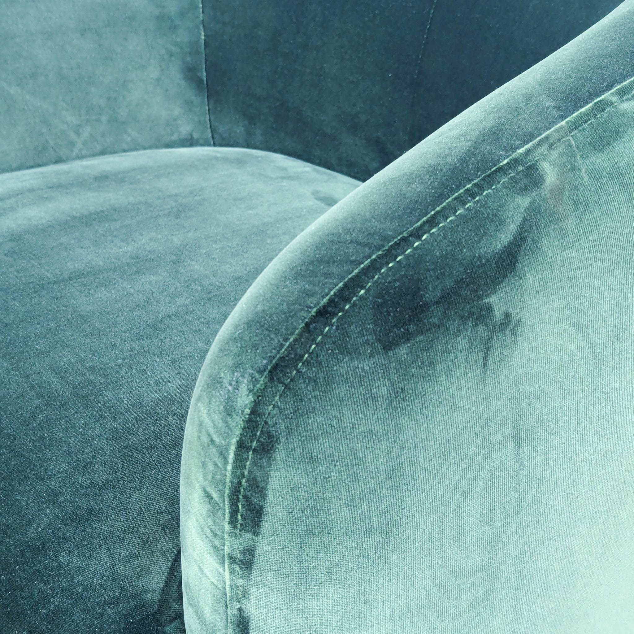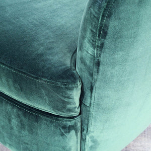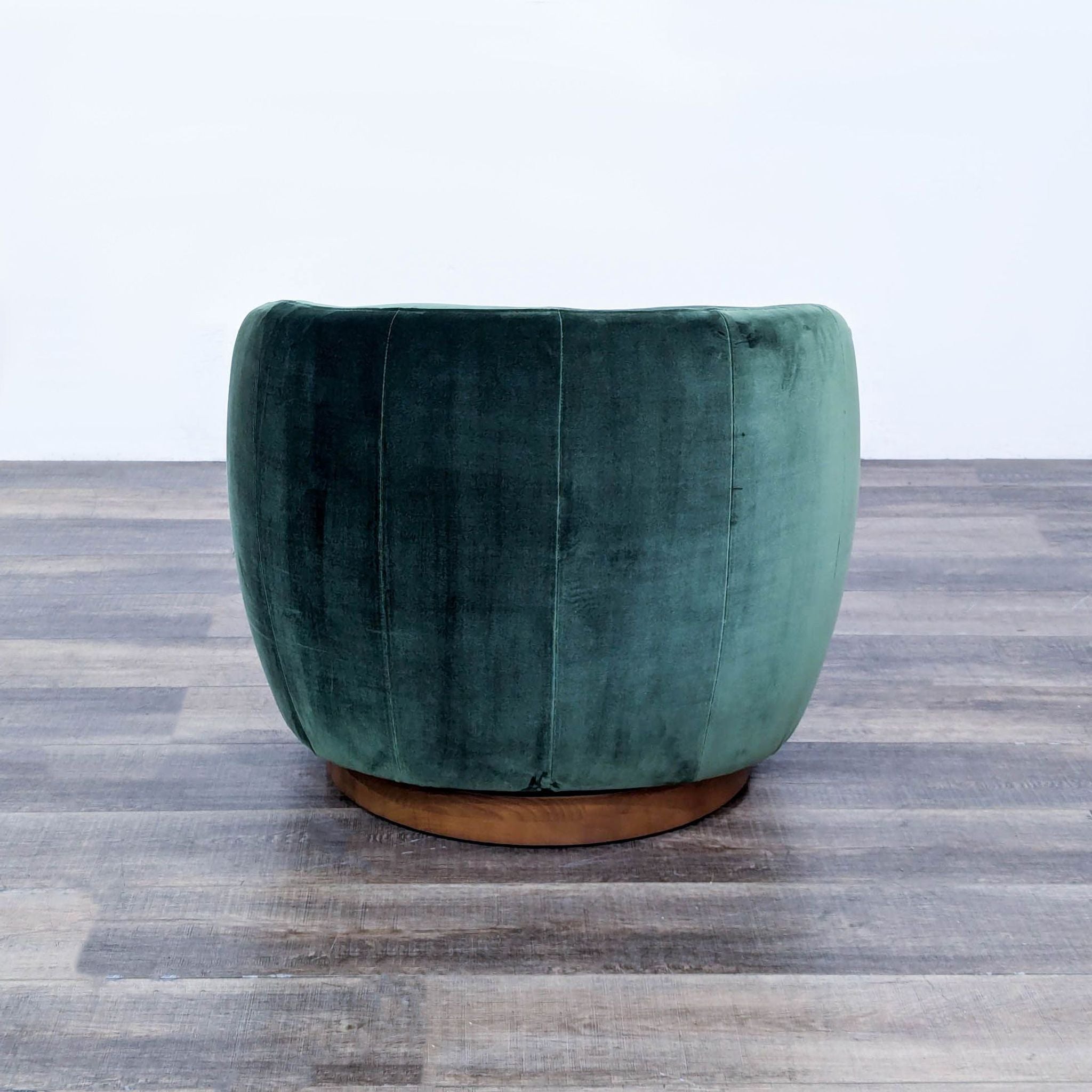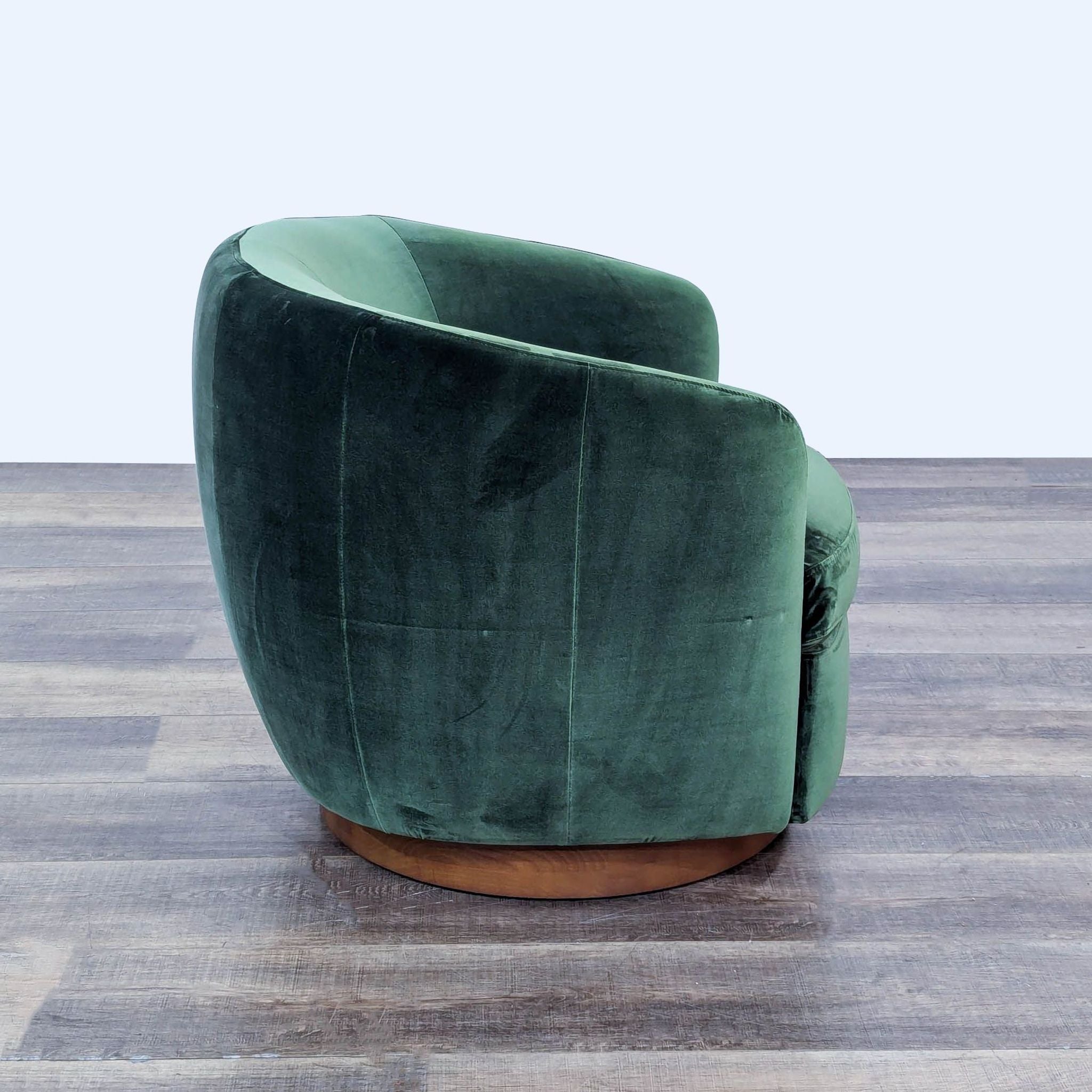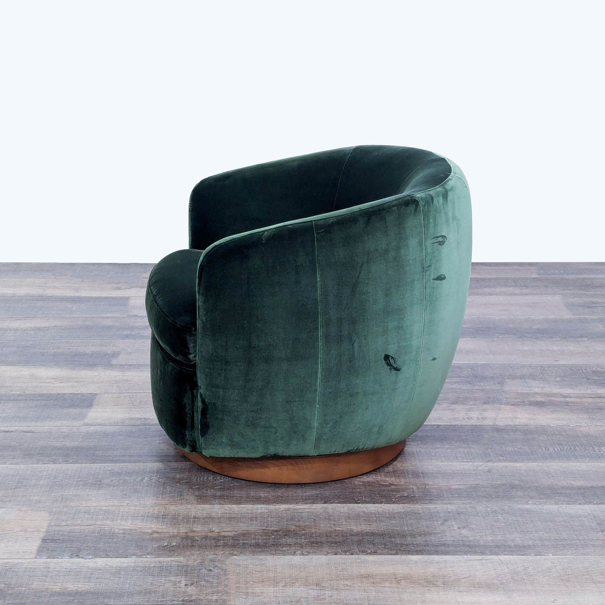 Lounge chair with wood swivel base, barrel back and green velvet upholstery.