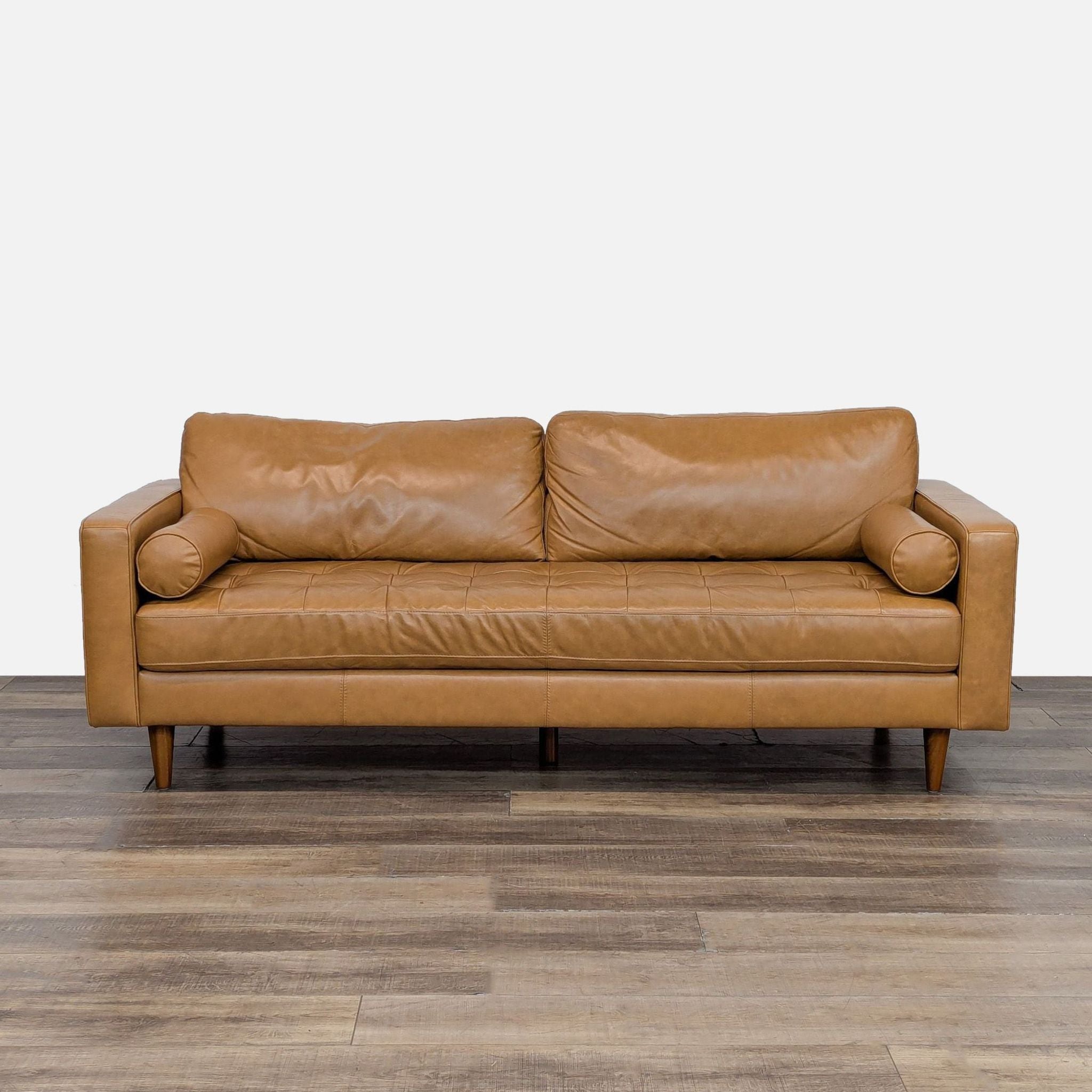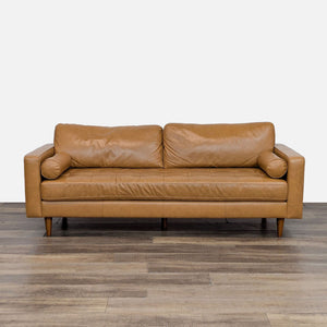 Features track arms, tufted seat, bolster pillows and tapered wood legs.