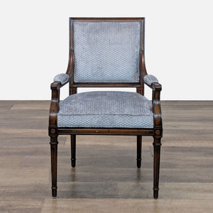 Features tapered fluted legs with upholstered seat, back and armrests.