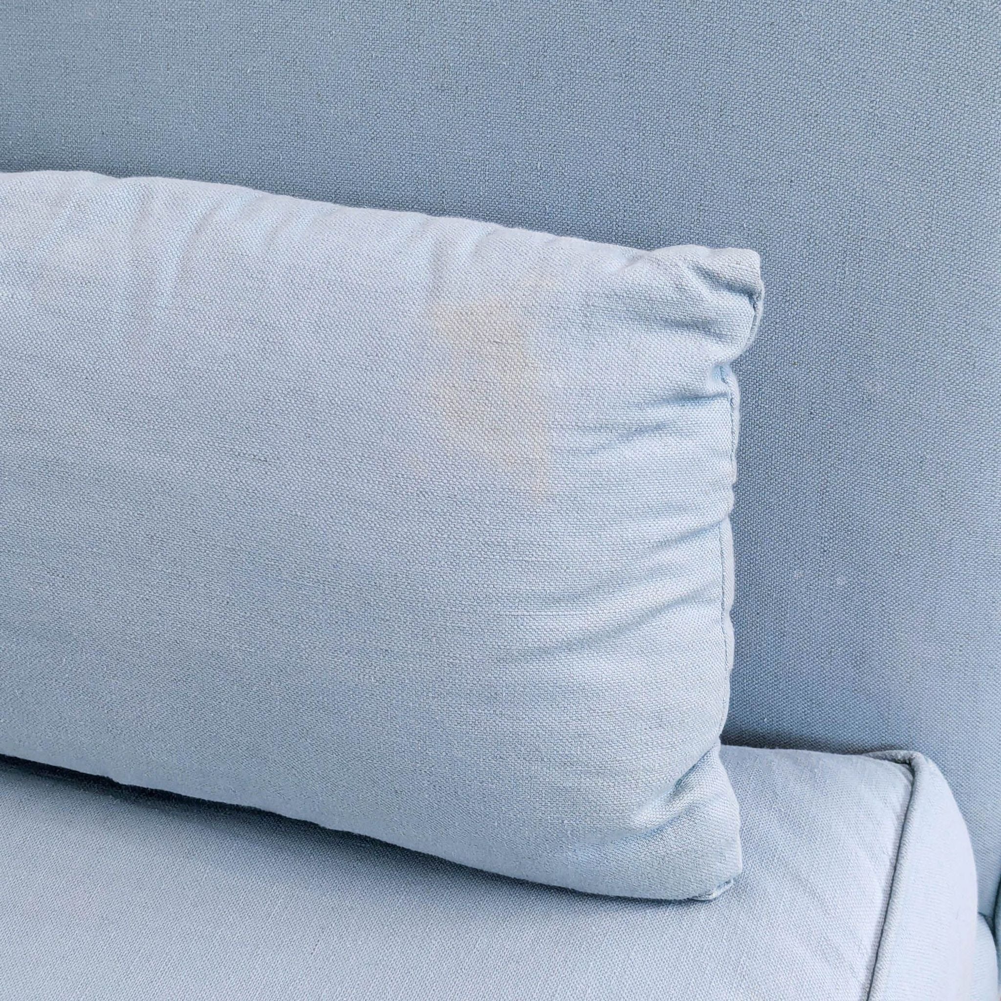Features rolled back, fabric upholstery and wood legs with brass casters on the front.