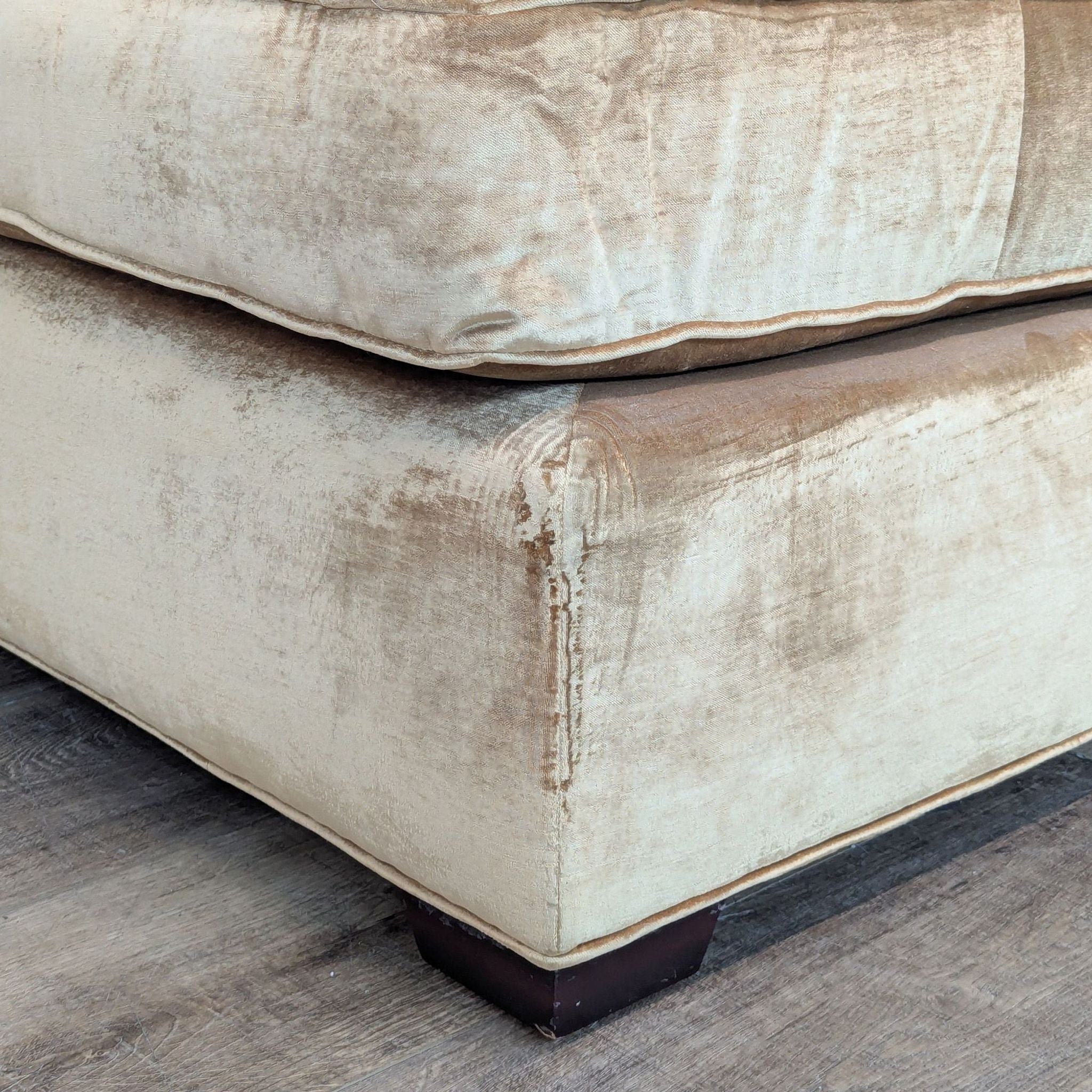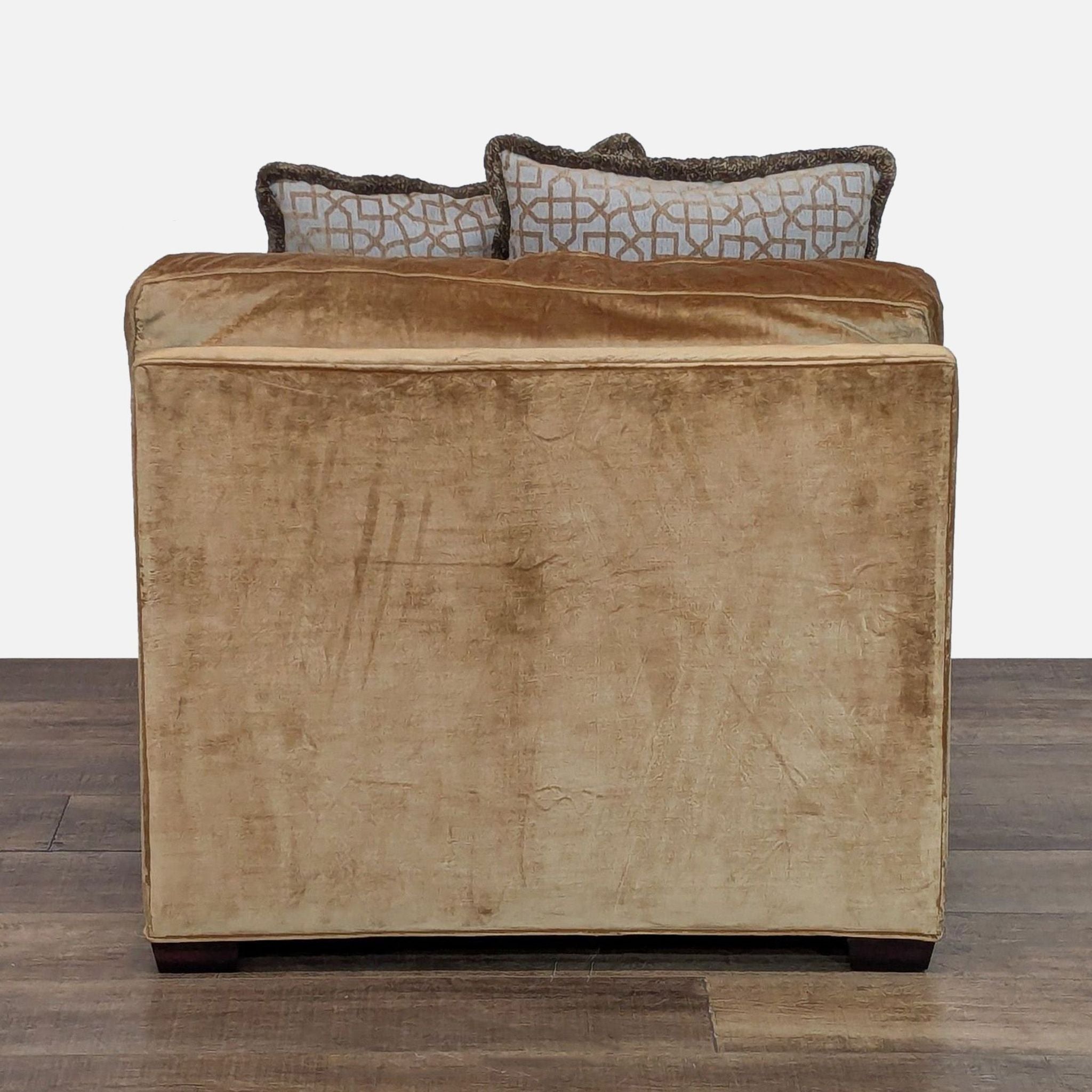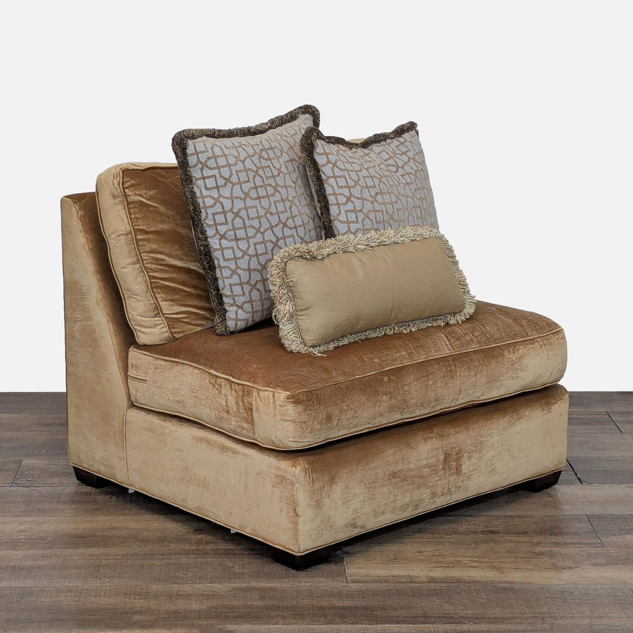 Armless lounge chair with gold tone upholstery and 3 accent pillows.