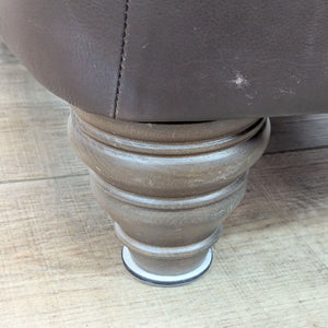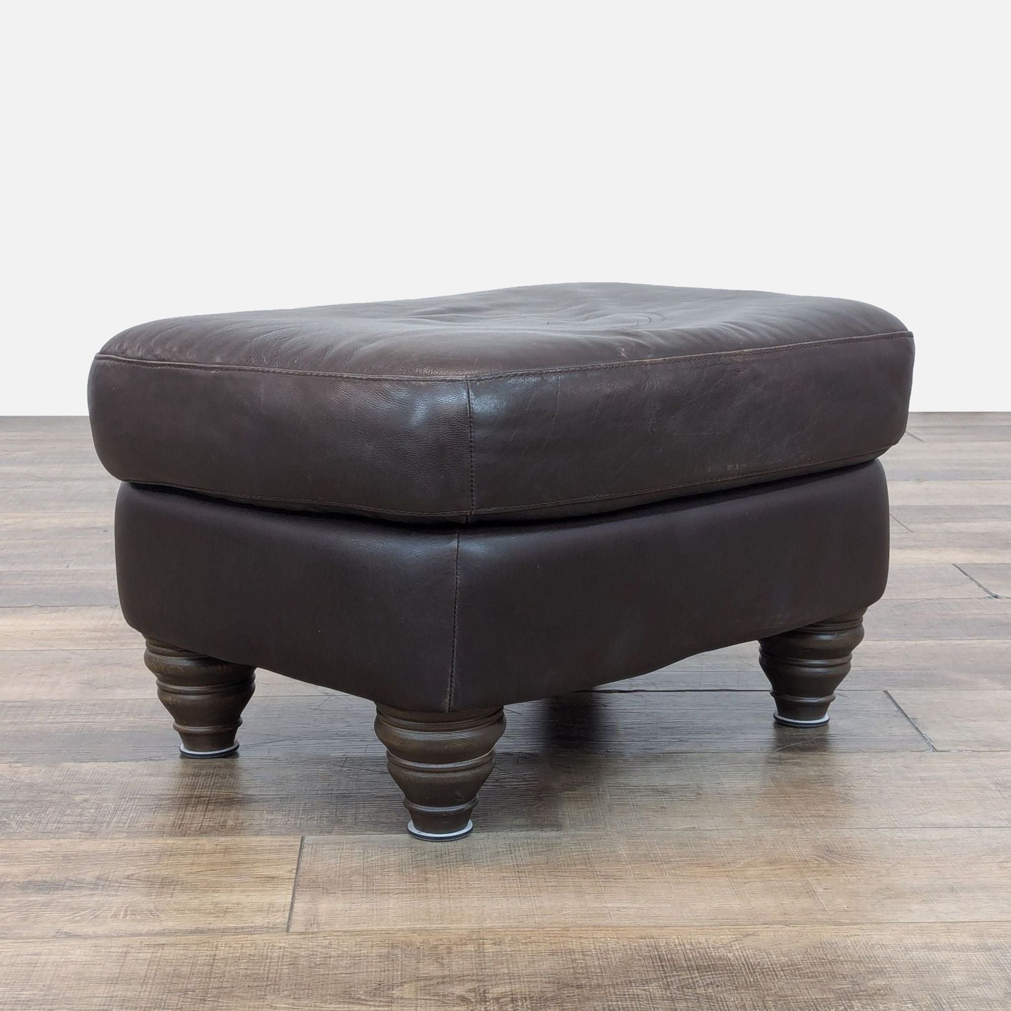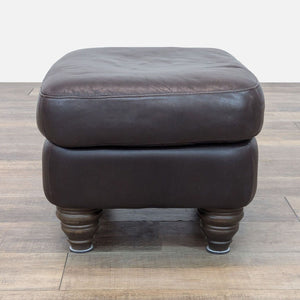 Classic ottoman with brown leather upholstery and turned wood bun feet.