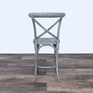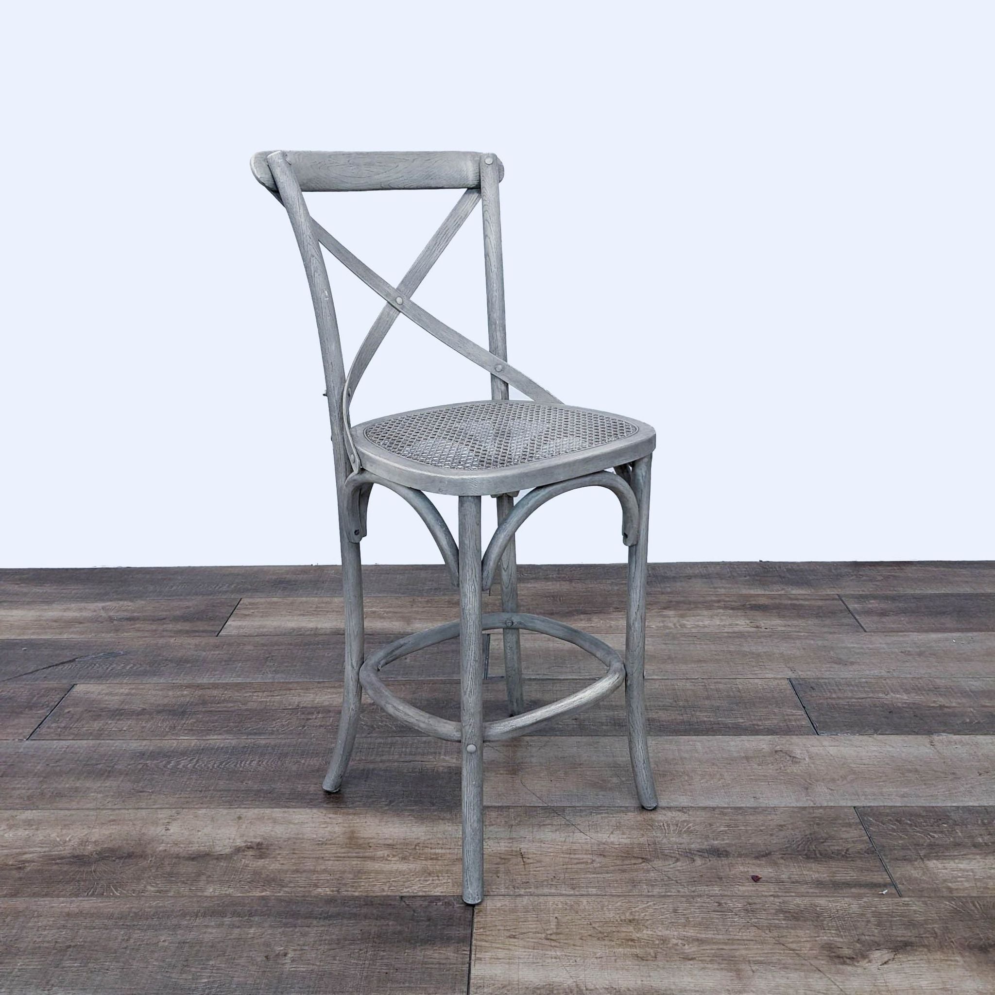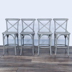 Matching Set Of Four Grey Wash Finish Solid Wood Classic Cafe Barstools With Cane Seats And Cross Back Detailing