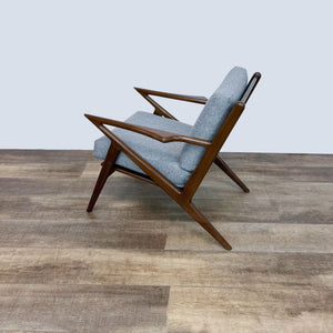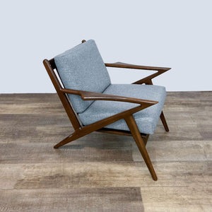 This accent chair has mid-century modern style featuring a wood frame with angled design in a walnut finish with removable upholstered cushions.