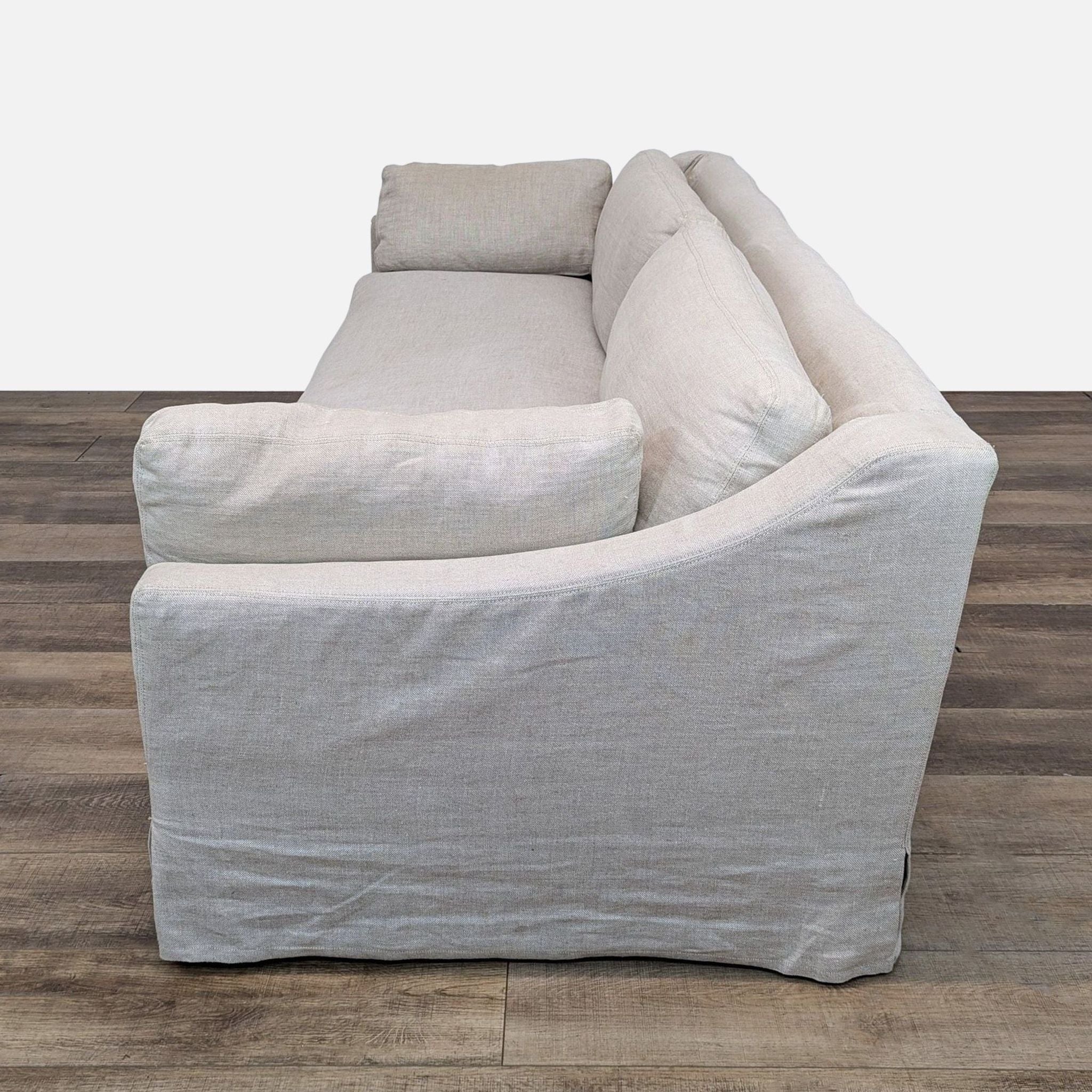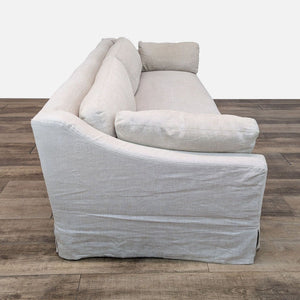 The Belgian Bench Seat Sofa features a classic interpretation of the European-inspired track arm sofa with a deep profile, sleekly streamlined and slipcovered for casual yet sophisticated appeal.