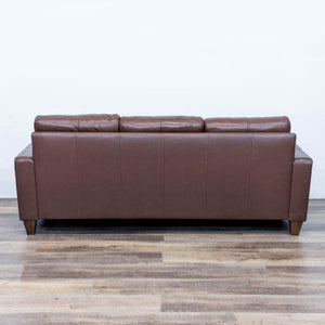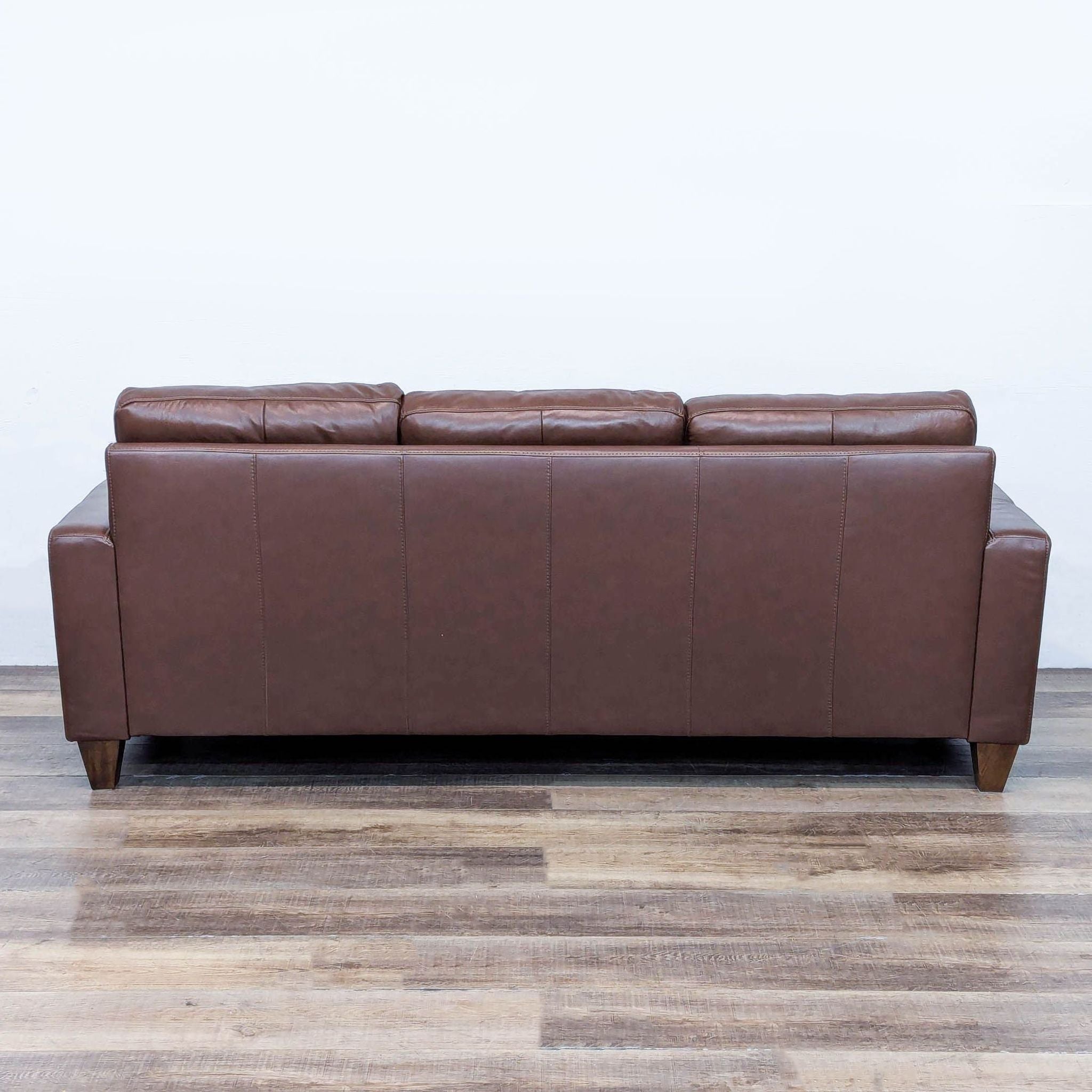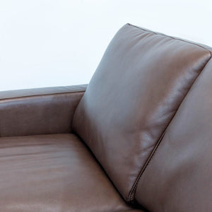 The Hudson features track arms, tapered legs and plush high-density foam cushions wrapped in Dacron for a balanced experience of comfort and support, while sinuous spring suspension provides a strong seating foundation. Upholstered in brown leather.
