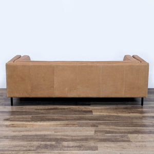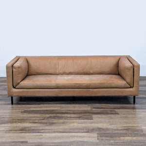 The Malta sofa features clean lines, leather upholstery, bench style seats and plush bolster pillows and rustic iron legs.