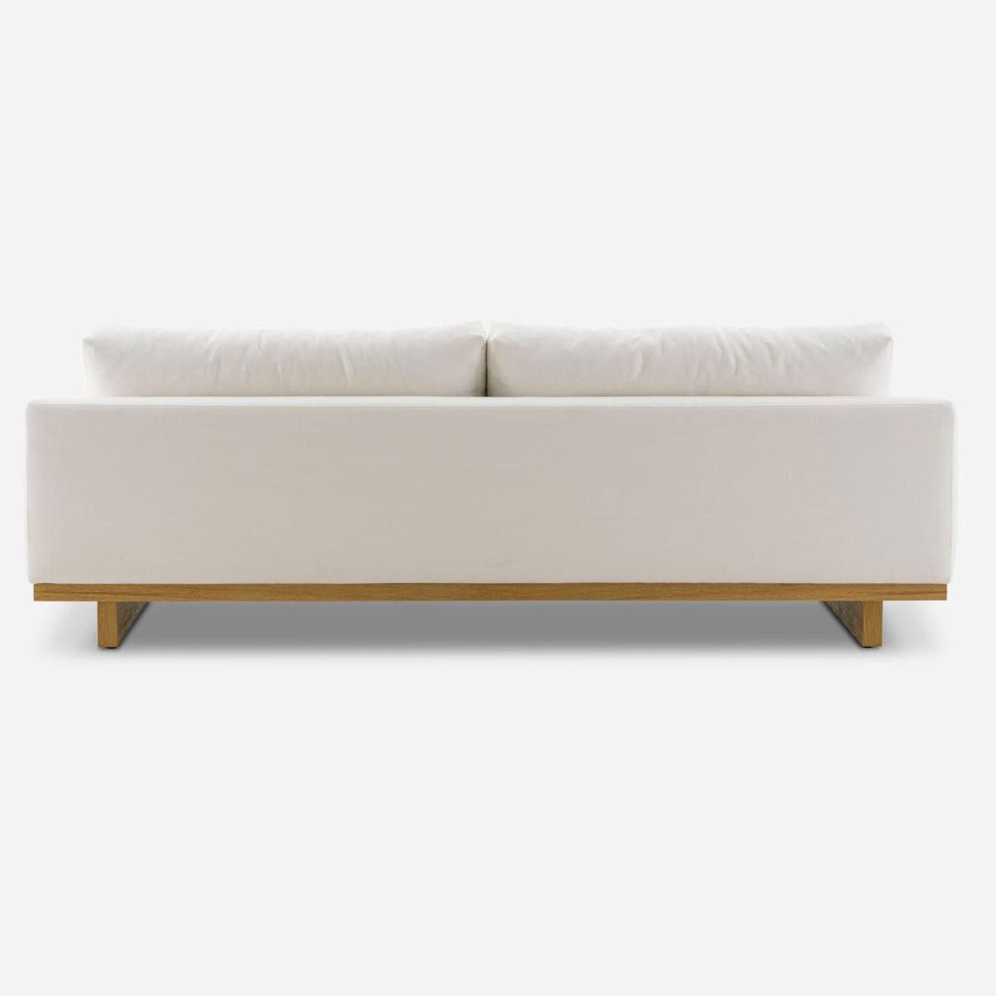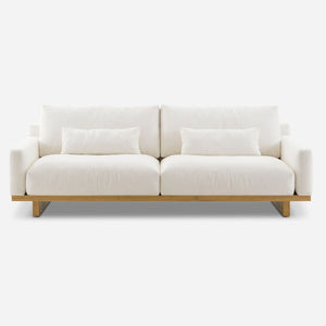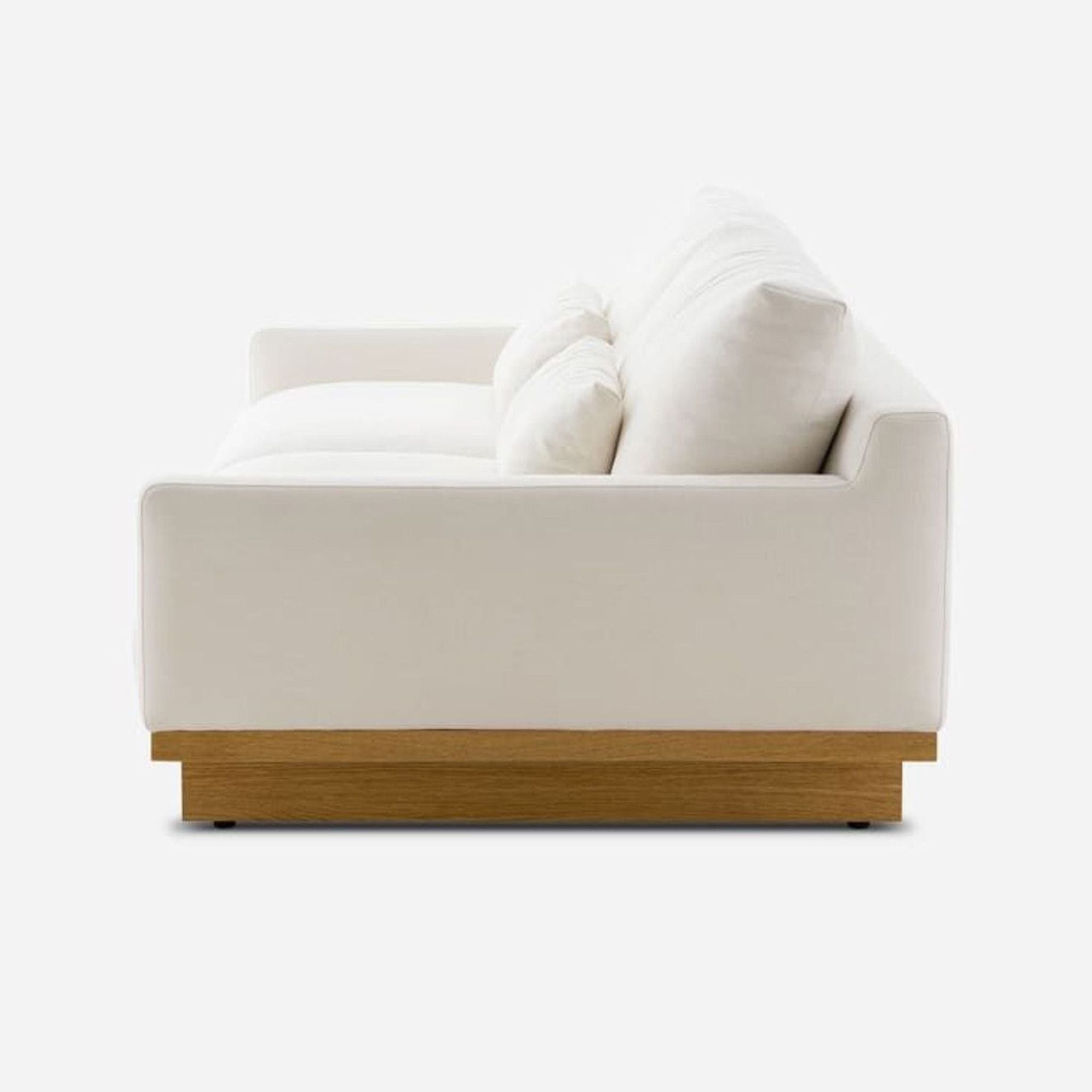 Features feather filled cushions with removable and washable covers, wood legs and a low profile. Fabric color is Alpine.