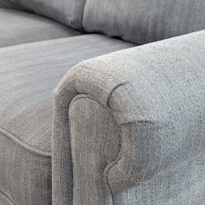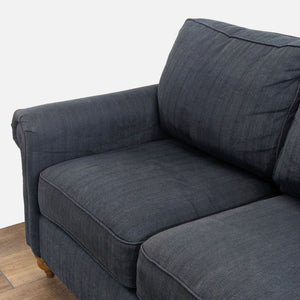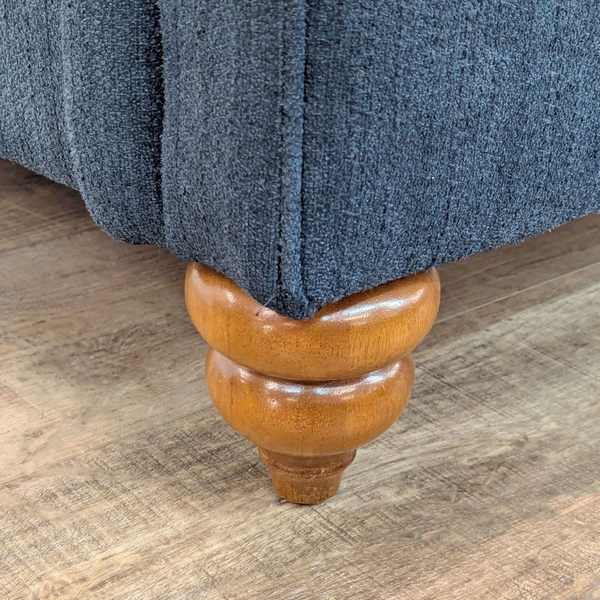 Blue fabric upholstery with rolled arms and turned wood feet.