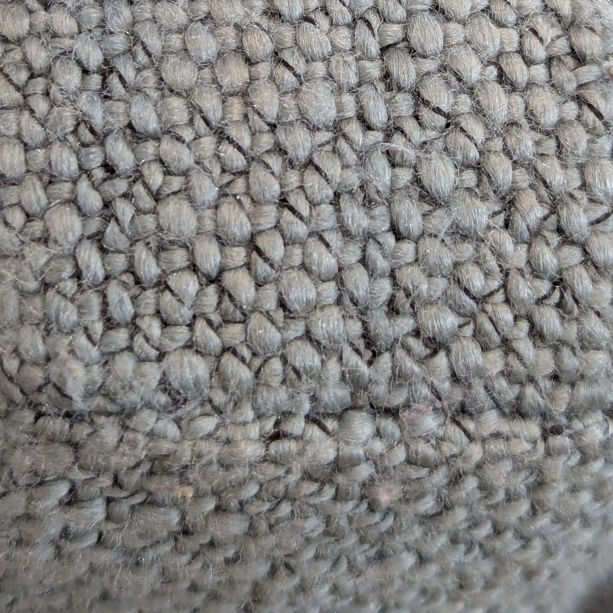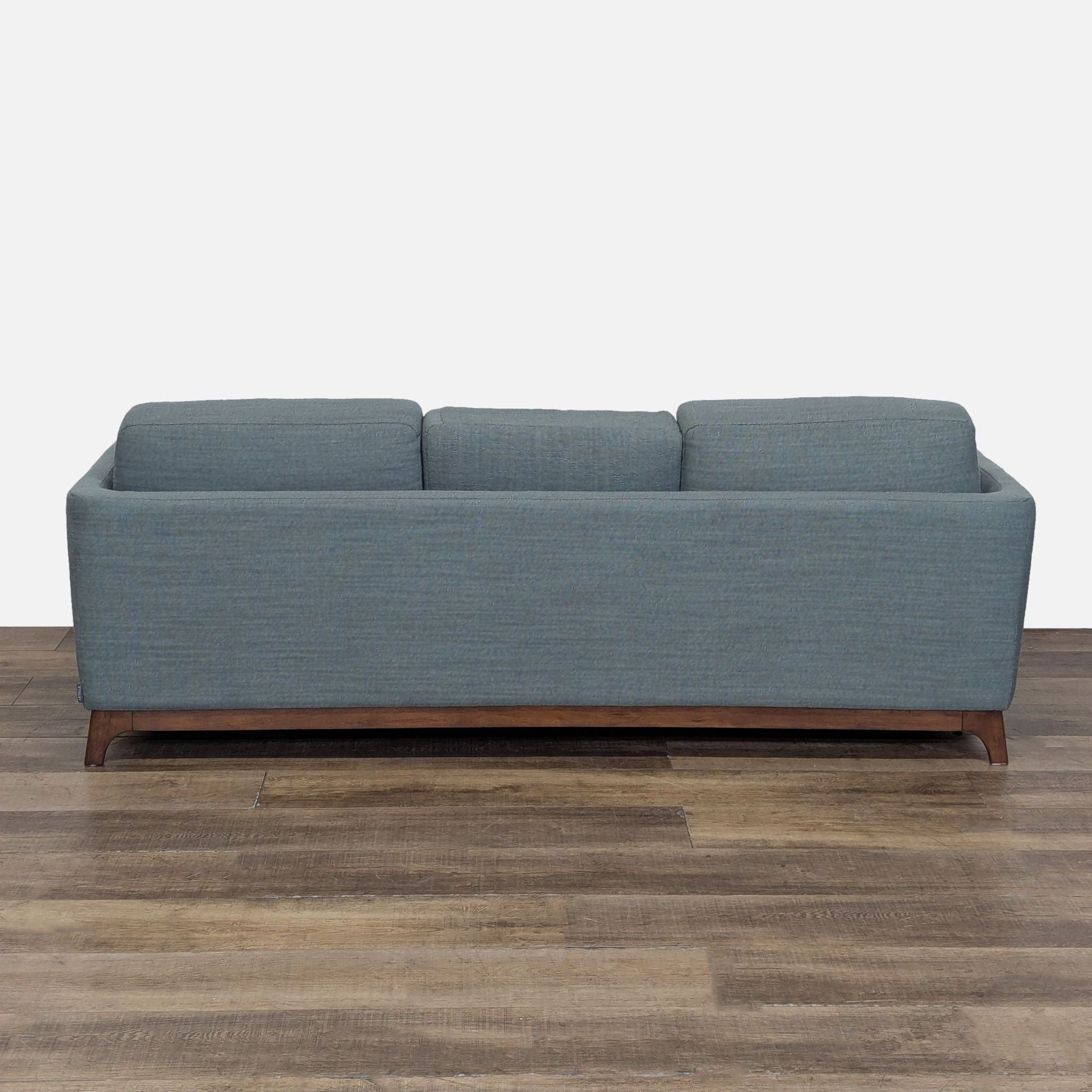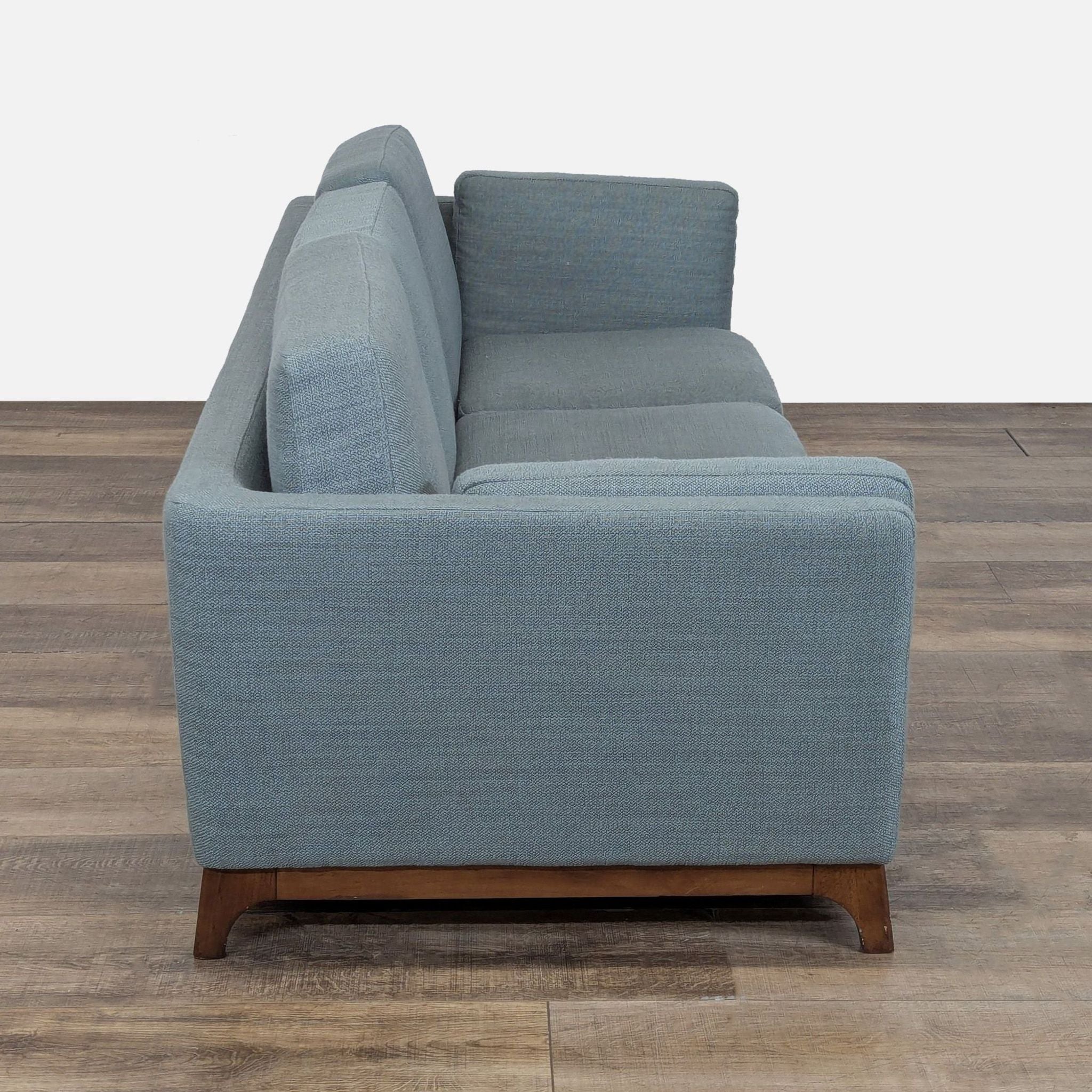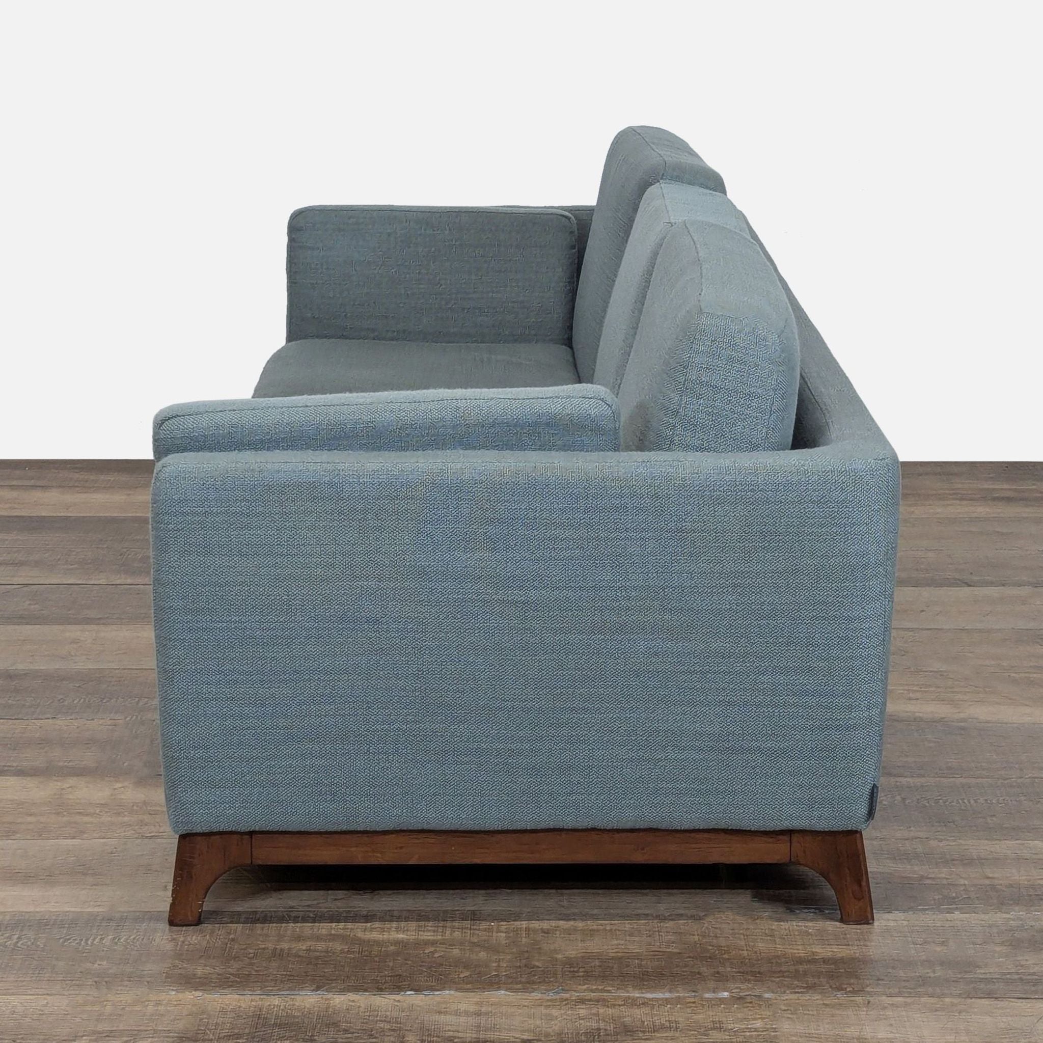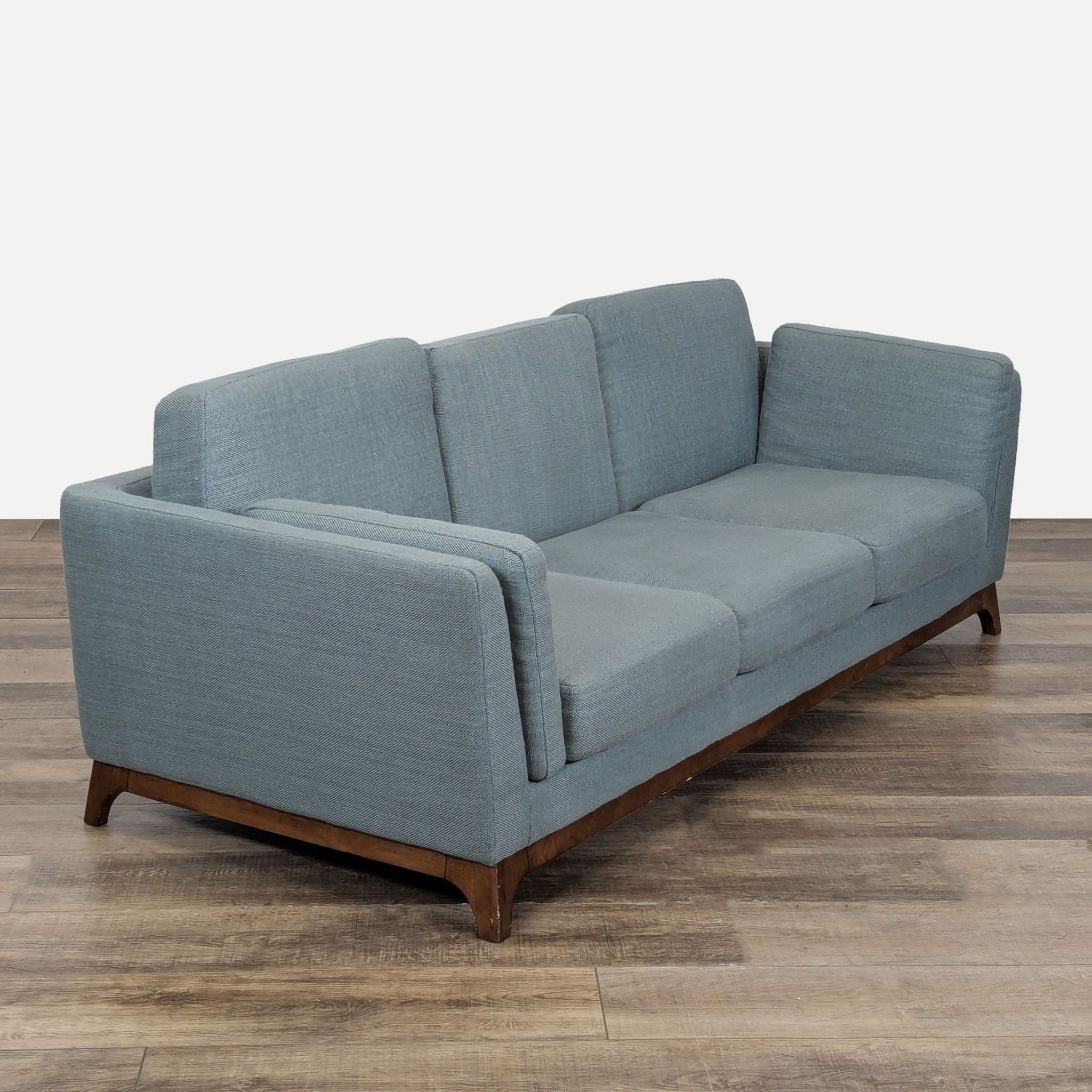 Designed with loose cushions, track arm rests, and a solid wood base.