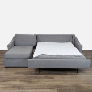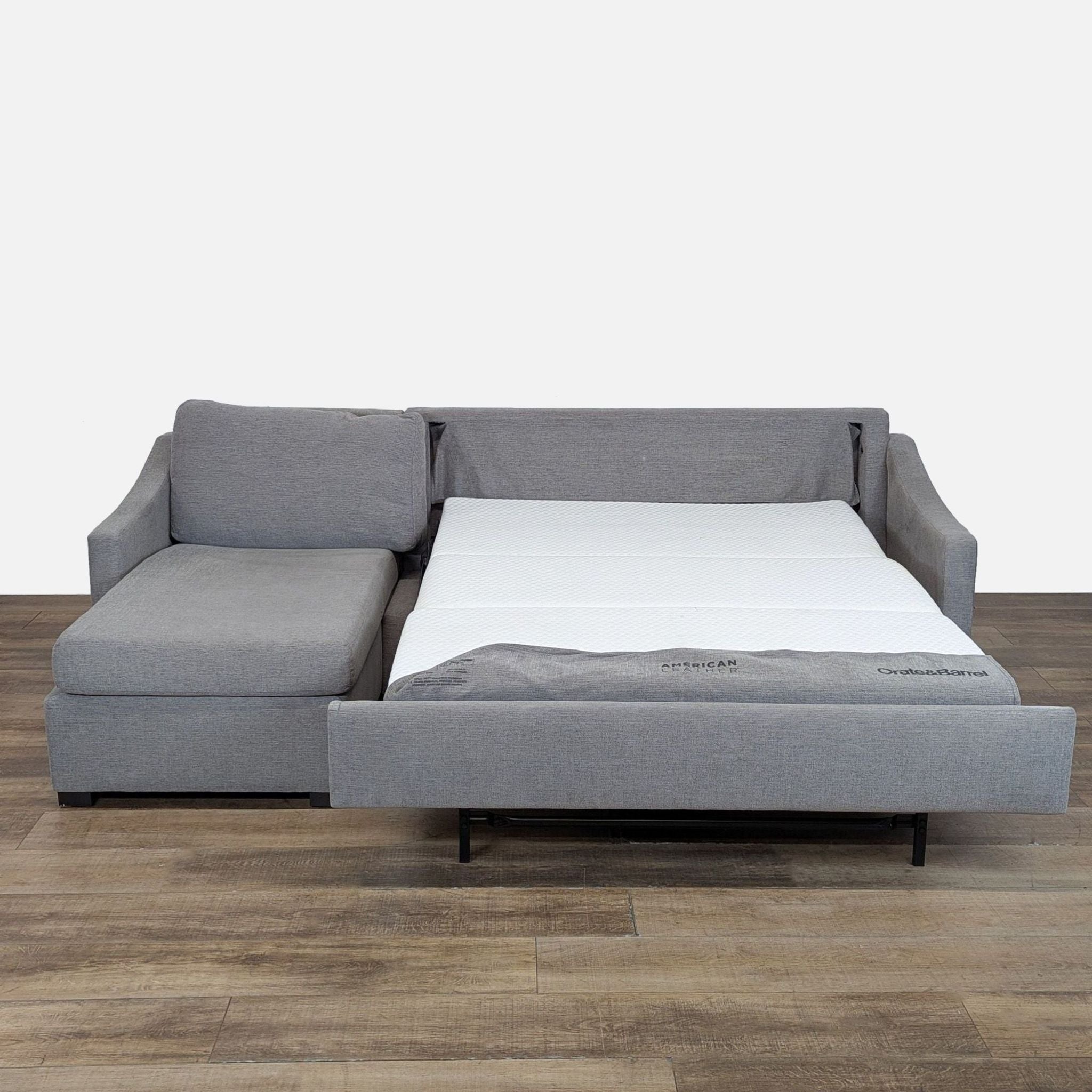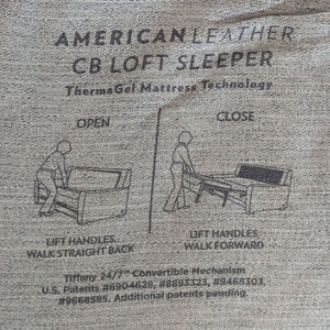 Features slope arms and generous seat and back cushions with a pull out Queen sleeper by American Leather with a gel top mattress and Tiffany 24/7 Sleep System. The sofa is missing a piece for the mattress support that can be ordered, but is needed to be used as a bed. Otherwise excellent condition.