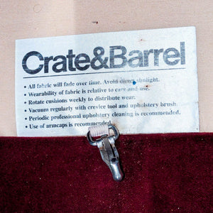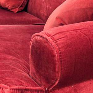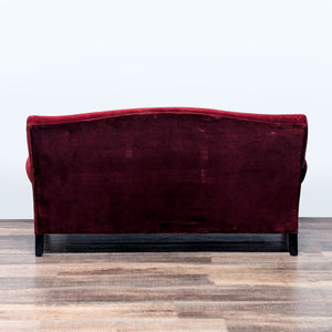Features transitional style with rolled arms, red velvet upholstery and wood feet.