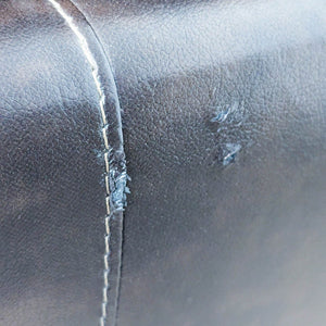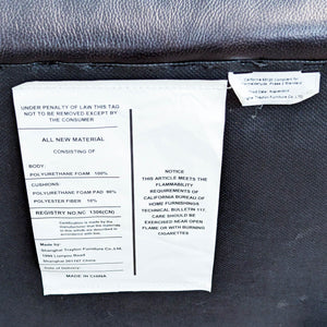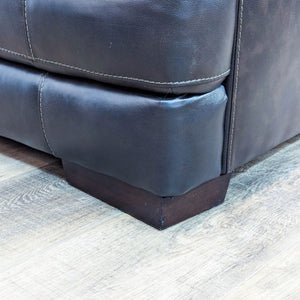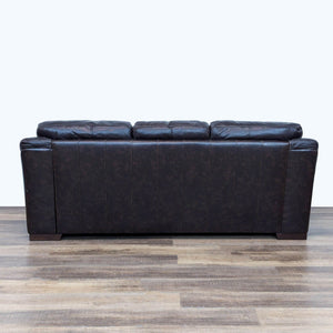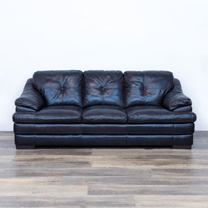 Dark brown leather upholstery with plush cushions, sloped arms and button tufted back cushions.