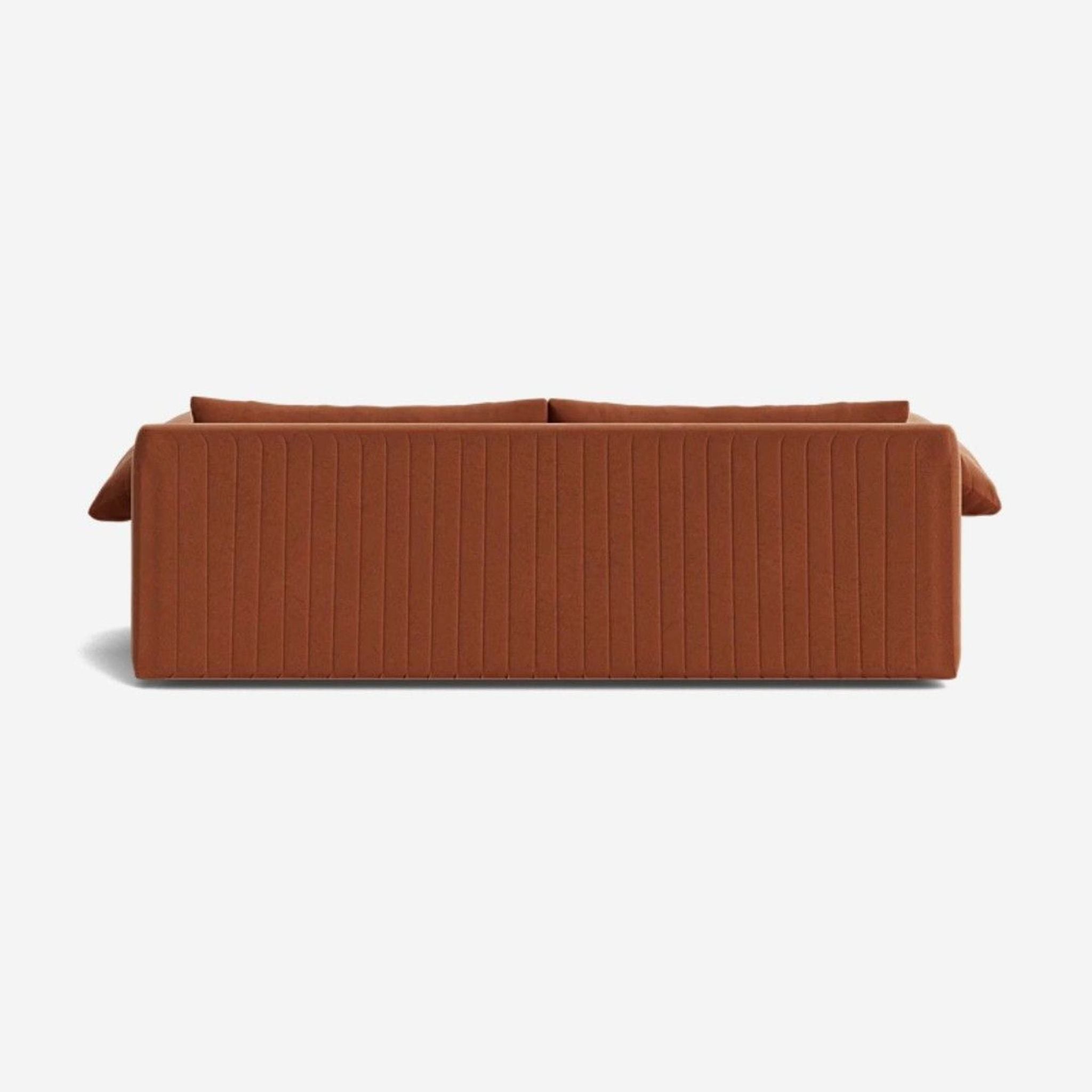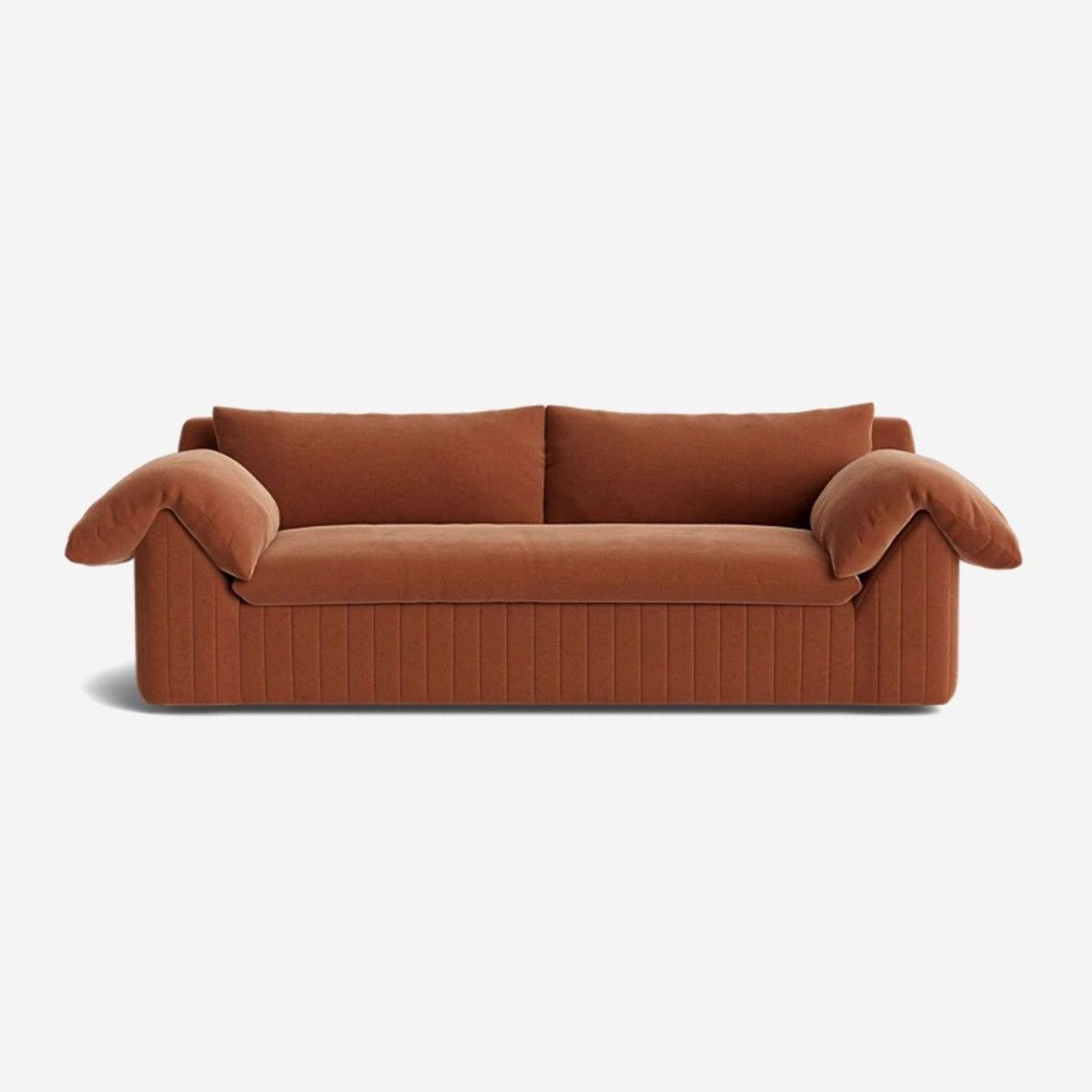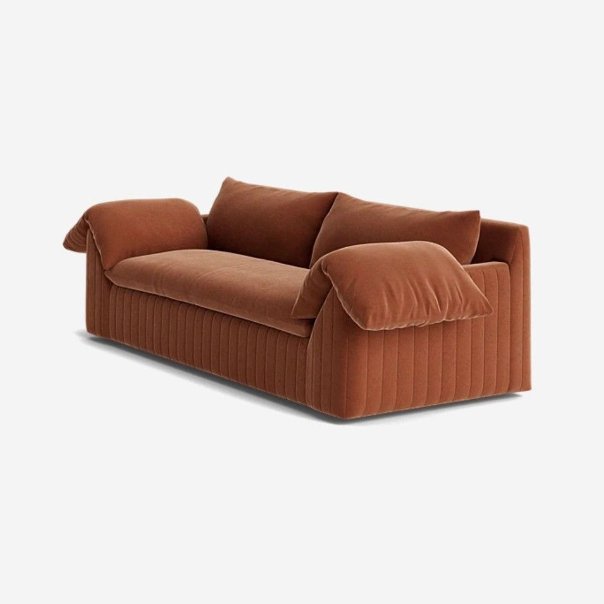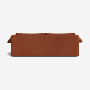 Transitional sofa with bench seat, plush cushioning and channel tufted base. Upholstered in Rose Vintage Velvet.