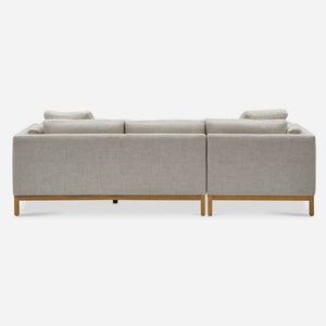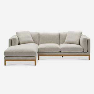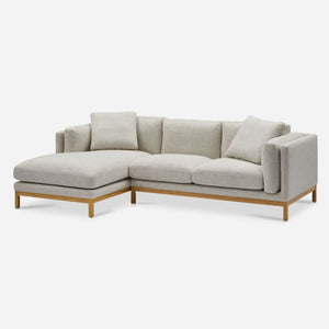 Features wood frame with plush cushions and a right chaise.