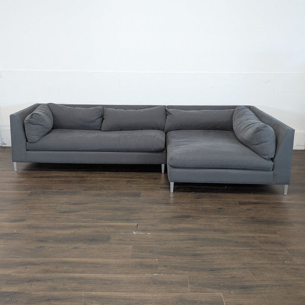 This Ikea sectional features a modern design with a dark blue fabric and a right-side chaise lounge. The sofa has three cushioned seats and light wood legs for a clean look that fits any room. It’s comfortable, sturdy, and perfect for relaxing or entertaining guests. Ideal for small to medium living spaces.