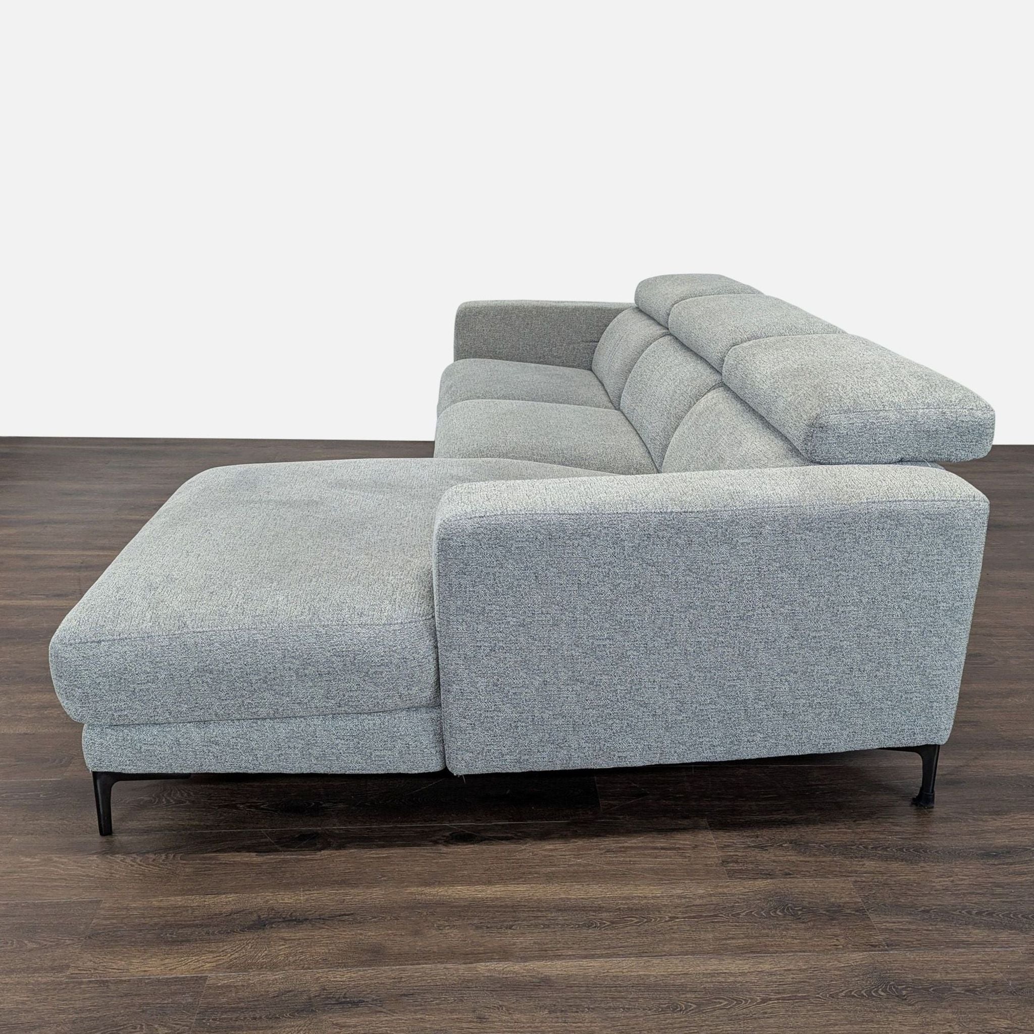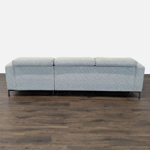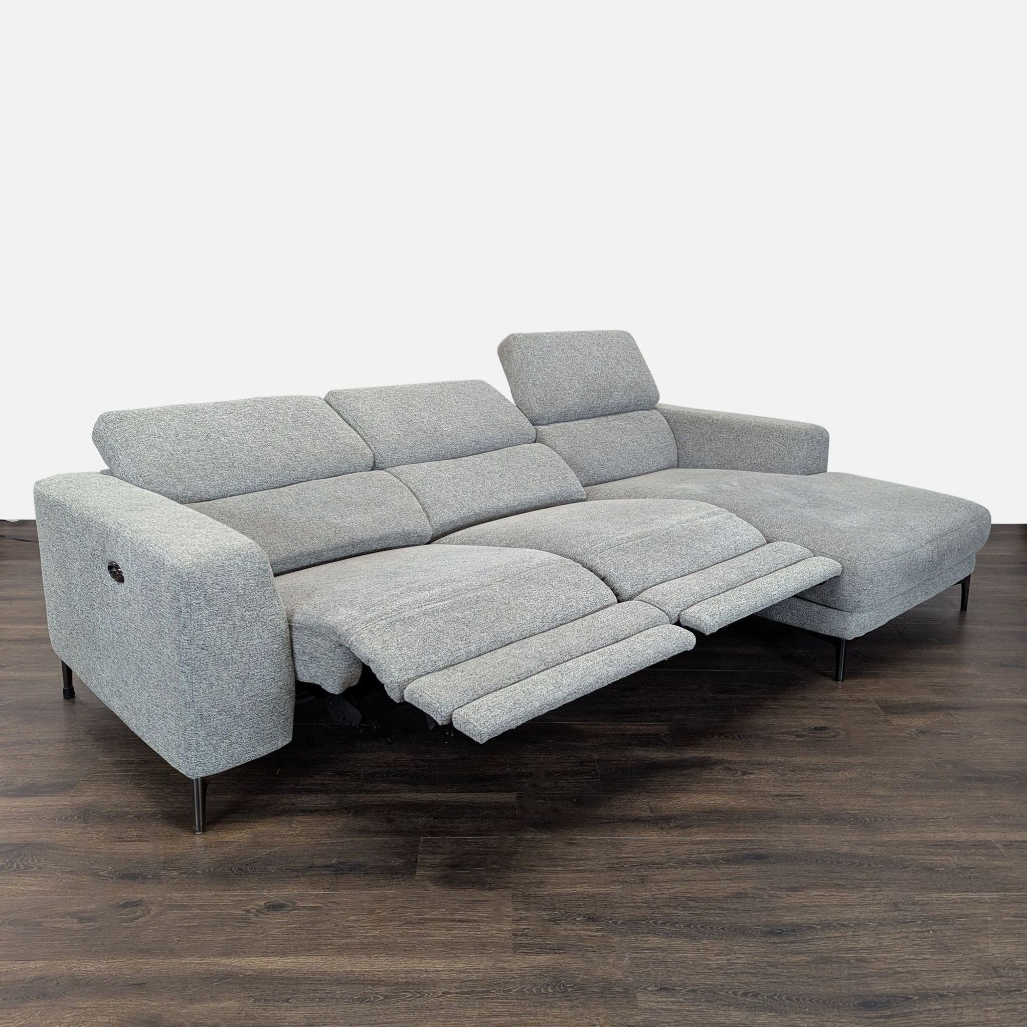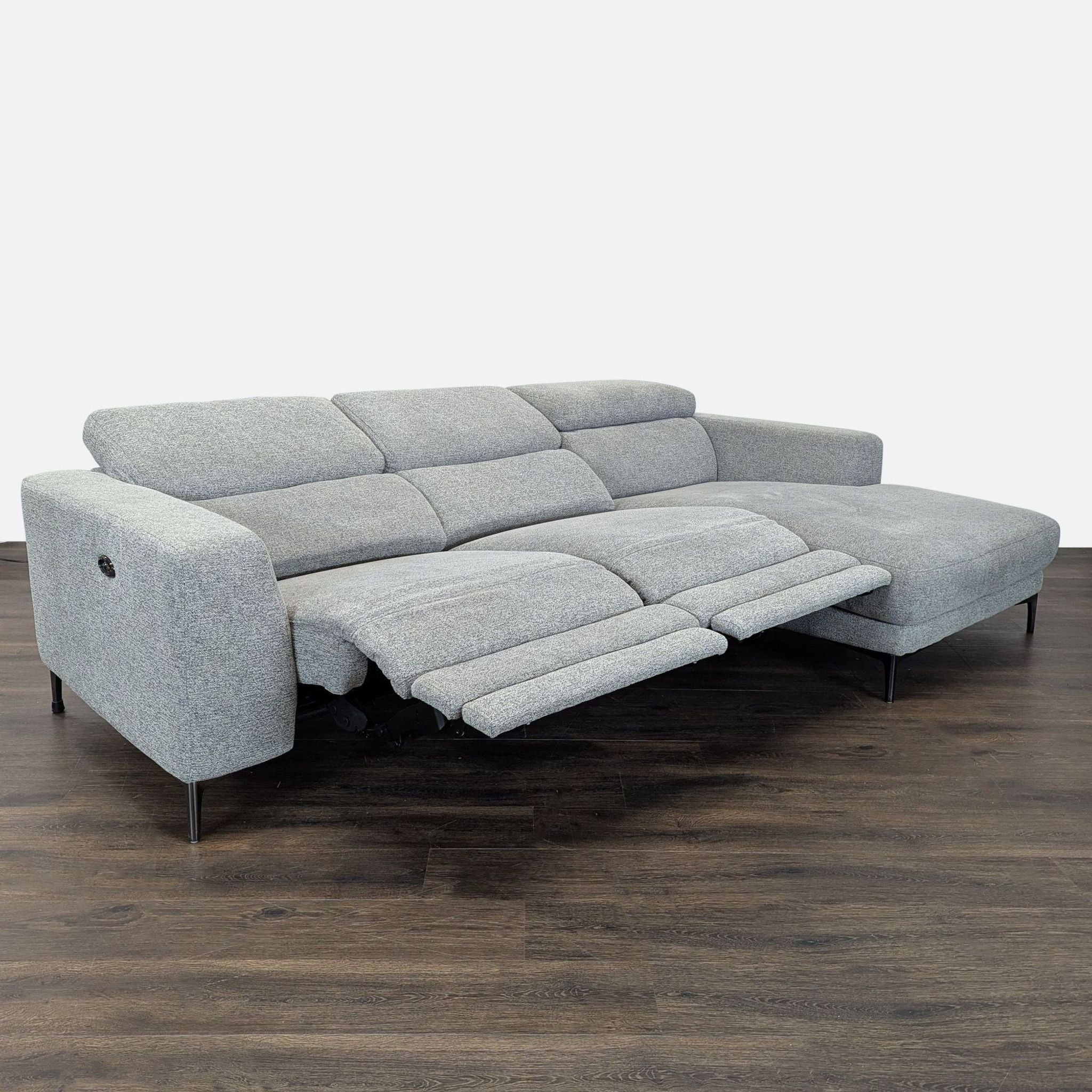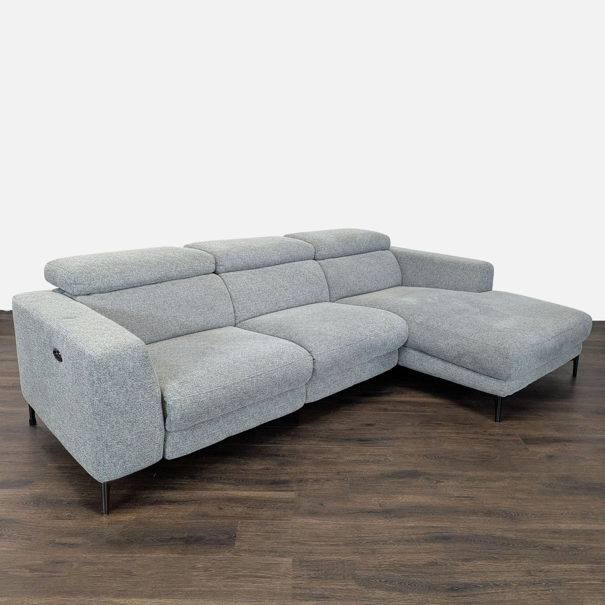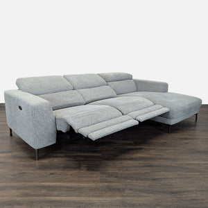 This stylish Living Spaces sectional features a clean, modern design with soft gray upholstery. It includes a spacious chaise for relaxation and adjustable power recliners for maximum comfort. Perfect for family rooms or living spaces, it offers both style and functionality, making it a great choice for any home.