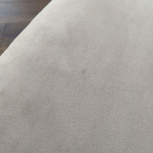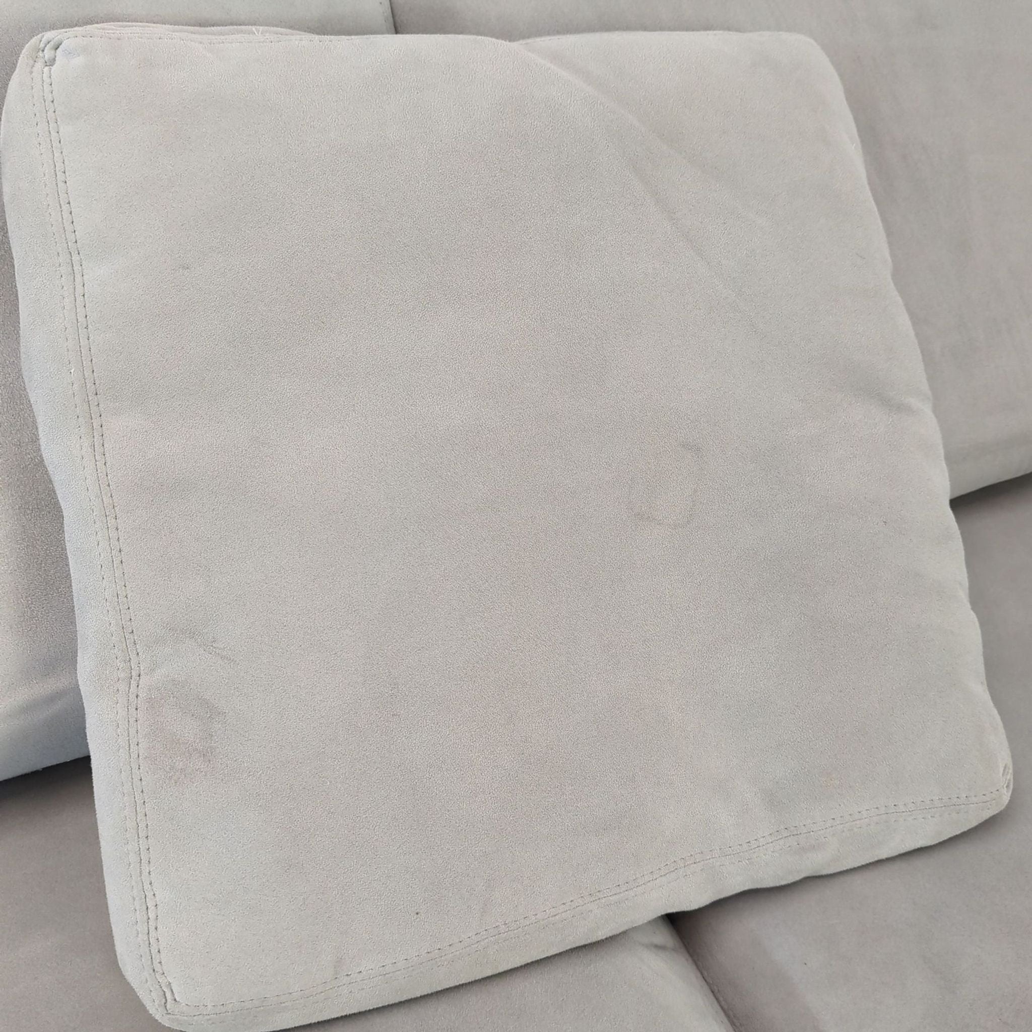 This Room and Board sectional sofa features a modern design in a versatile light gray color. It features a spacious chaise lounge and provides comfortable seating with three large back cushions and two matching accent pillows. Perfect for relaxing or entertaining, this sectional adds style and comfort to any living space.