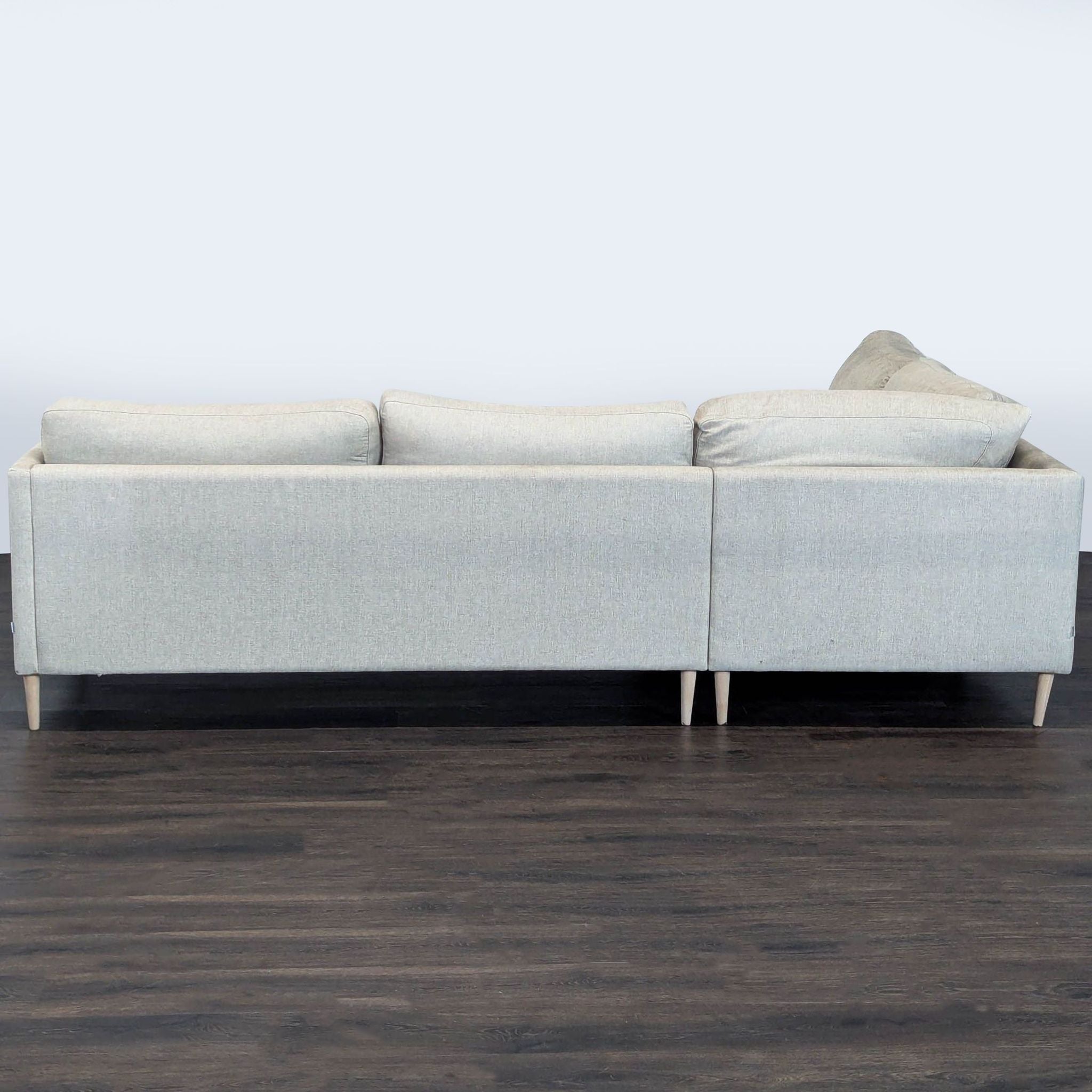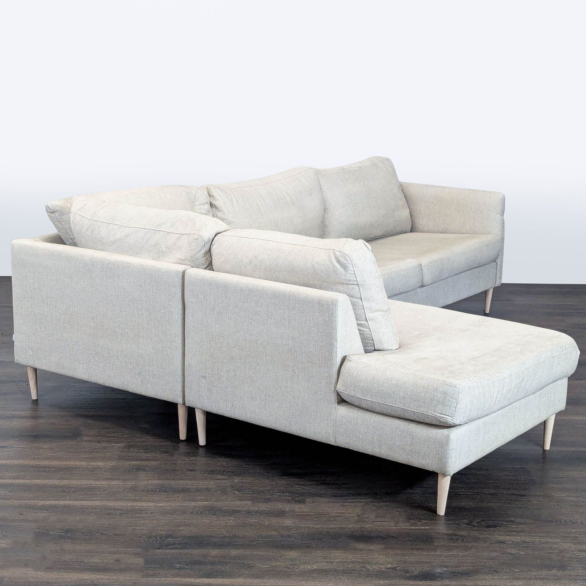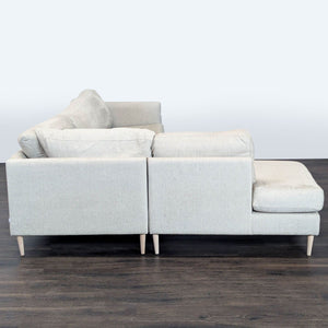 This BoConcept sectional features a modern design in a cream fabric, perfect for any living room. It includes a spacious chaise for extra comfort and relaxation. The sofa has clean lines, supportive back cushions, and sleek wooden legs. Great for seating multiple people and fitting different decor styles. Well-made and comfortable—ideal for everyday lounging.