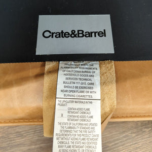 This Crate & Barrel 3-seat sofa features soft tan leather upholstery and a modern, boxy design. The sofa offers comfortable seating with plush cushions and sturdy black legs. Perfect for living rooms or offices, it combines style and comfort for any space. Good condition with minor signs of use.
