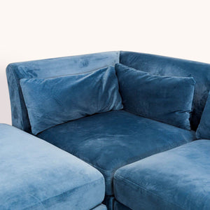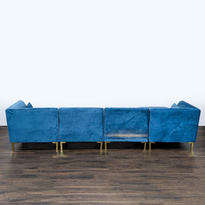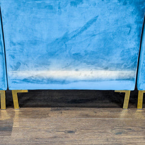 Add a touch of style and comfort to your living space with this modern blue velvet sectional. The soft upholstery, plush cushions, and gold metal legs make it a perfect choice for relaxing or entertaining guests. Spacious seating and a sleek design suit any contemporary home.