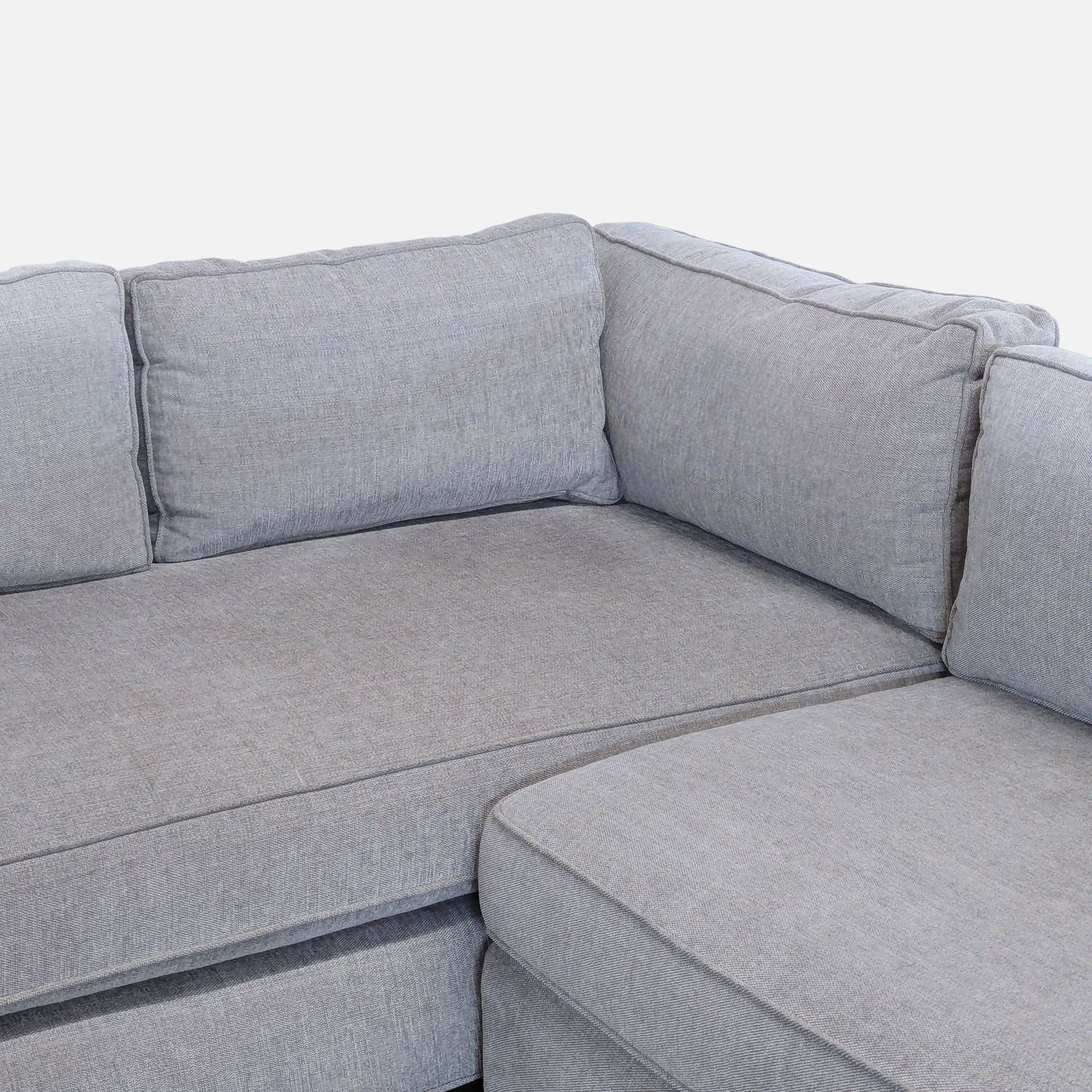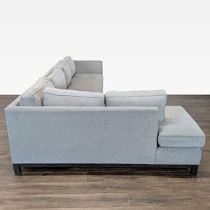 This Mitchell Gold + Bob Williams sectional offers a sleek, modern look in a versatile gray fabric. It features deep seating, plush back cushions, and a spacious chaise for extra comfort. Perfect for any living space, this sectional is both stylish and practical. Well-cushioned and sturdy, it provides plenty of room for relaxing or entertaining.