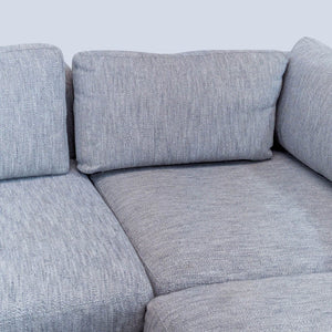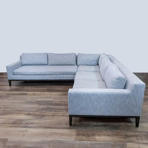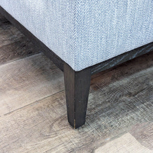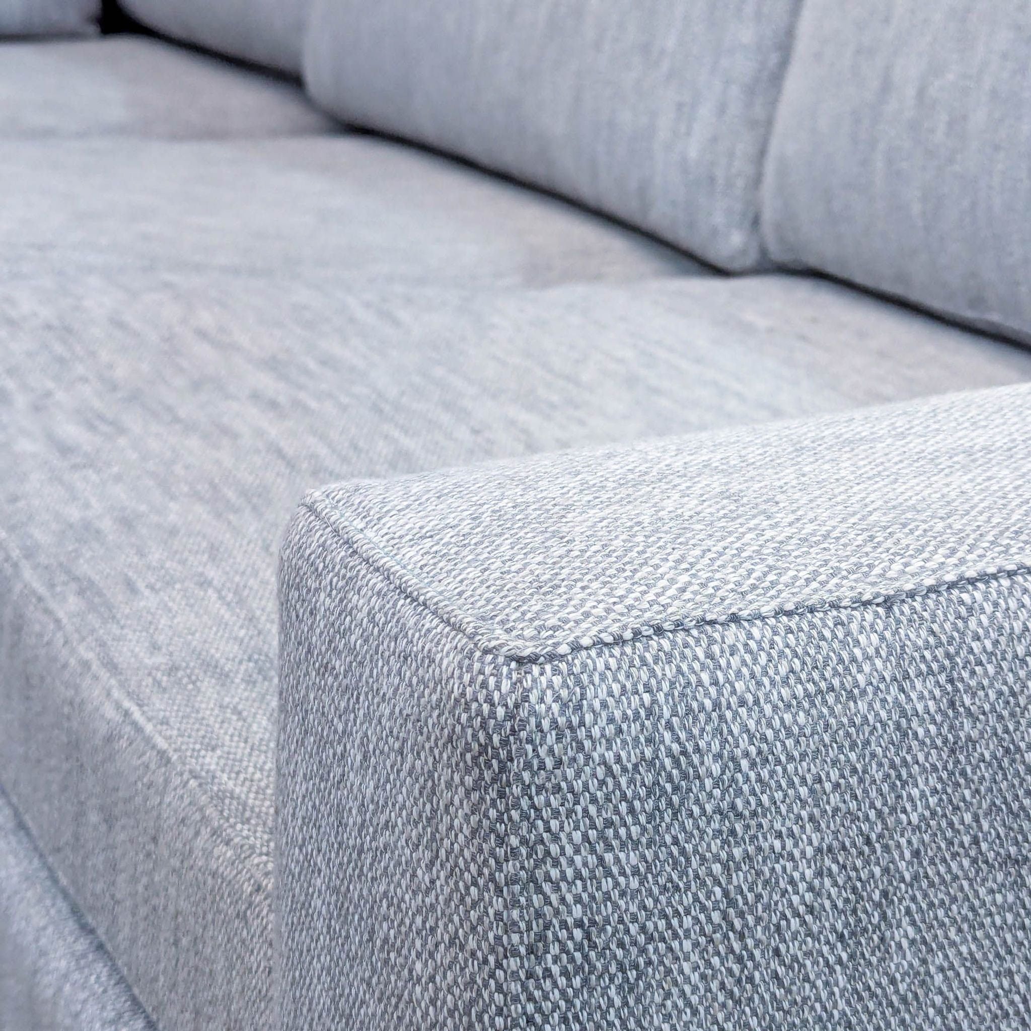 Features a streamlined frame that sits elevated atop a slim oak wood base with track arms and textured weave fabric upholstery.