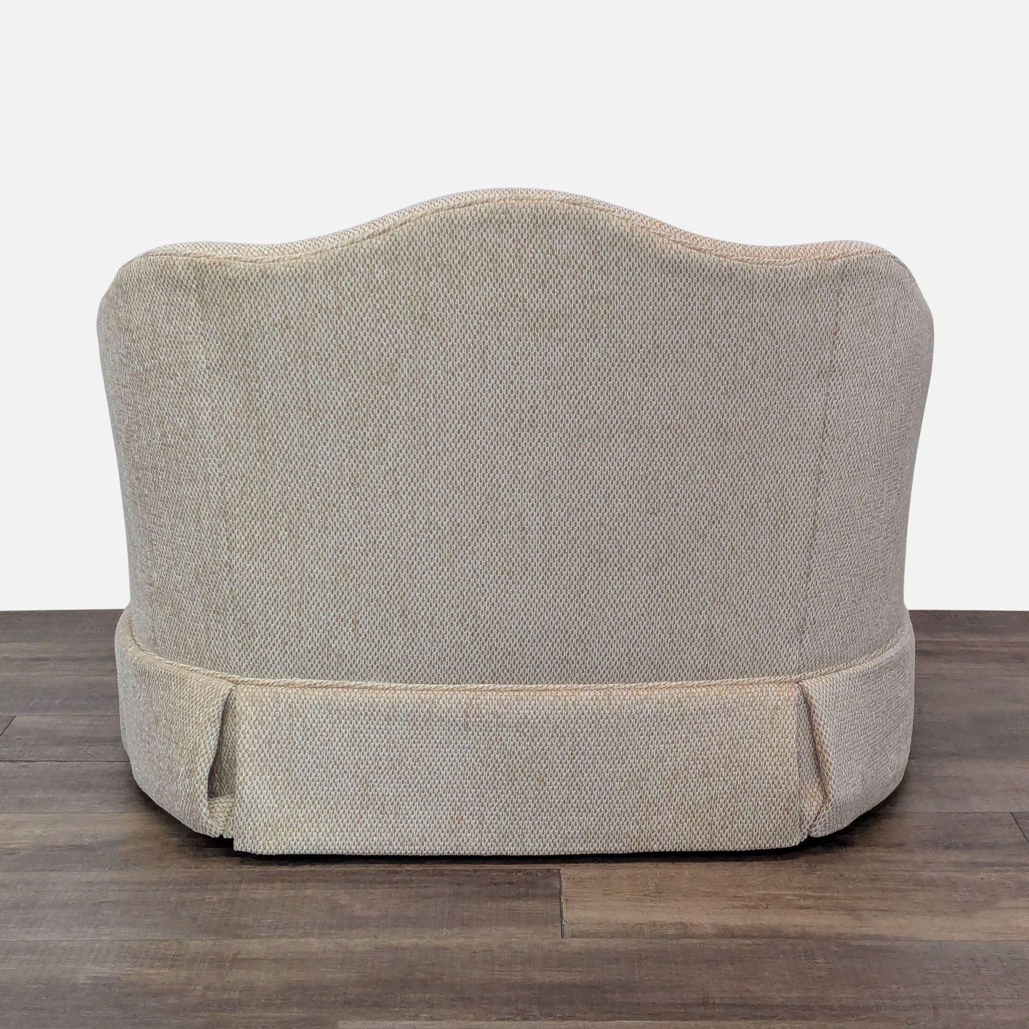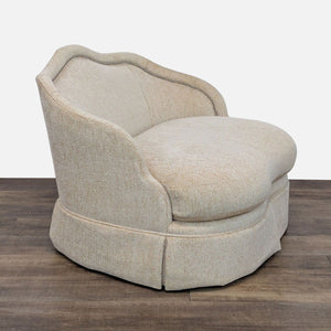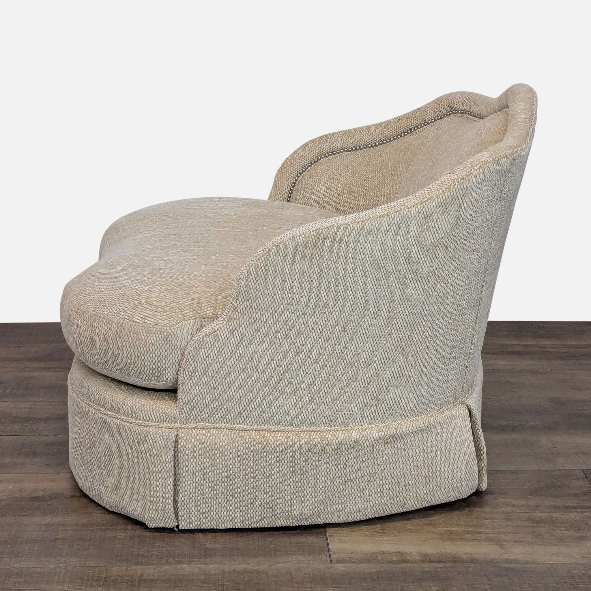 This lounge chair features scalloped edges with nailhead trim and sits on a 360 degree swivel base.