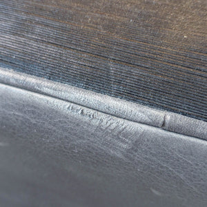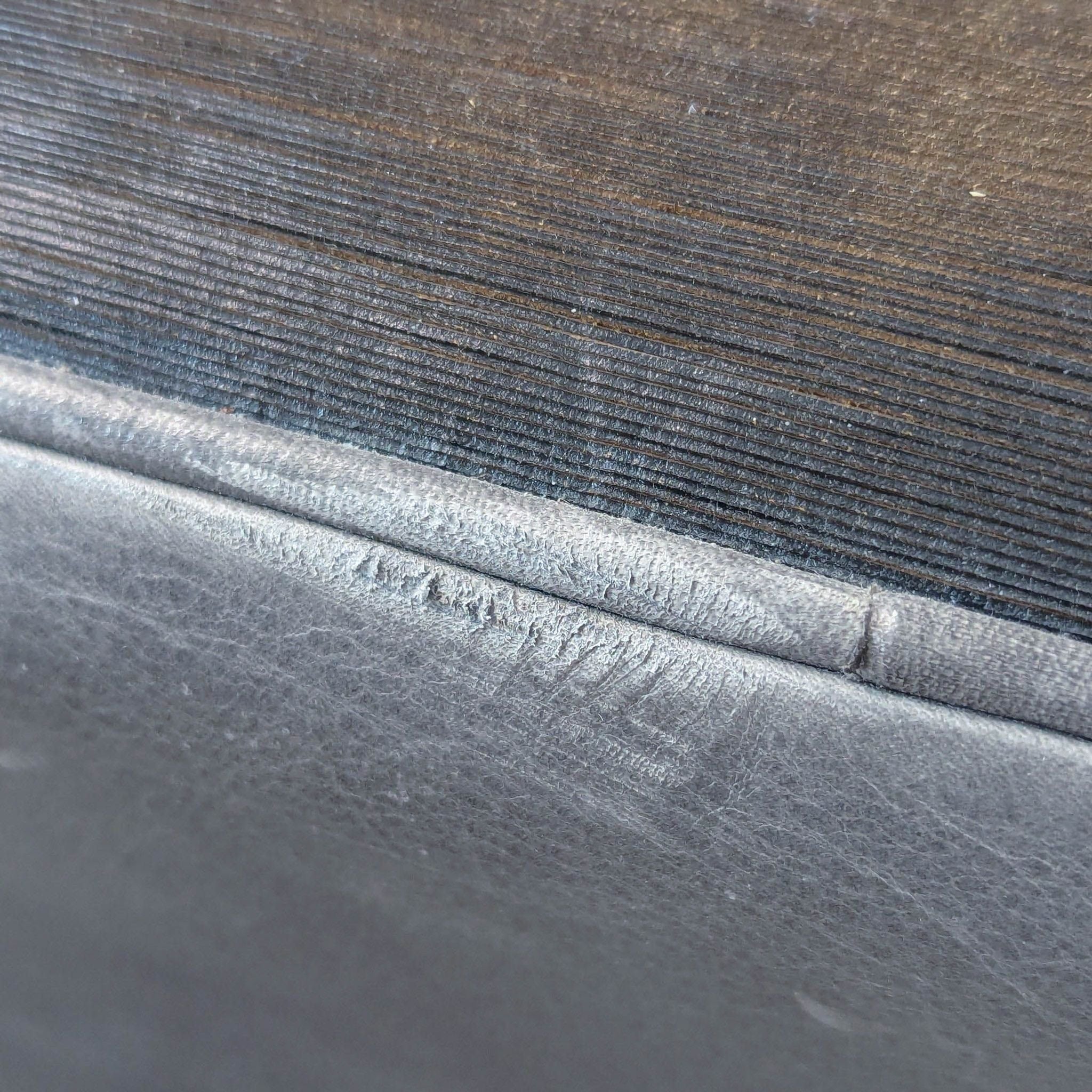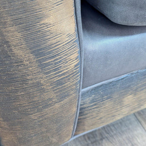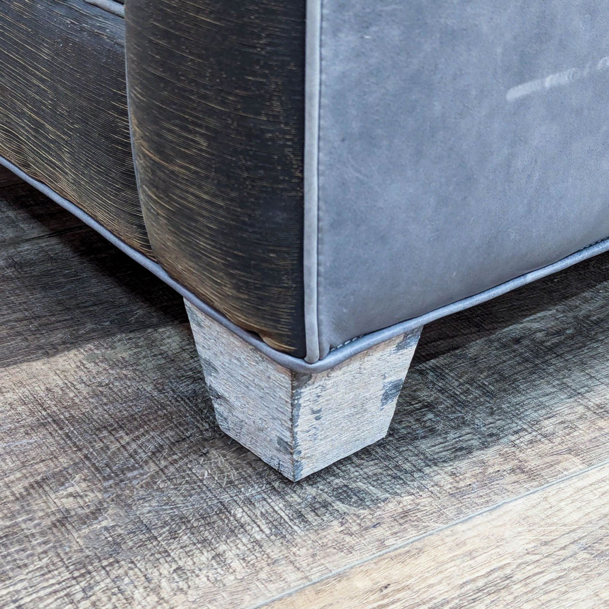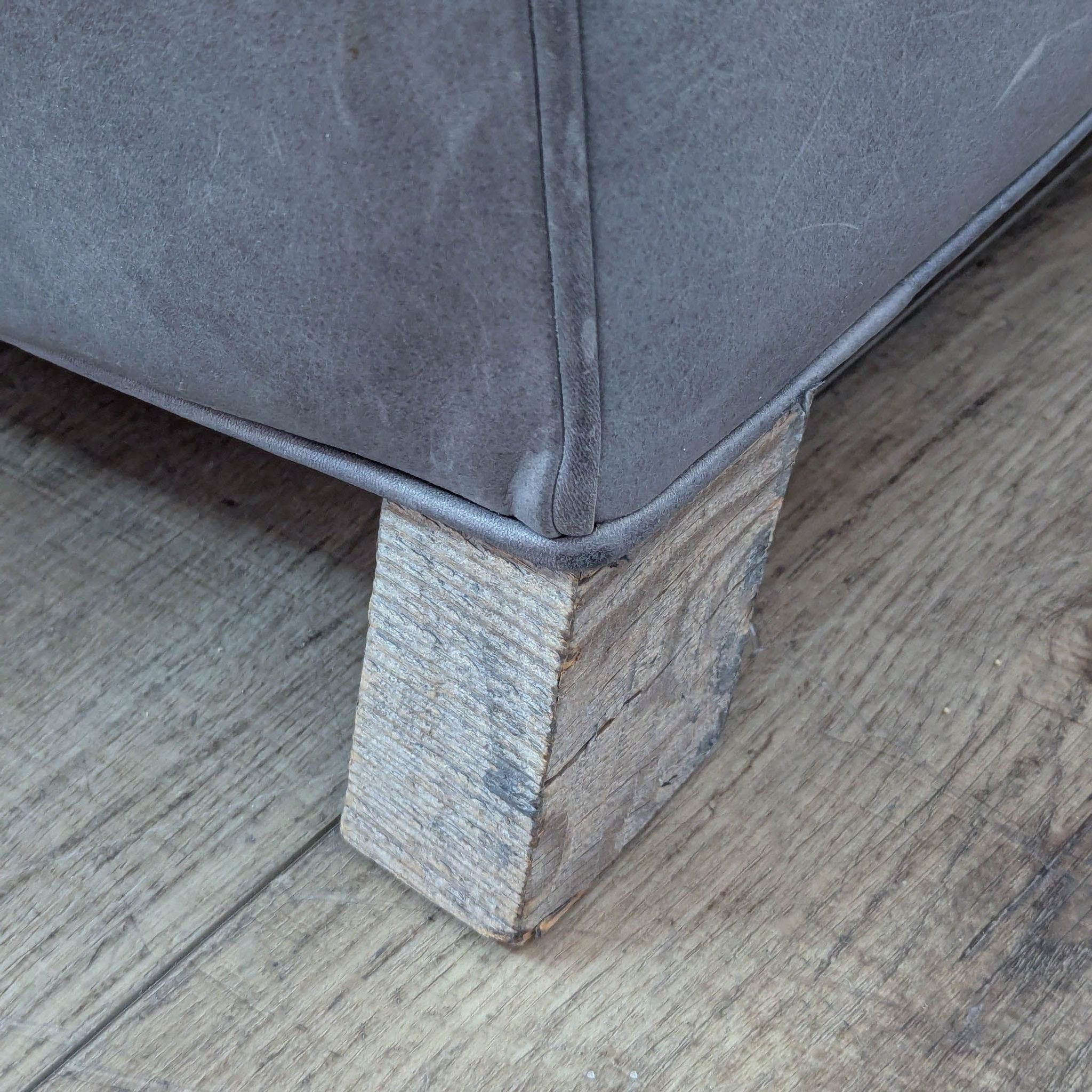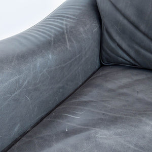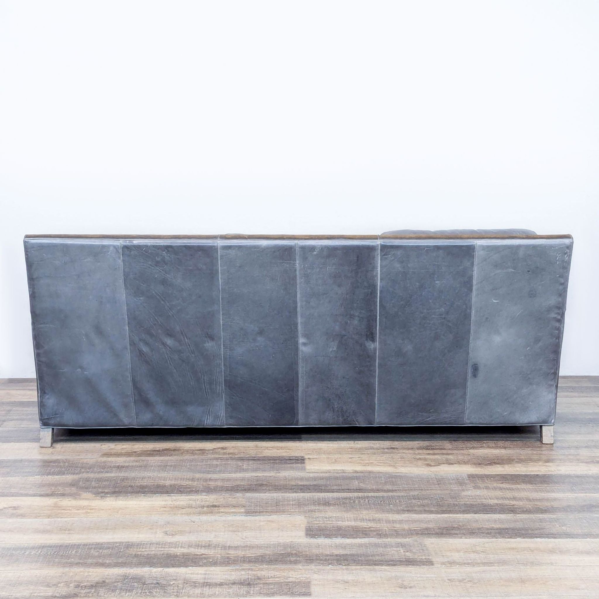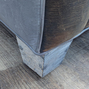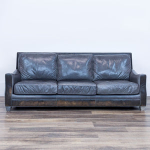 This Menlo Park Sofa features distressed leather with loose cushions and tapered wood feet.