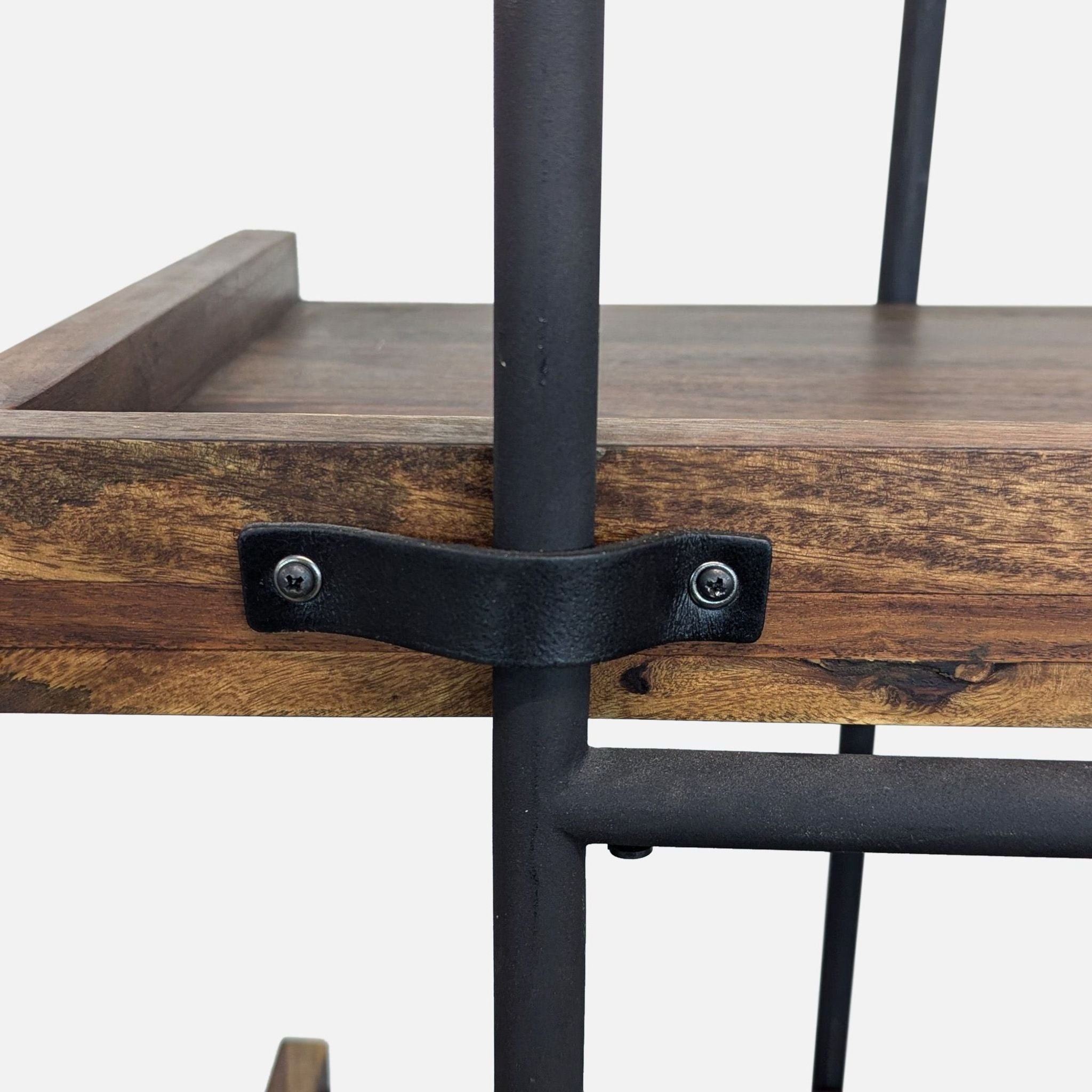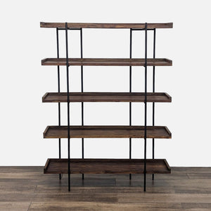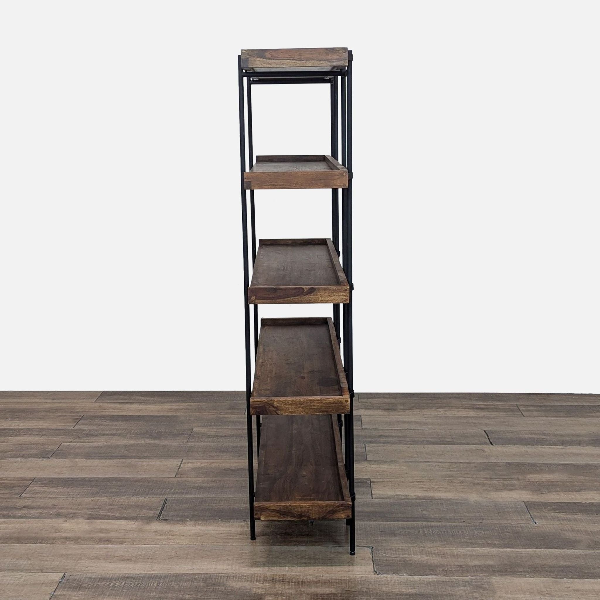 Gallery shelves of solid richly grained mango wood float on a slim open iron frame finished in black.