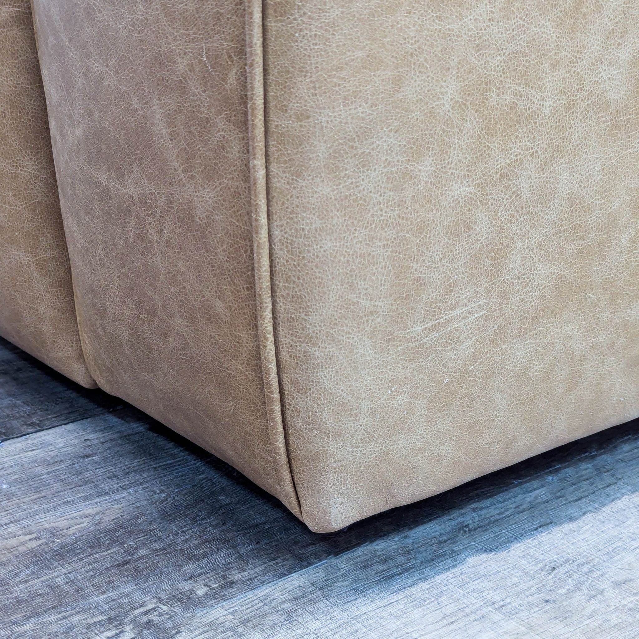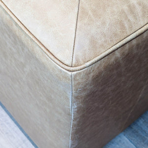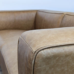 Upholstered in top grain buffalo leather with low profile, bench seat cushion and thick cushions.