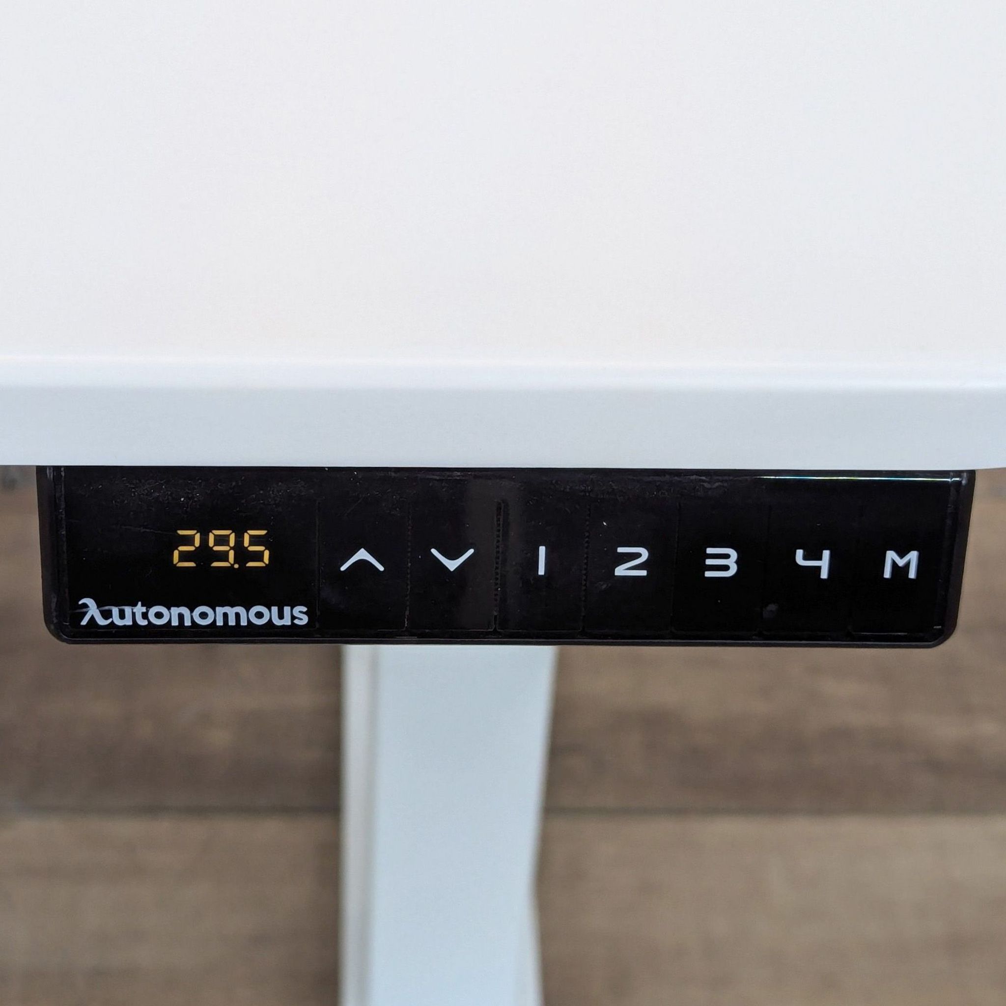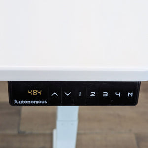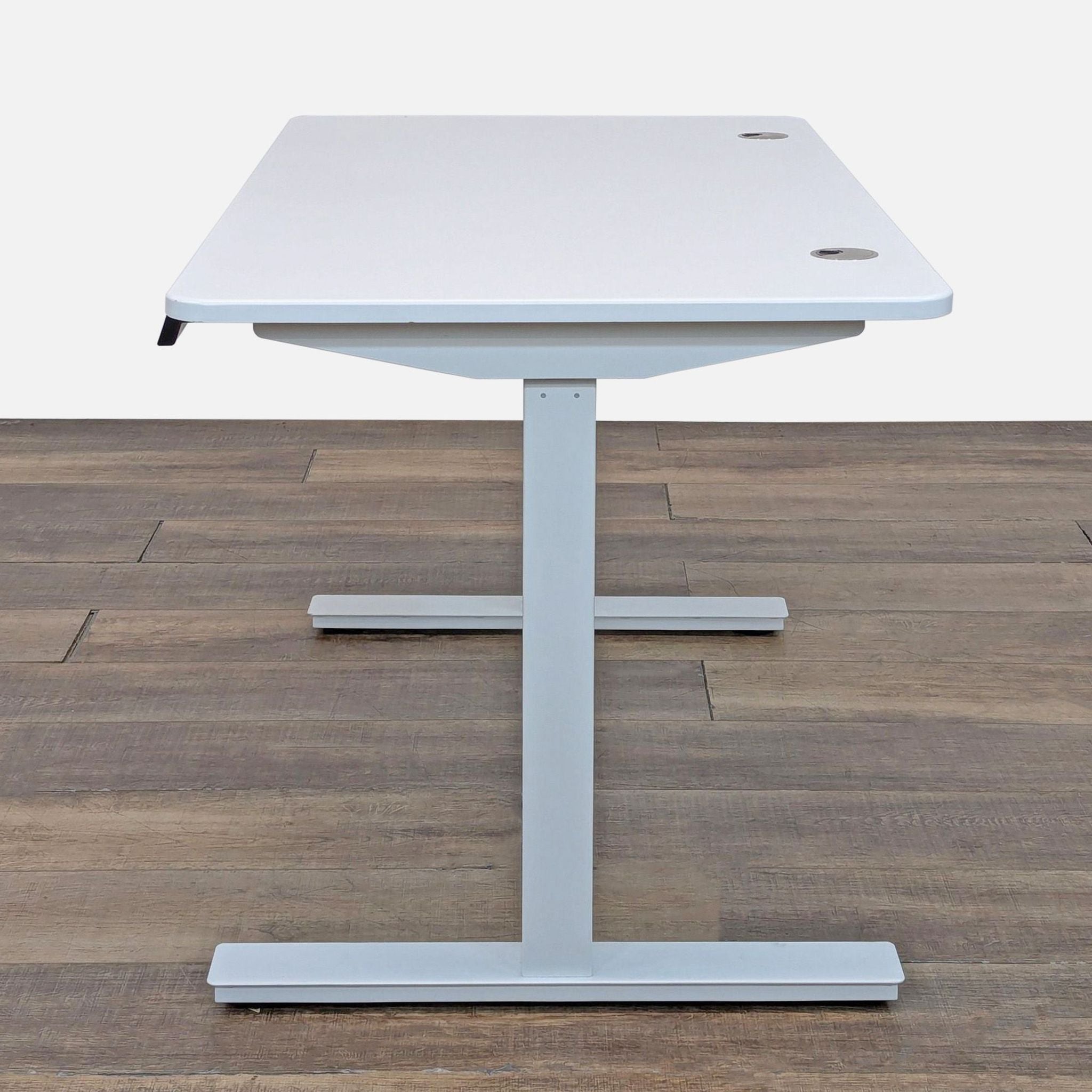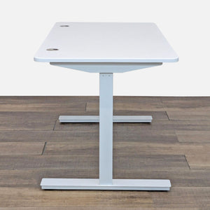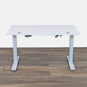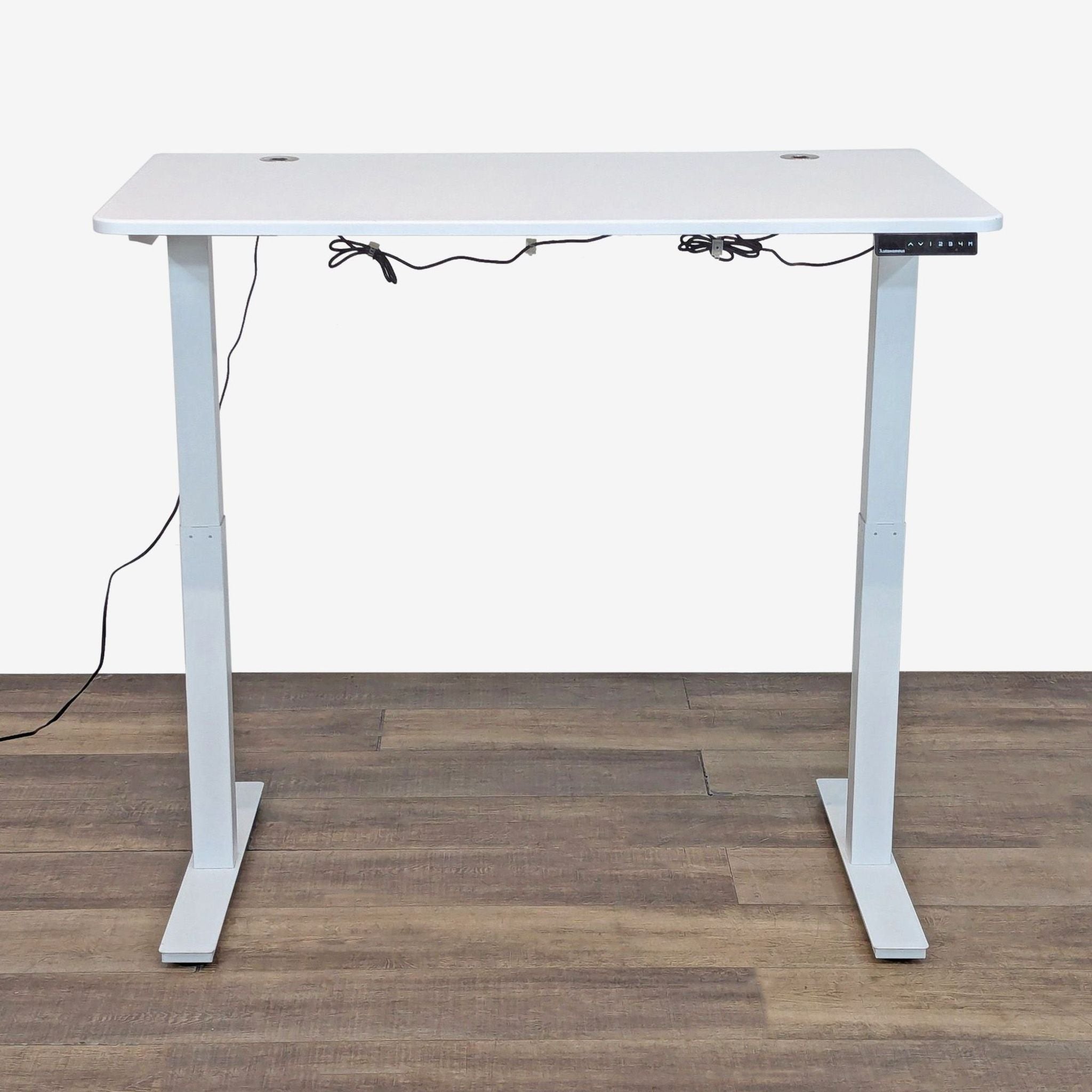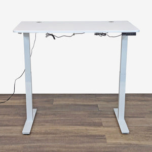 Adjustable height desk with metal T legs, white laminate top with cord management and a programmable remote.