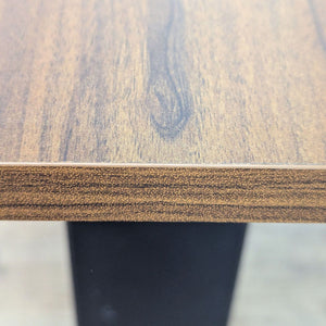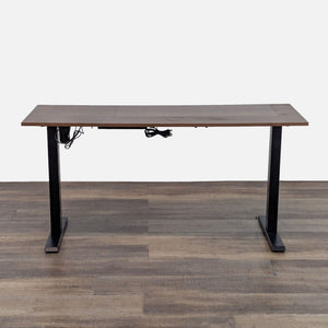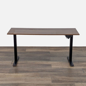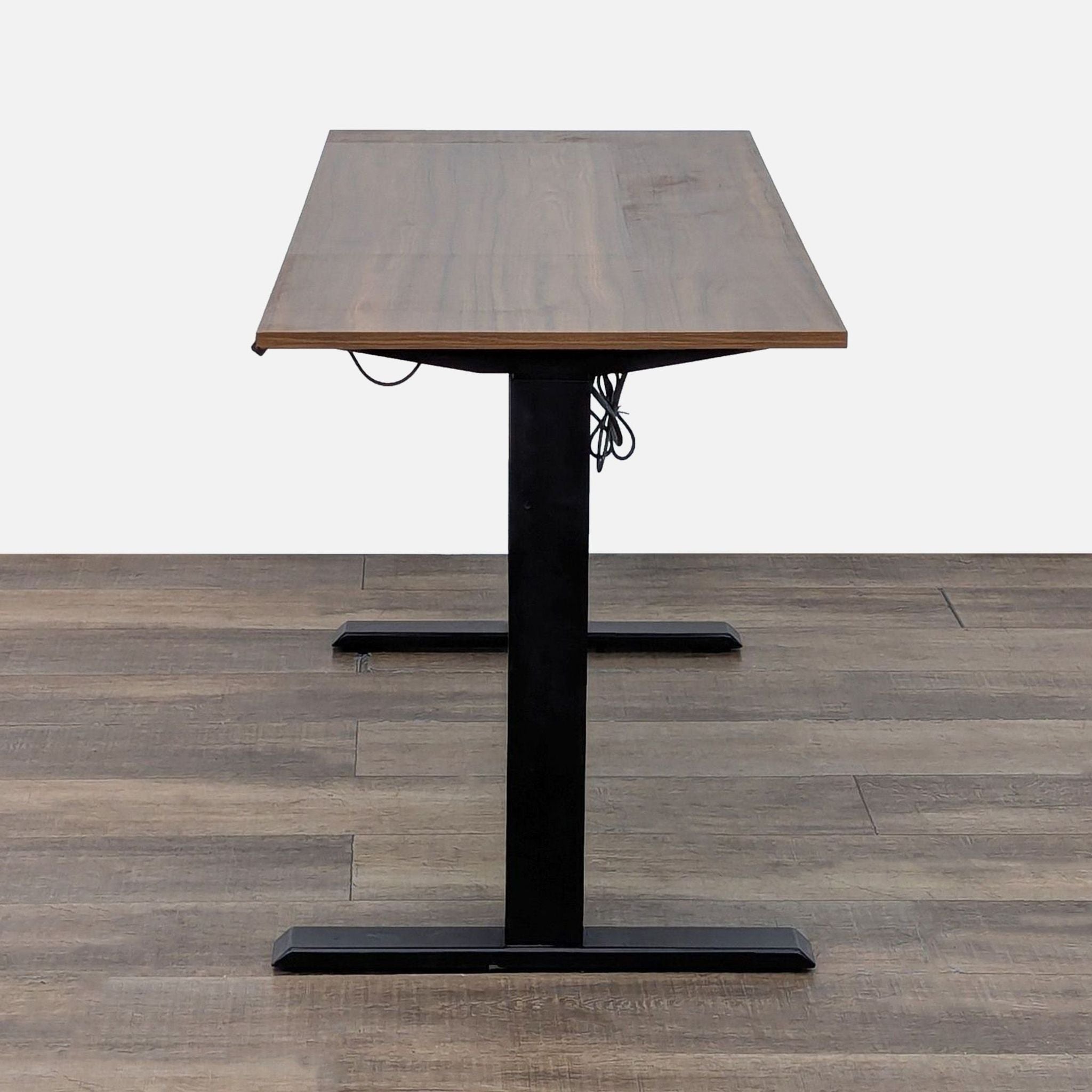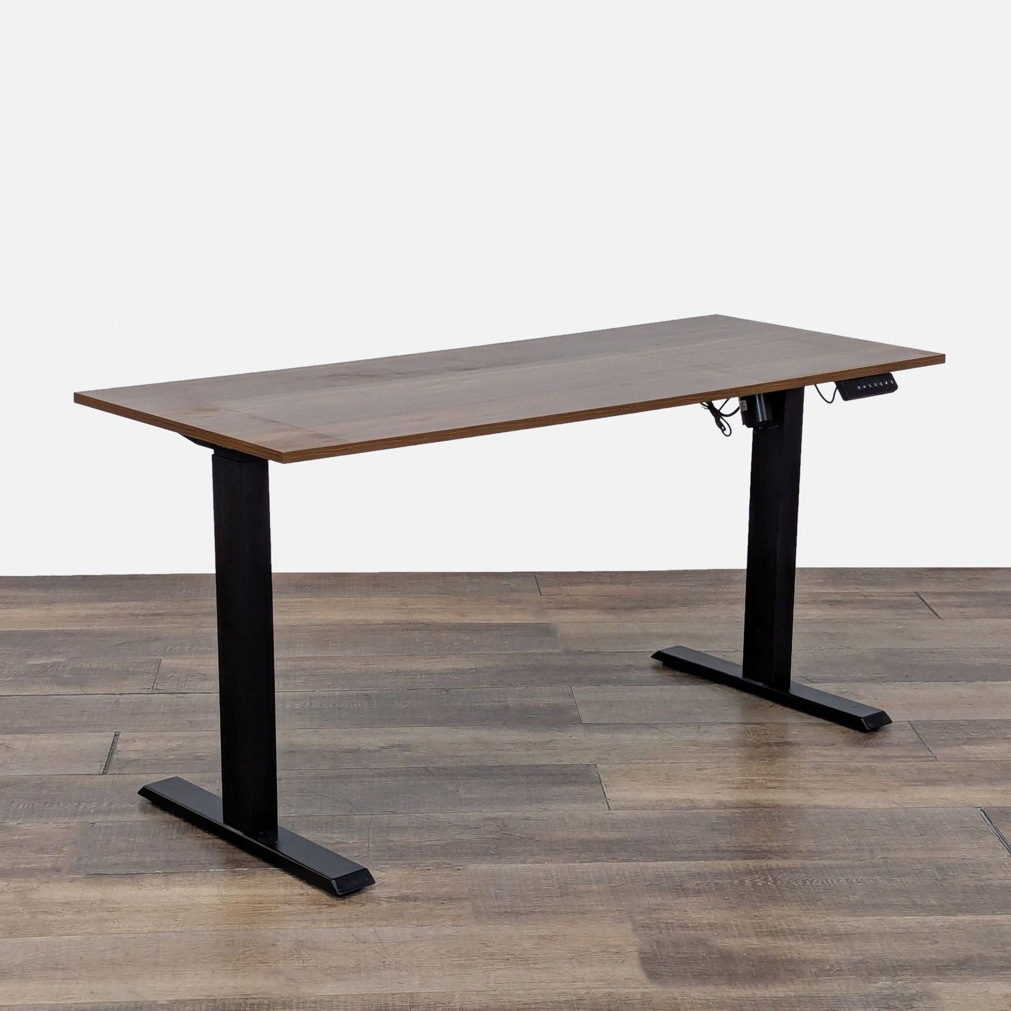 Adjustable programmable standing desk with laminate wood grain top and black metal base.