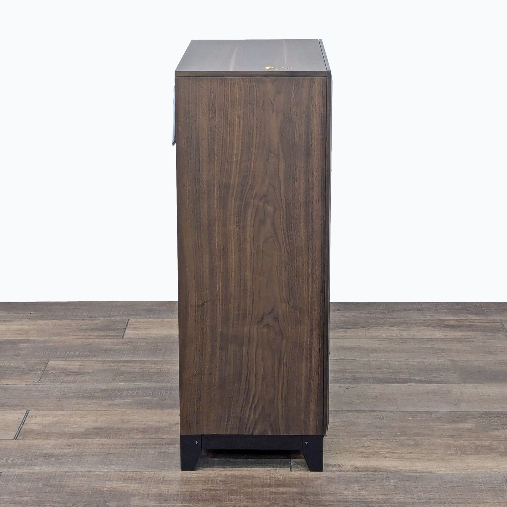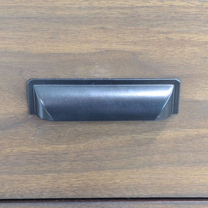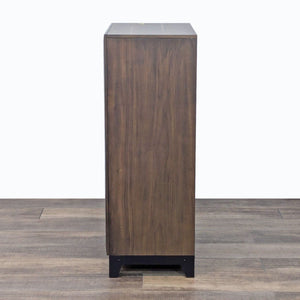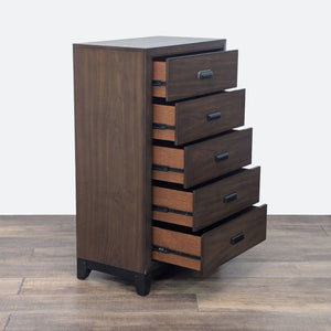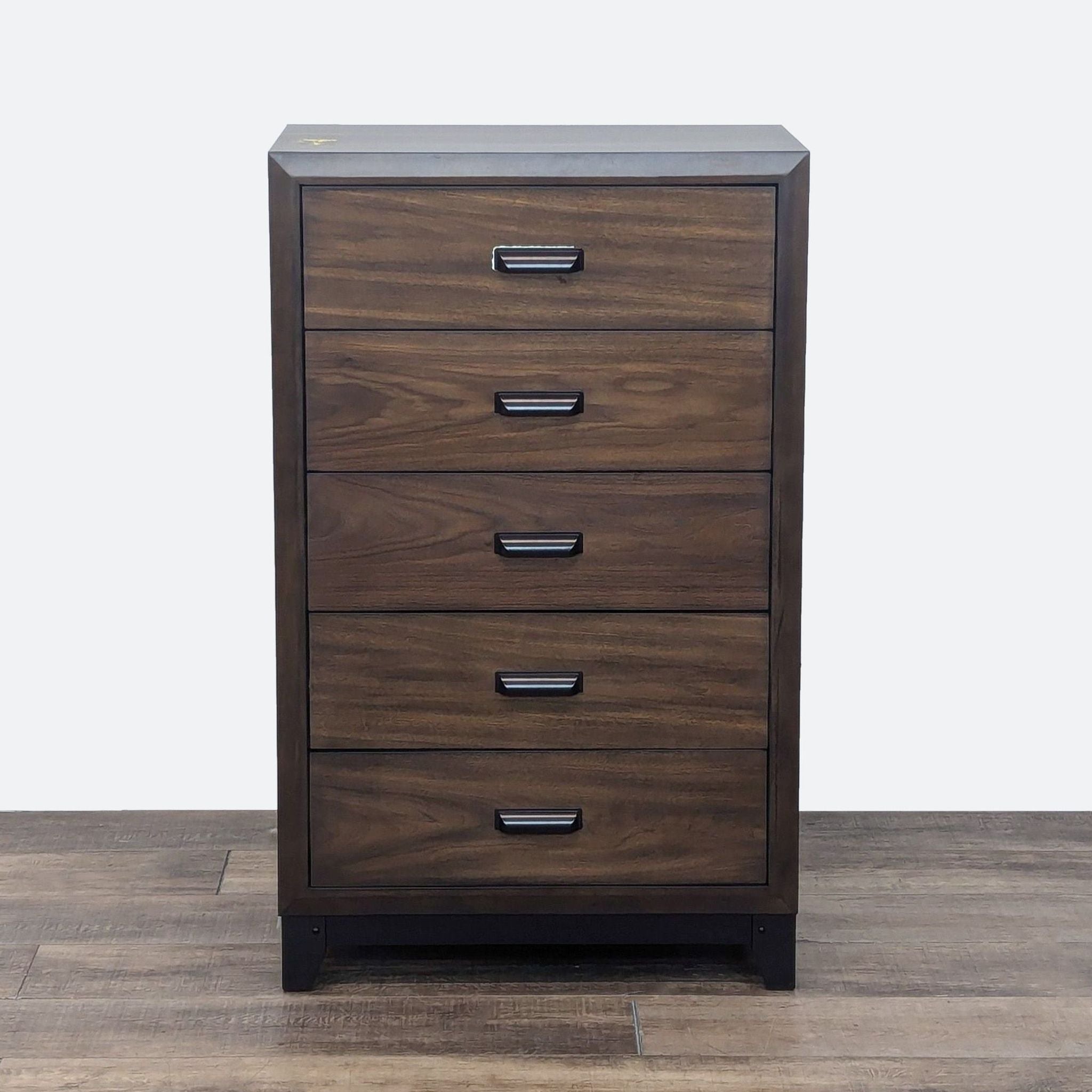 This dresser by Cory features two toned wood with five drawers on metal glides and metal cup pulls.